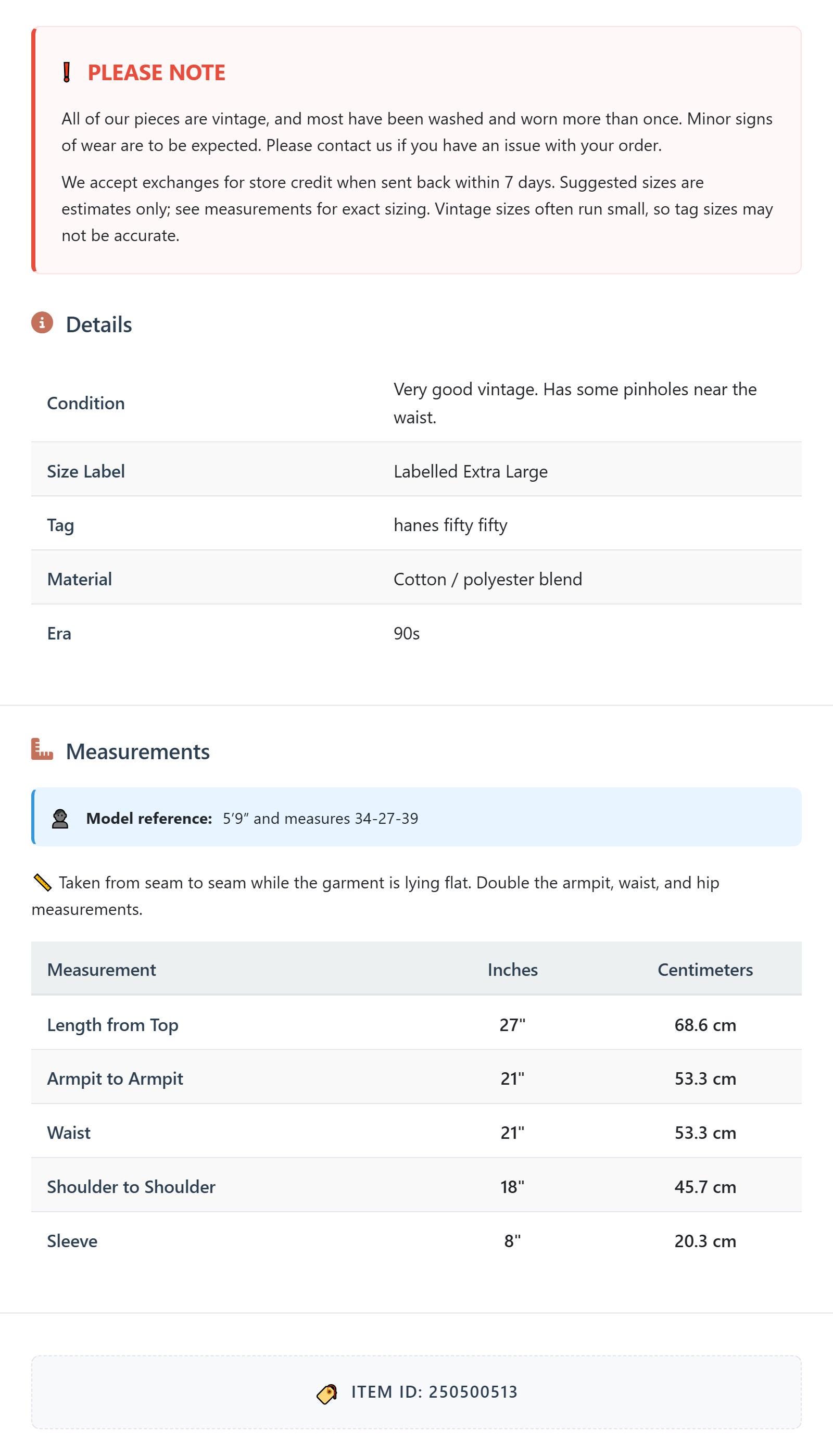 All of our pieces are vintage, and most have been washed and worn more than once. Minor signs of wear are to be expected. Please contact us if you have an issue with your order. We accept exchanges for store credit when sent back within 7 days.
