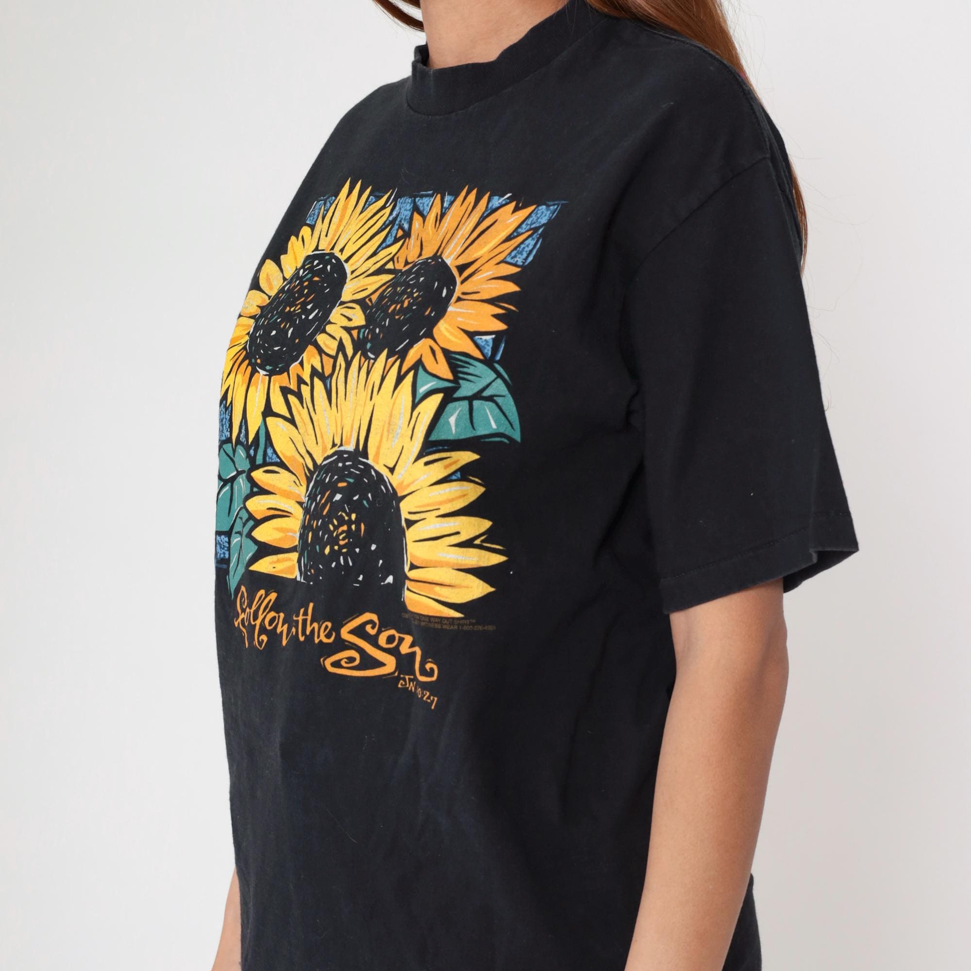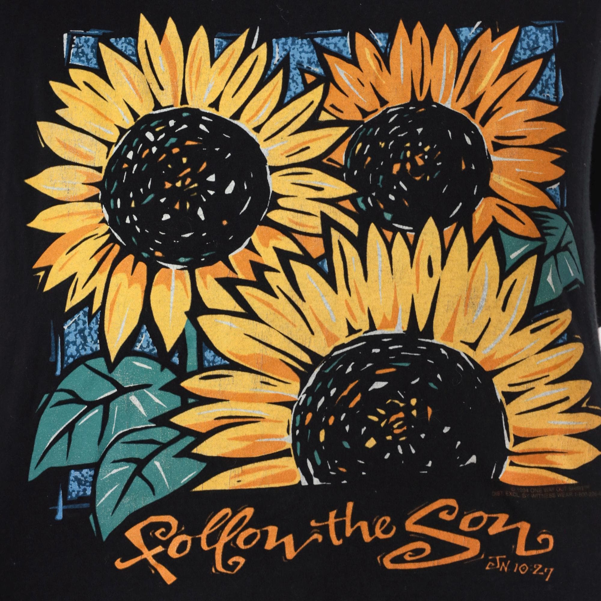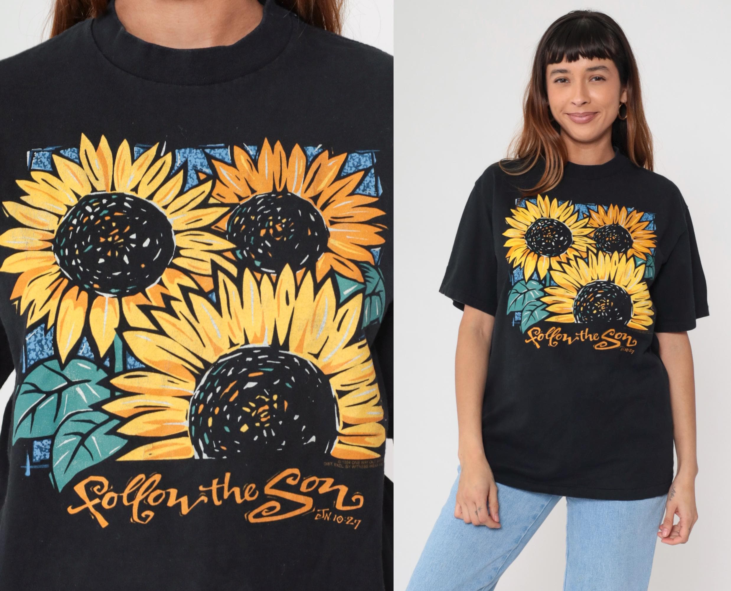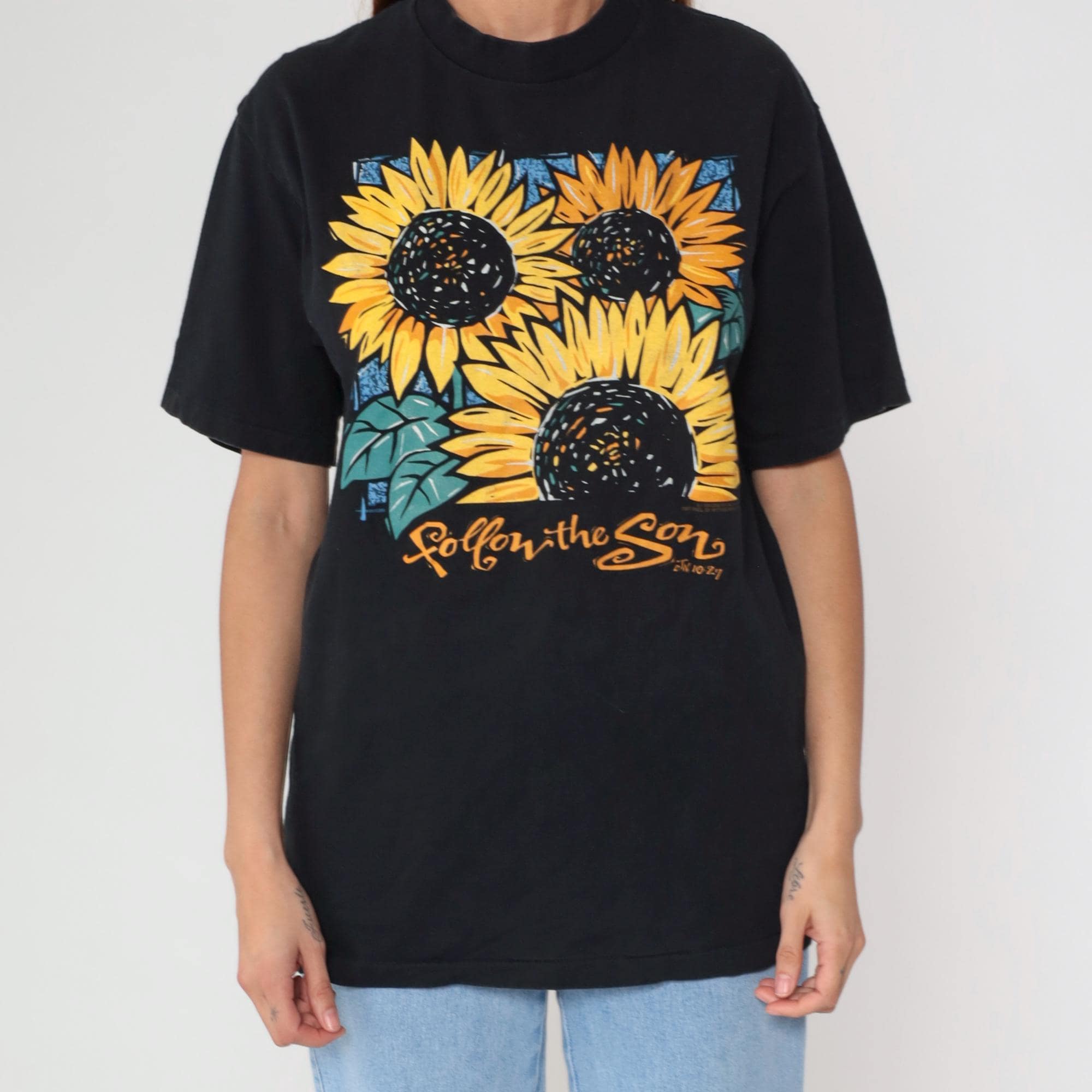 90s black t-shirt featuring bright yellow sunflowers with teal leaves against blue background. Christian message "Follow the Son" with Bible verse reference.