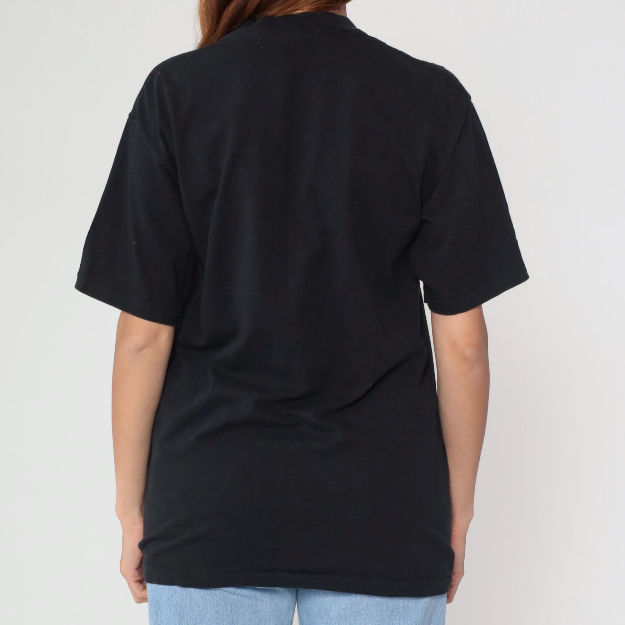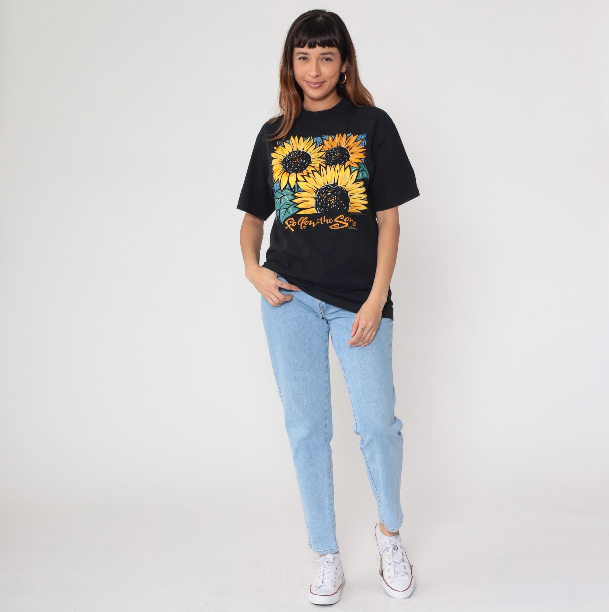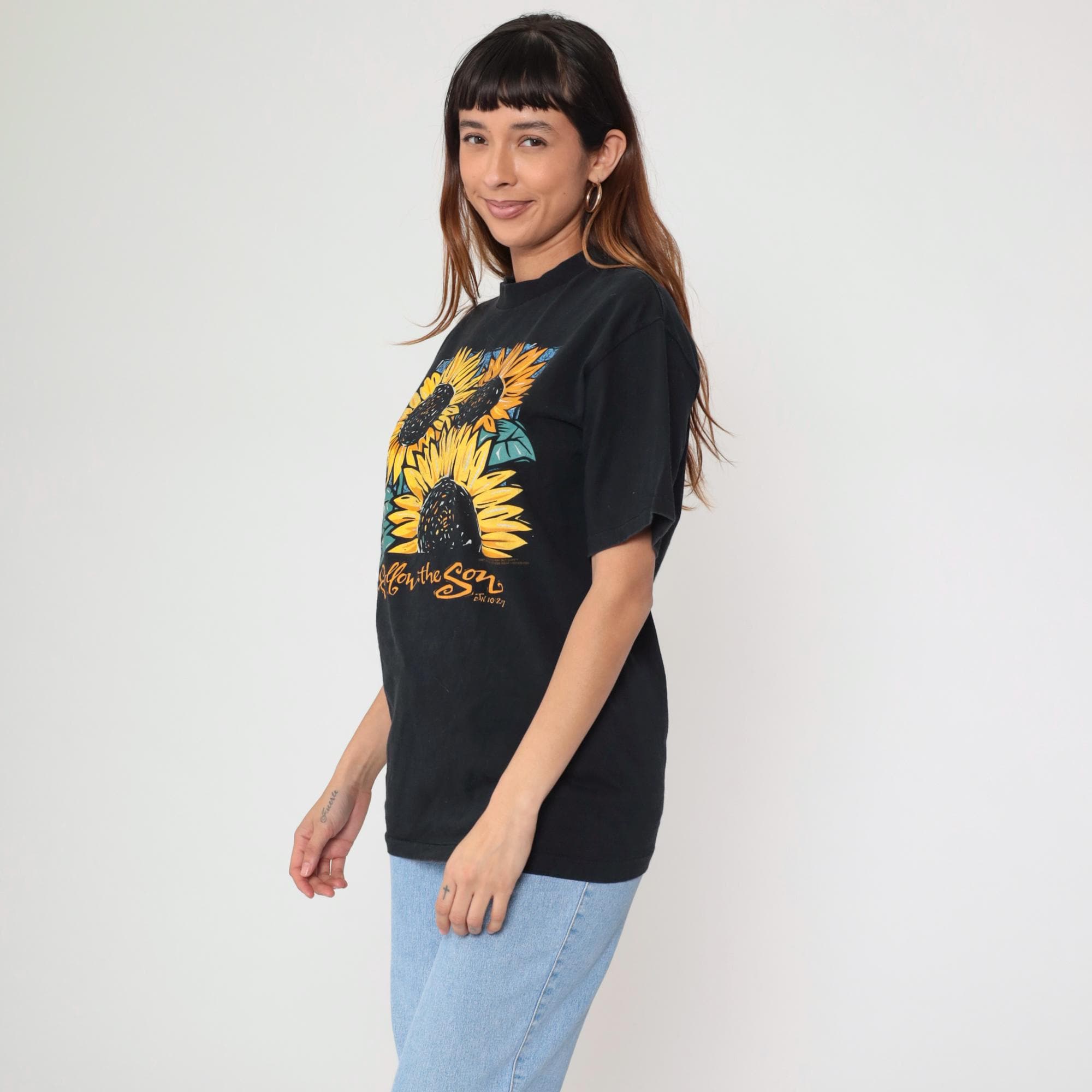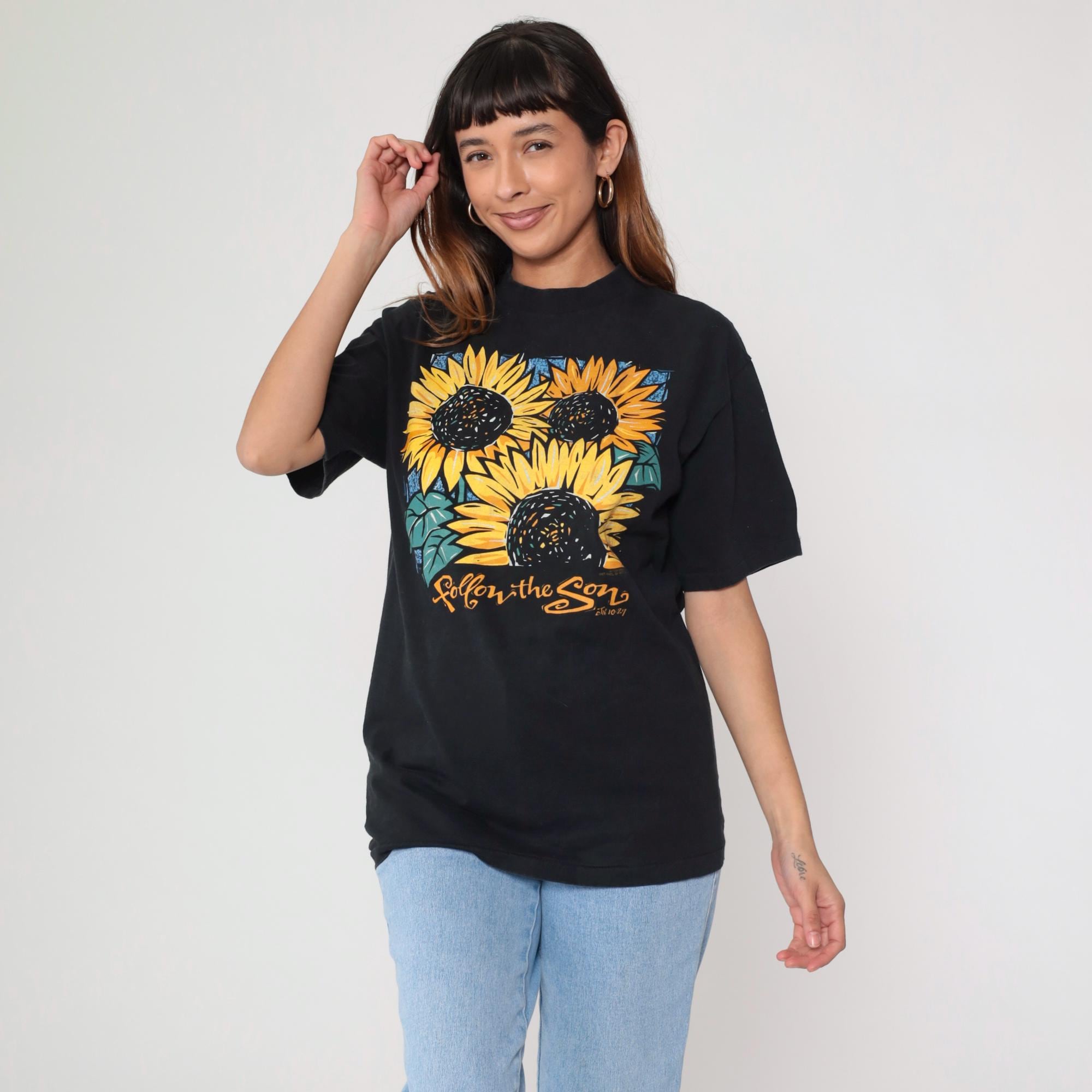 90s black t-shirt featuring bright yellow sunflowers with teal leaves against blue background. Christian message "Follow the Son" with Bible verse reference.