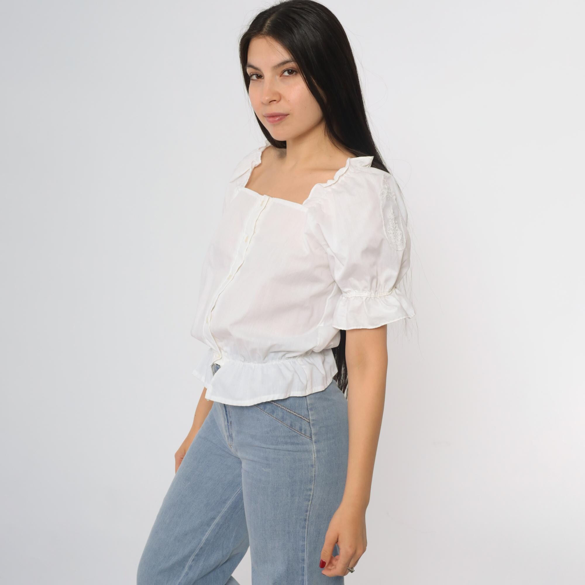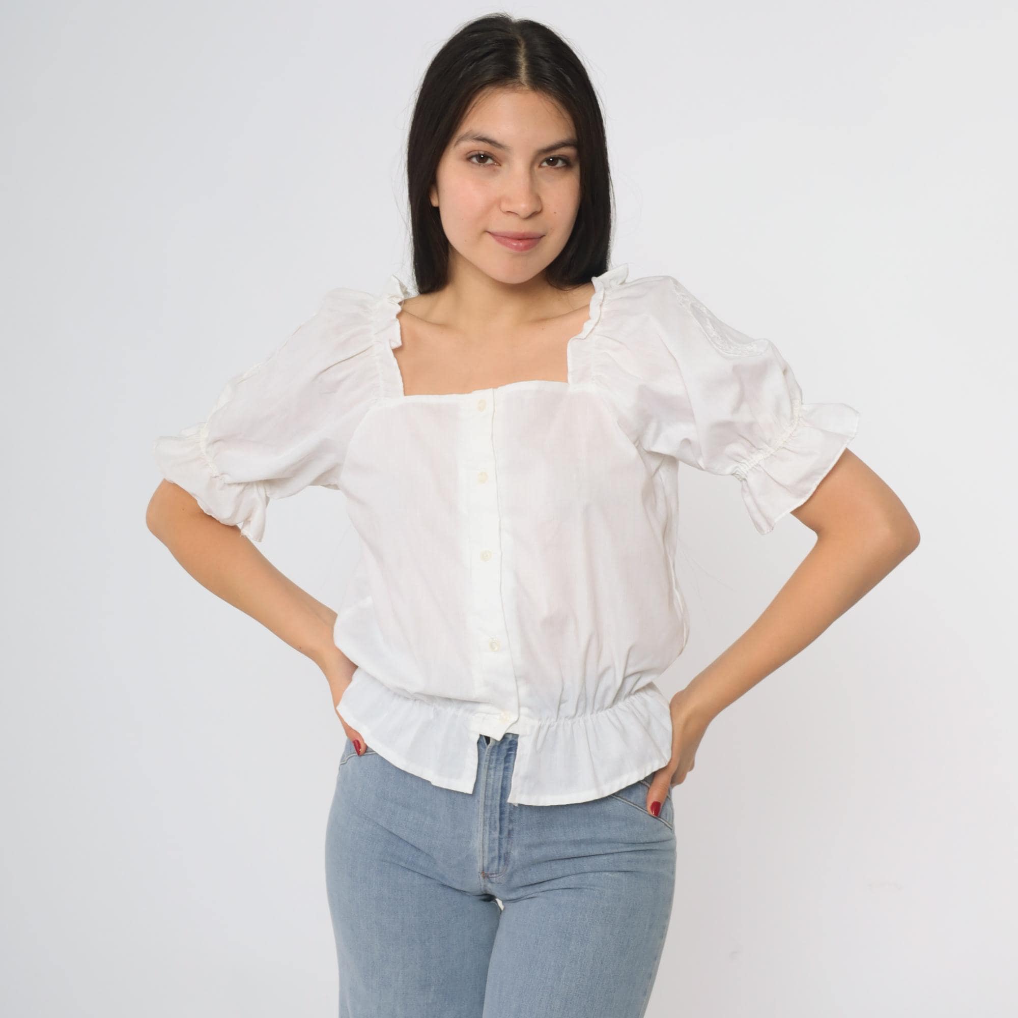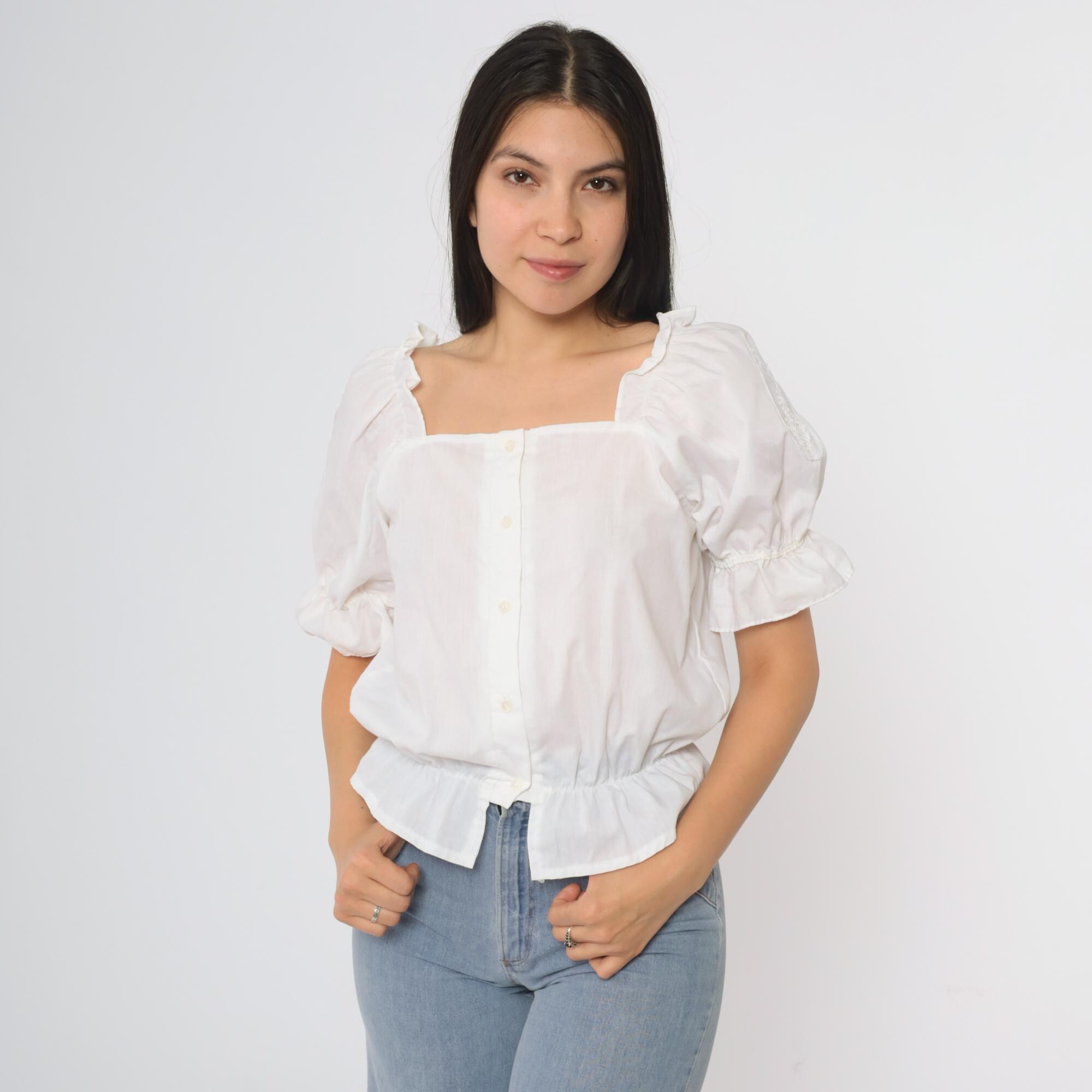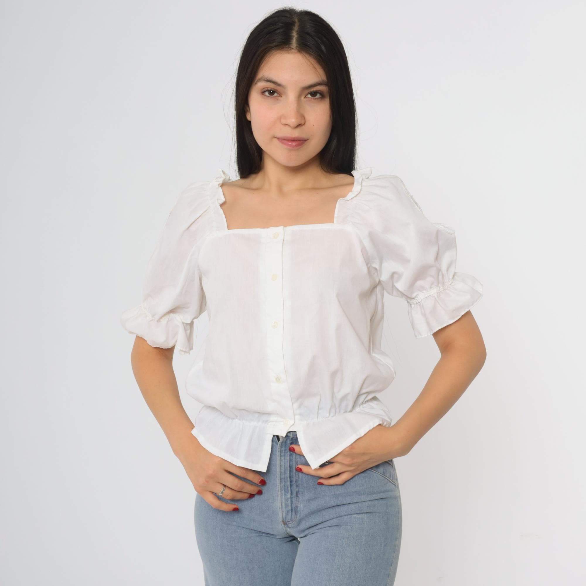 80s white peasant blouse by Ginger Jones of California. Features feminine square neckline with subtle ruffle trim. Short puff sleeves with elastic cuffs and ruffle details. Full button front closure with small white buttons. Elastic gathered hem creates cropped silhouette. Lightweight cotton fabric with soft texture.