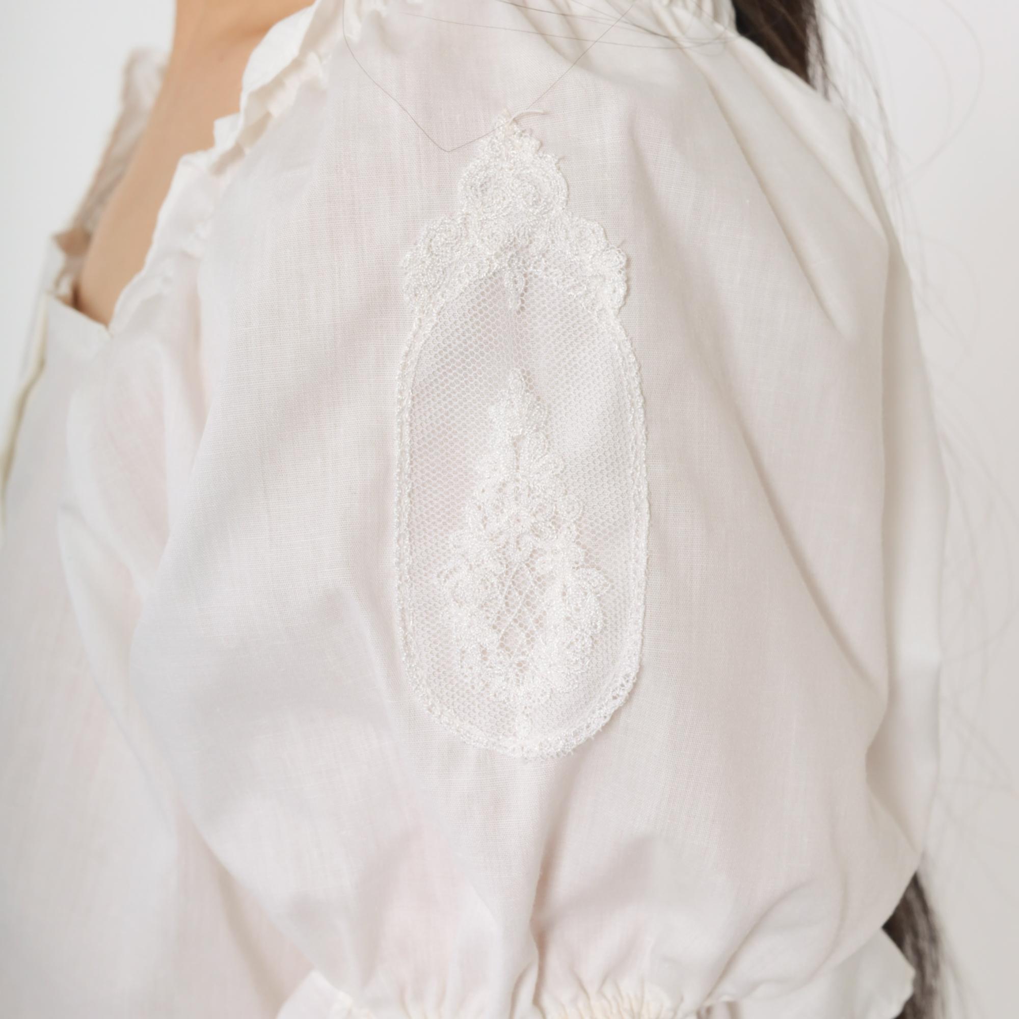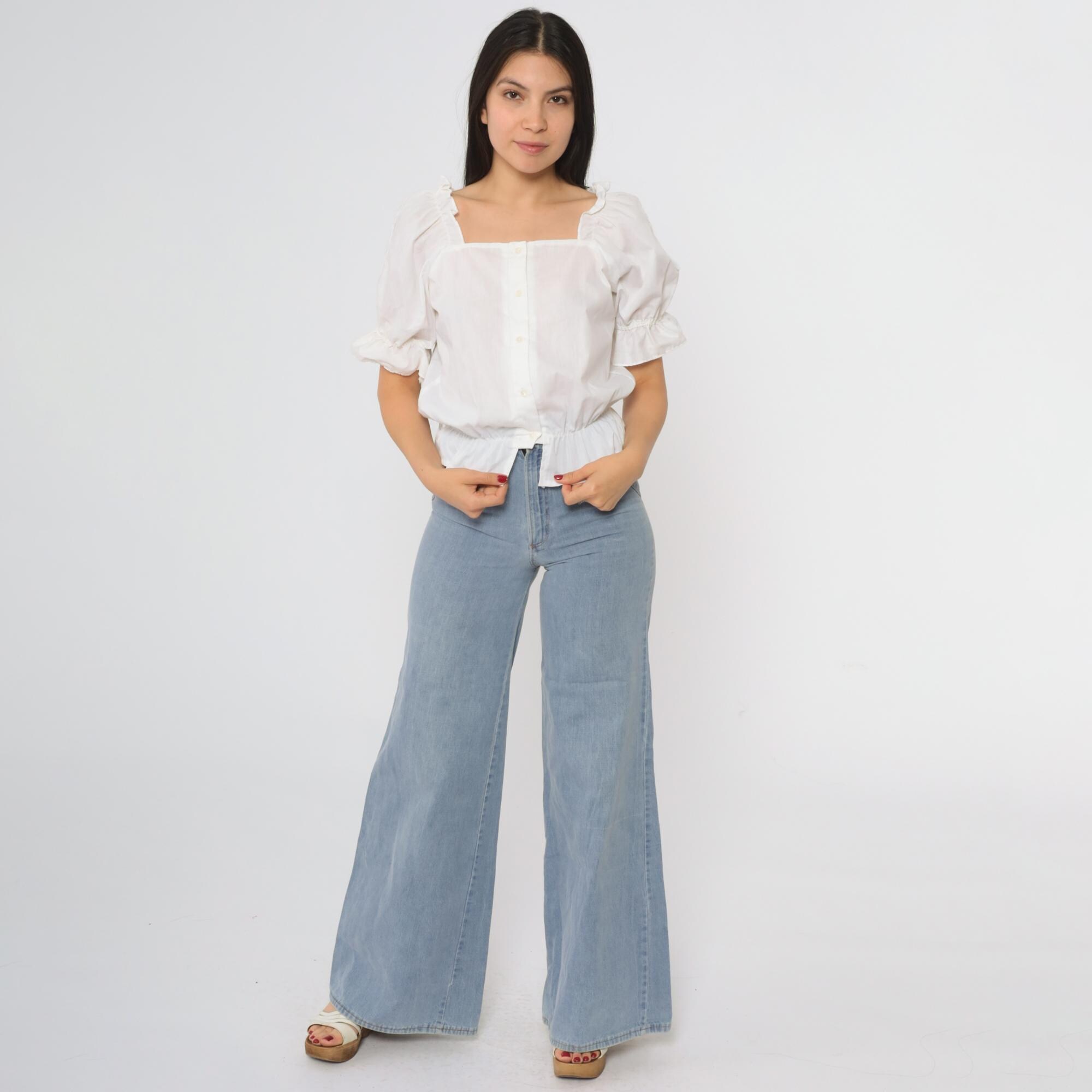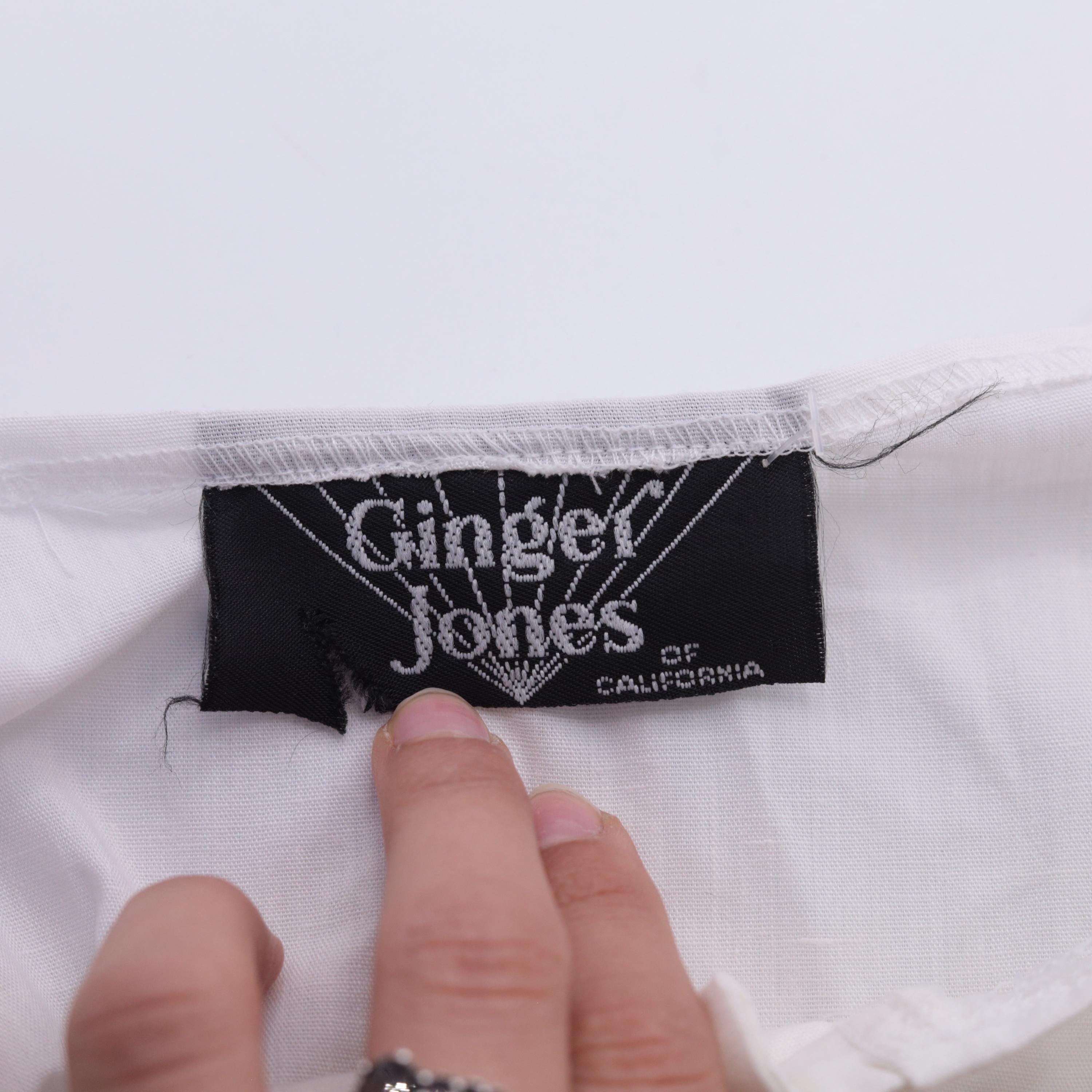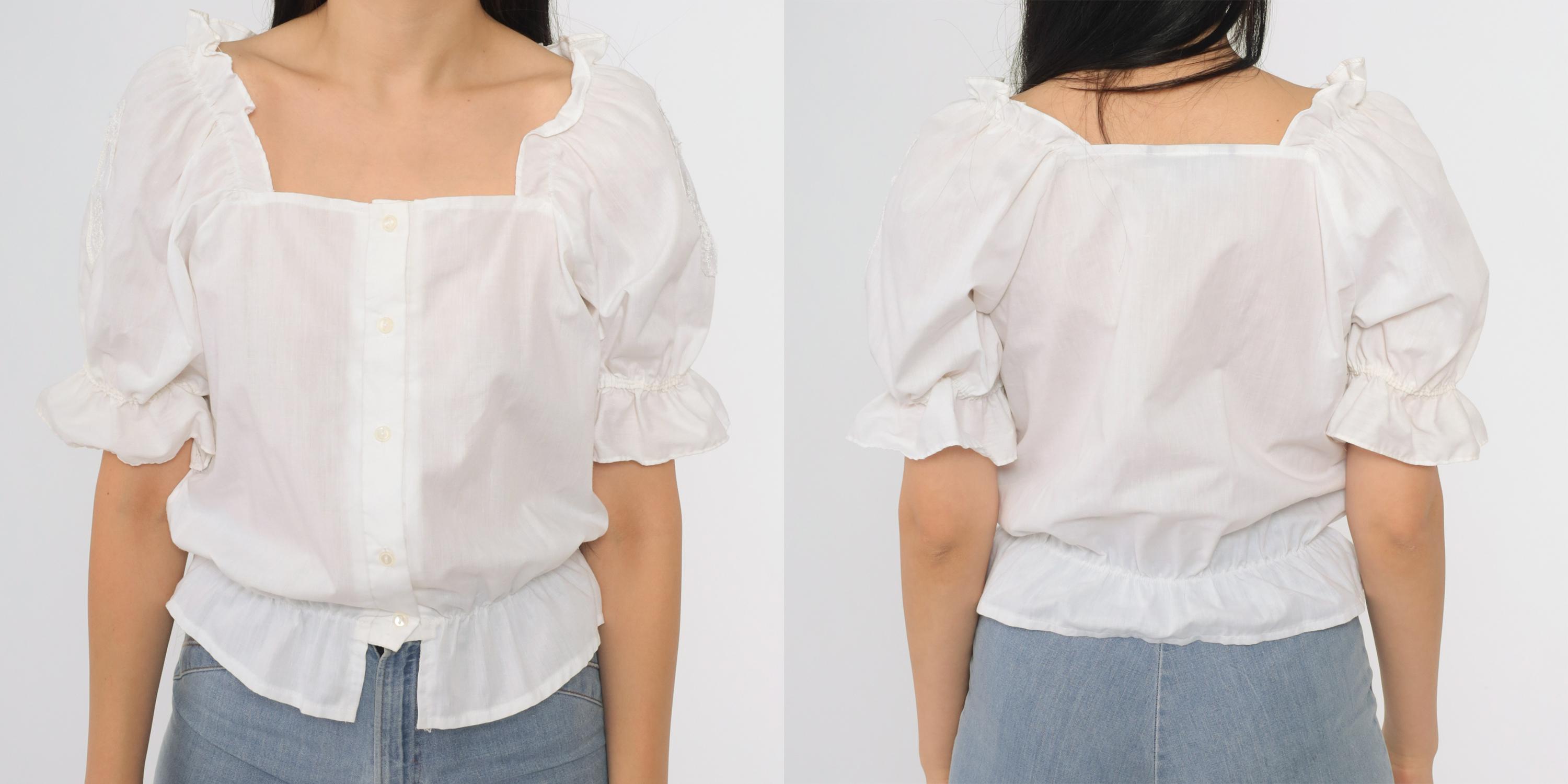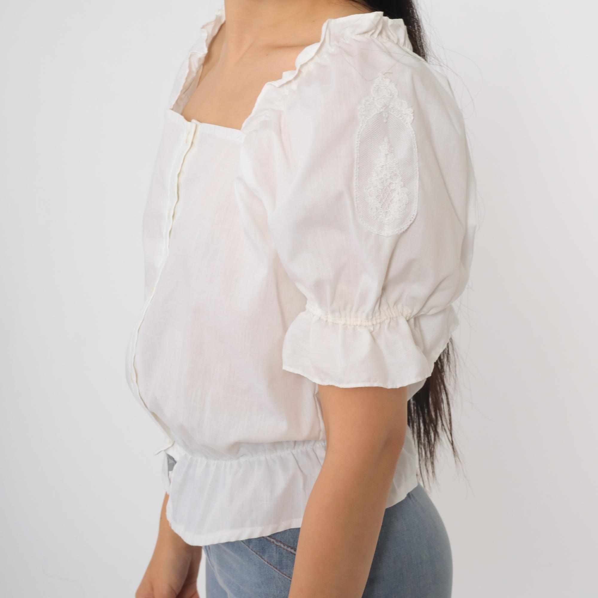 80s white peasant blouse by Ginger Jones of California. Features feminine square neckline with subtle ruffle trim. Short puff sleeves with elastic cuffs and ruffle details. Full button front closure with small white buttons. Elastic gathered hem creates cropped silhouette. Lightweight cotton fabric with soft texture.