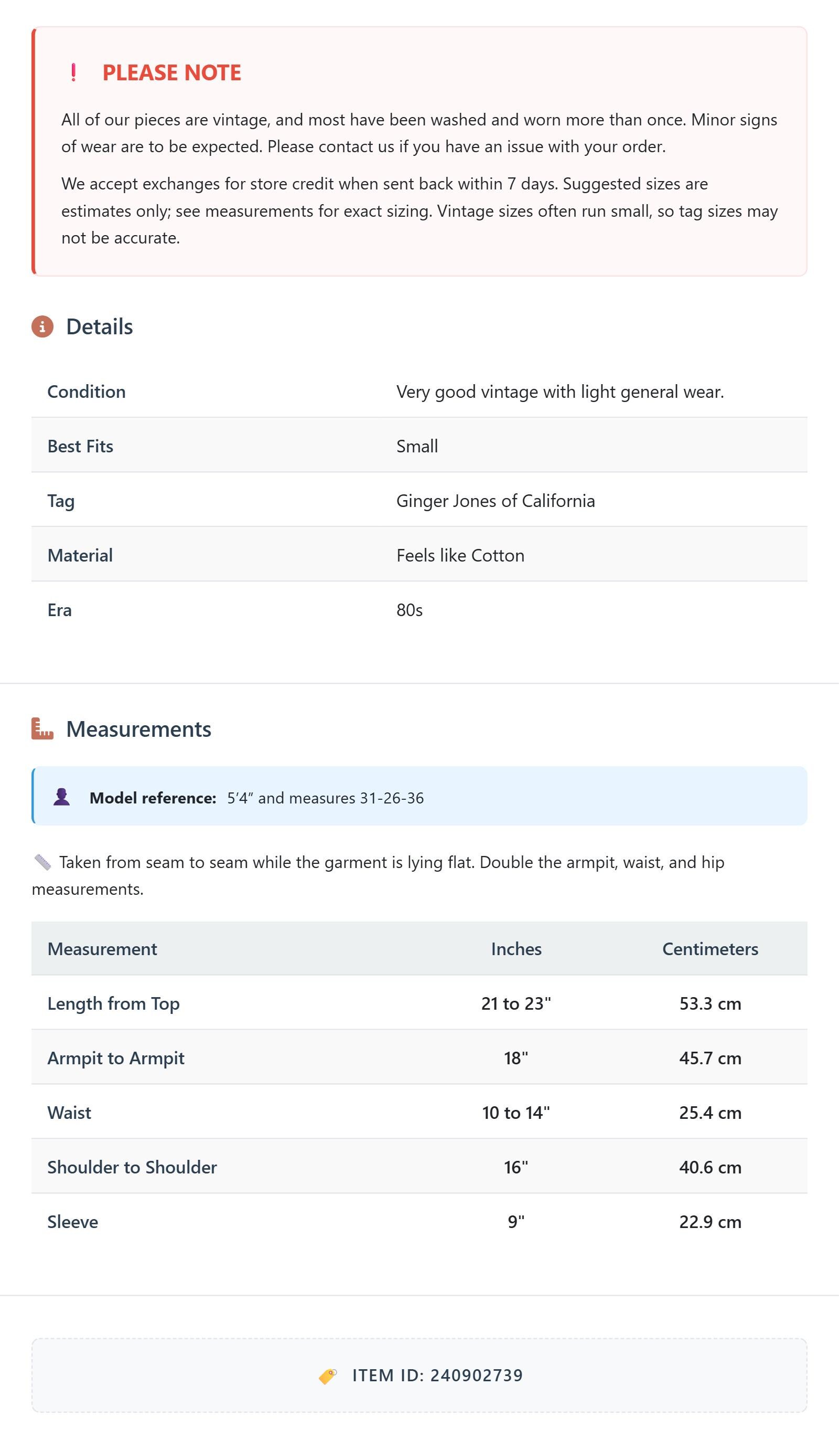 Suggested sizes are estimates only; see measurements for exact sizing. Vintage sizes often run small, so tag sizes may not be accurate.