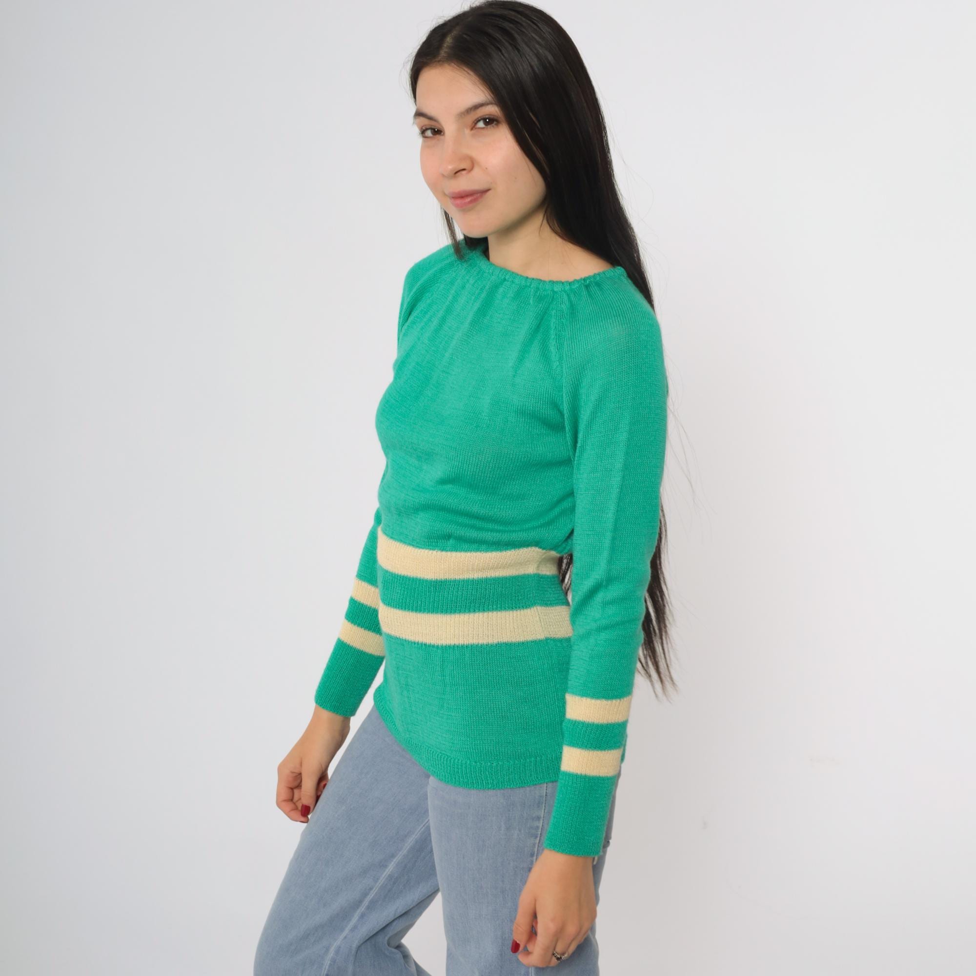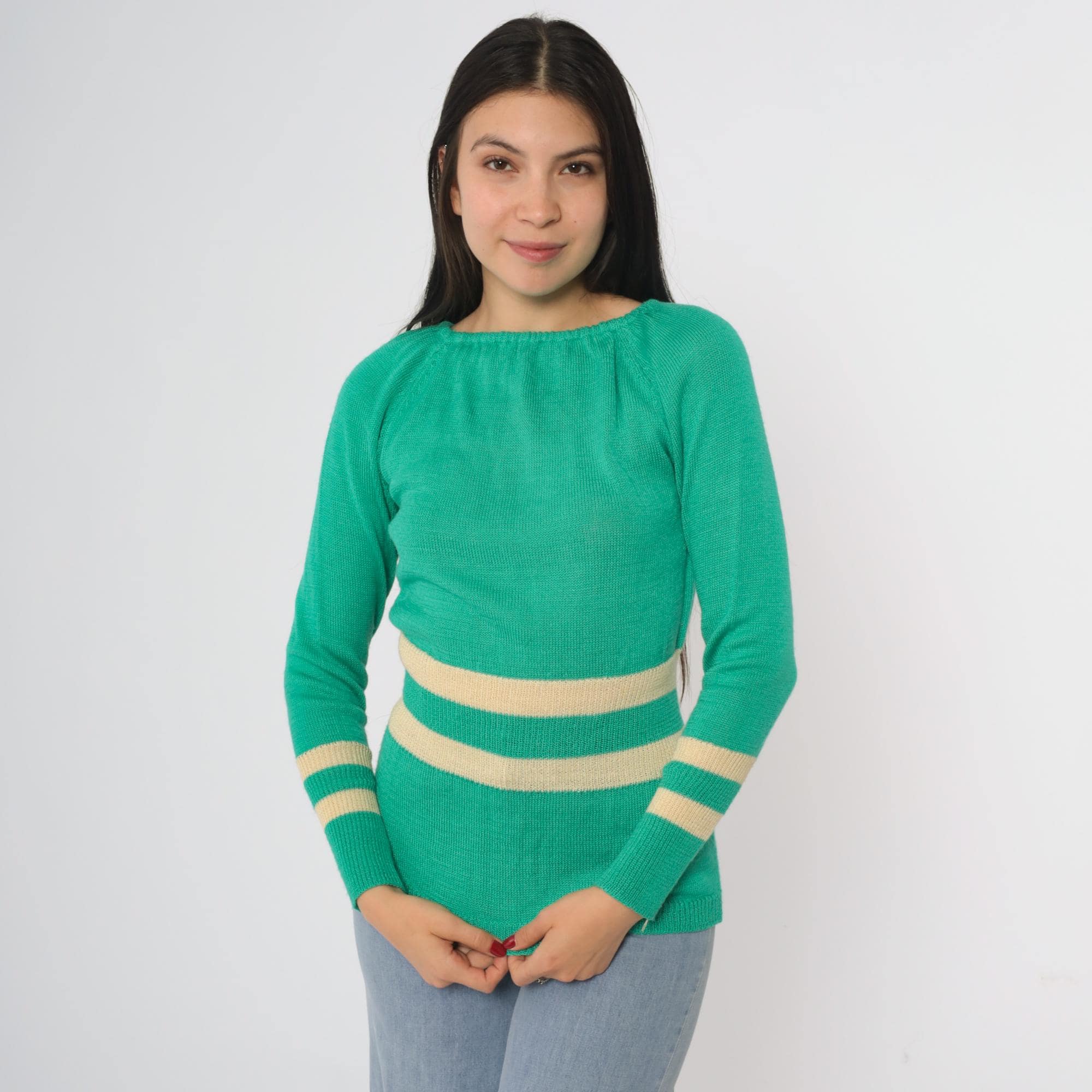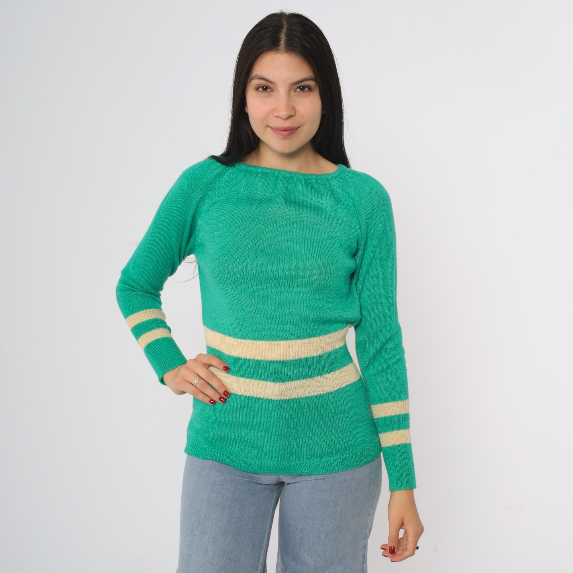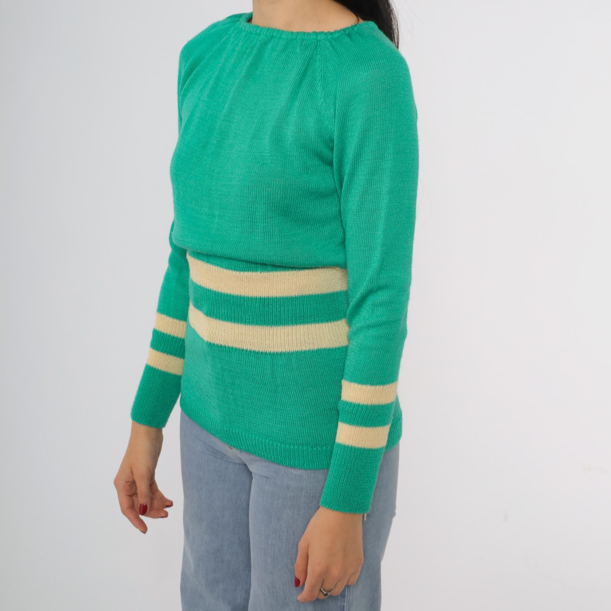 80s emerald green striped sweater by Penrose. Features bold horizontal cream/off-white stripes across lower body and sleeves. Vibrant kelly green base with wide boat neckline. Form-fitting silhouette with ribbed cuffs and hem.