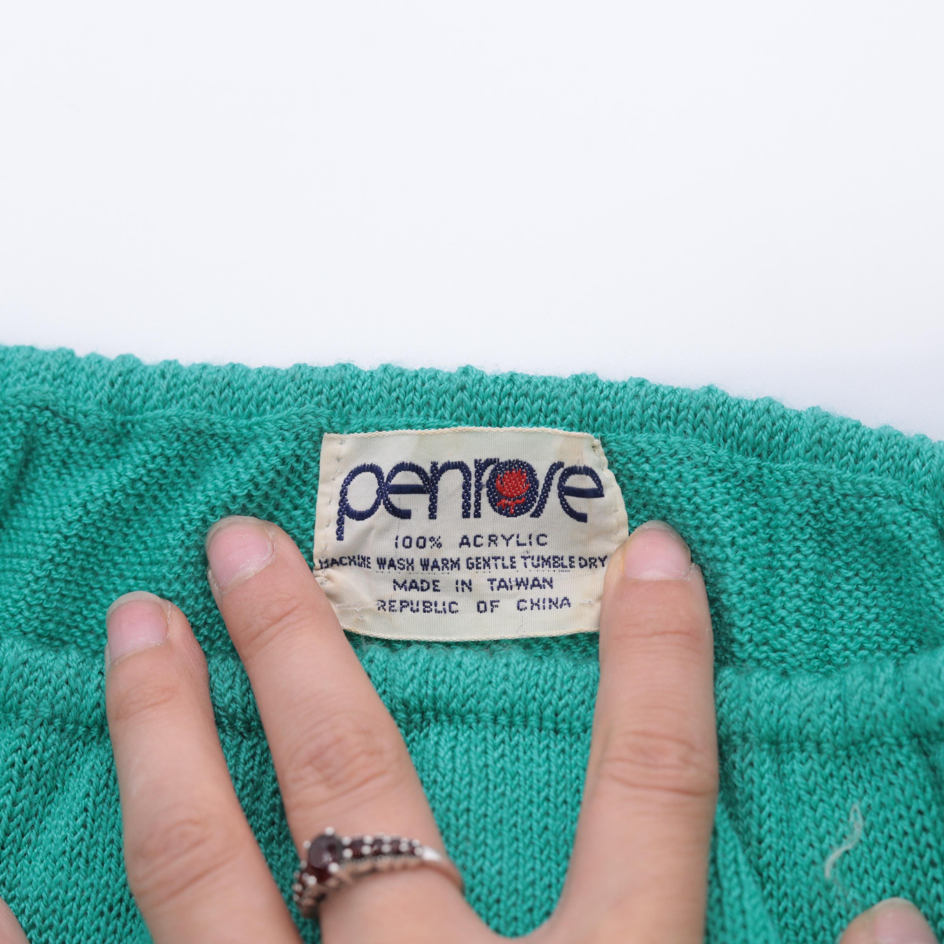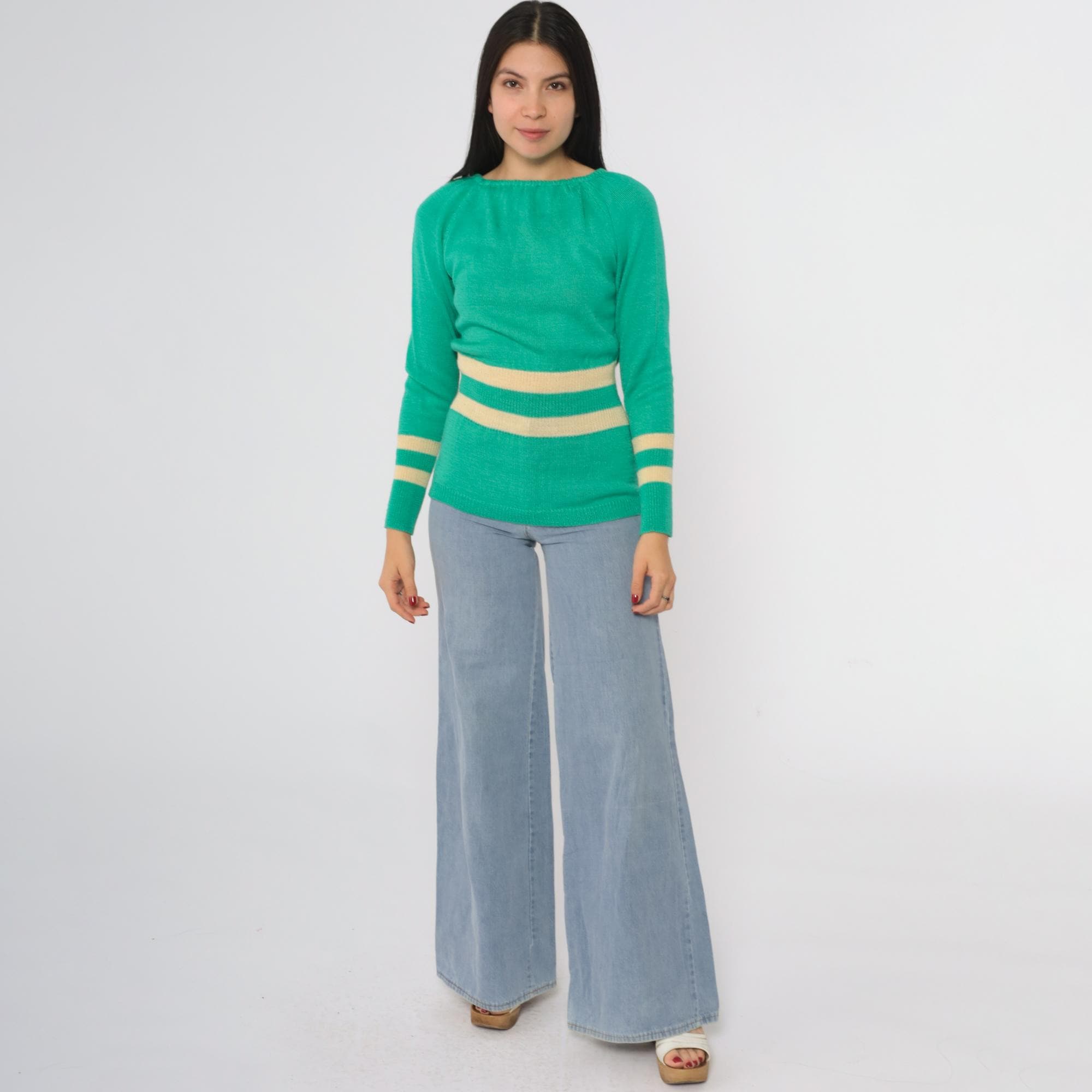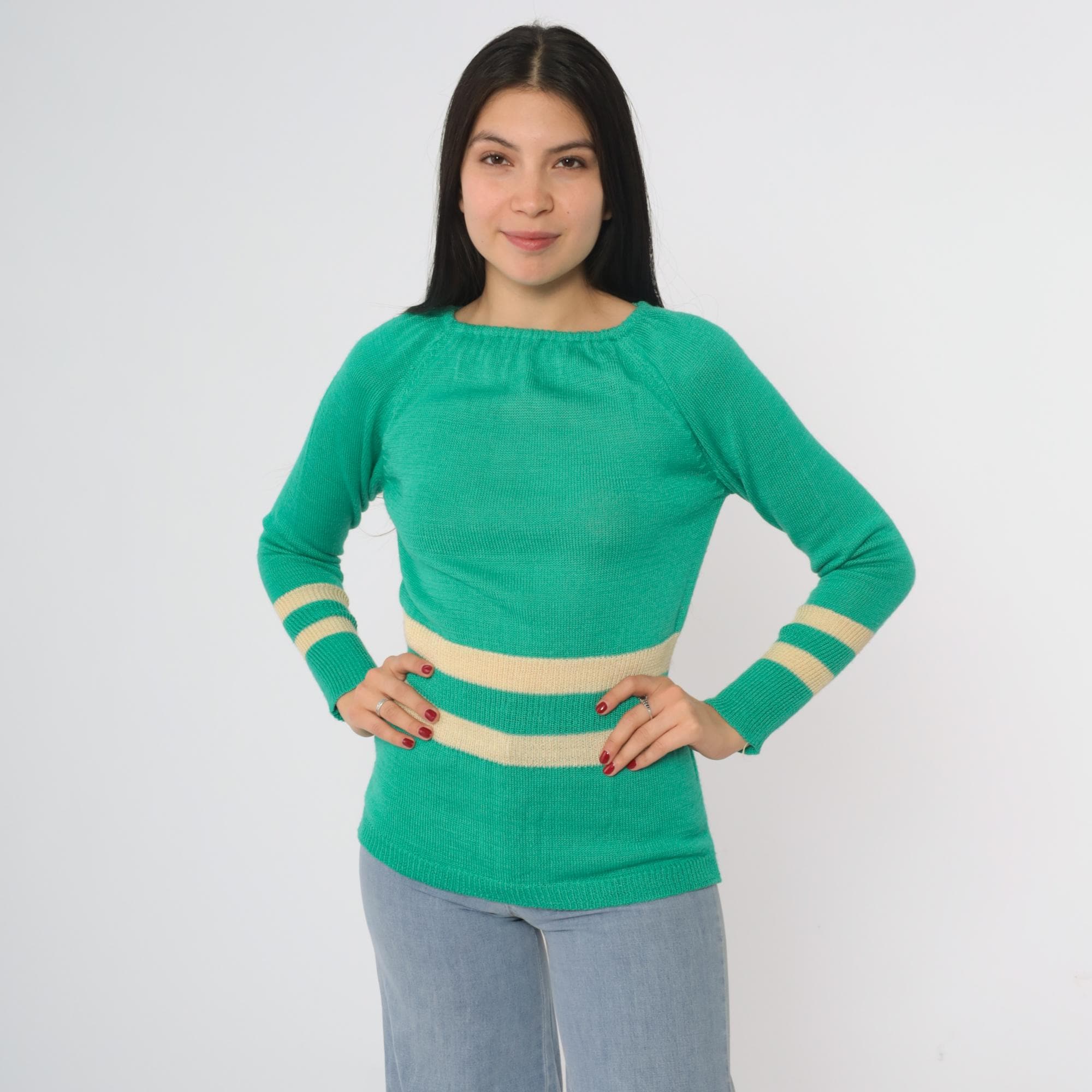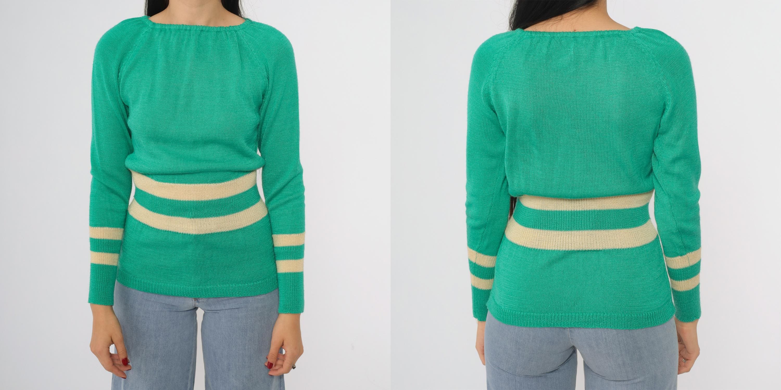 80s emerald green striped sweater by Penrose. Features bold horizontal cream/off-white stripes across lower body and sleeves. Vibrant kelly green base with wide boat neckline. Form-fitting silhouette with ribbed cuffs and hem.