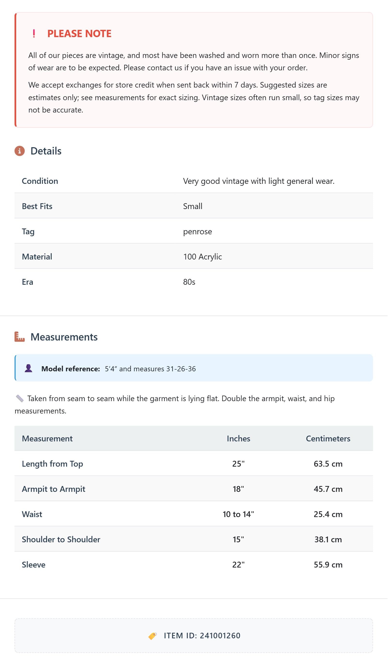 Suggested sizes are estimates only; see measurements for exact sizing. Vintage sizes often run small, so tag sizes may not be accurate.