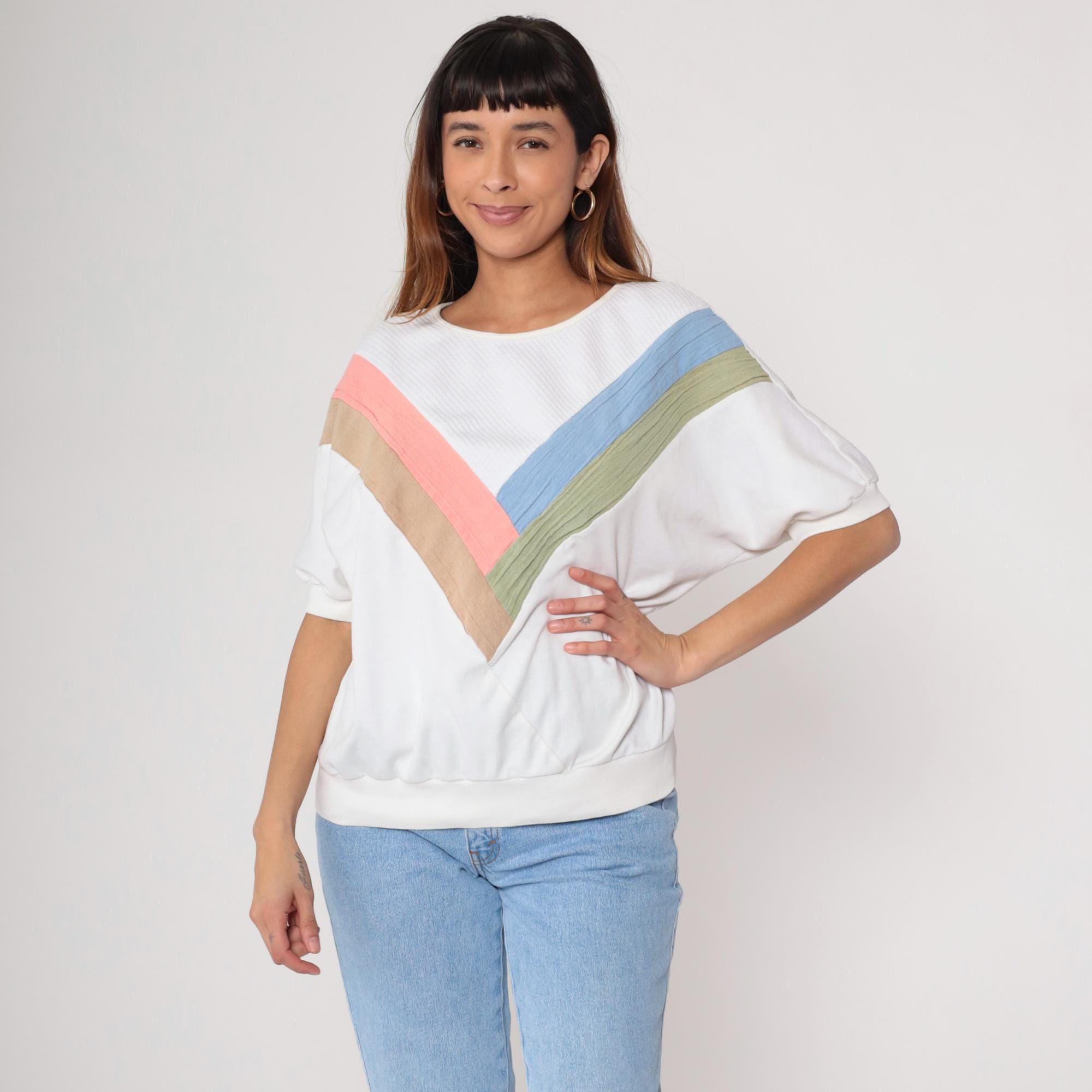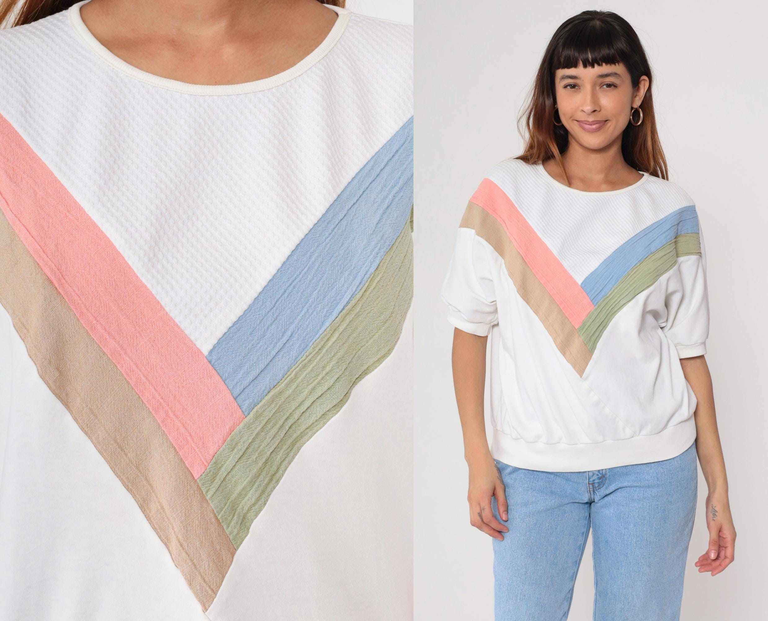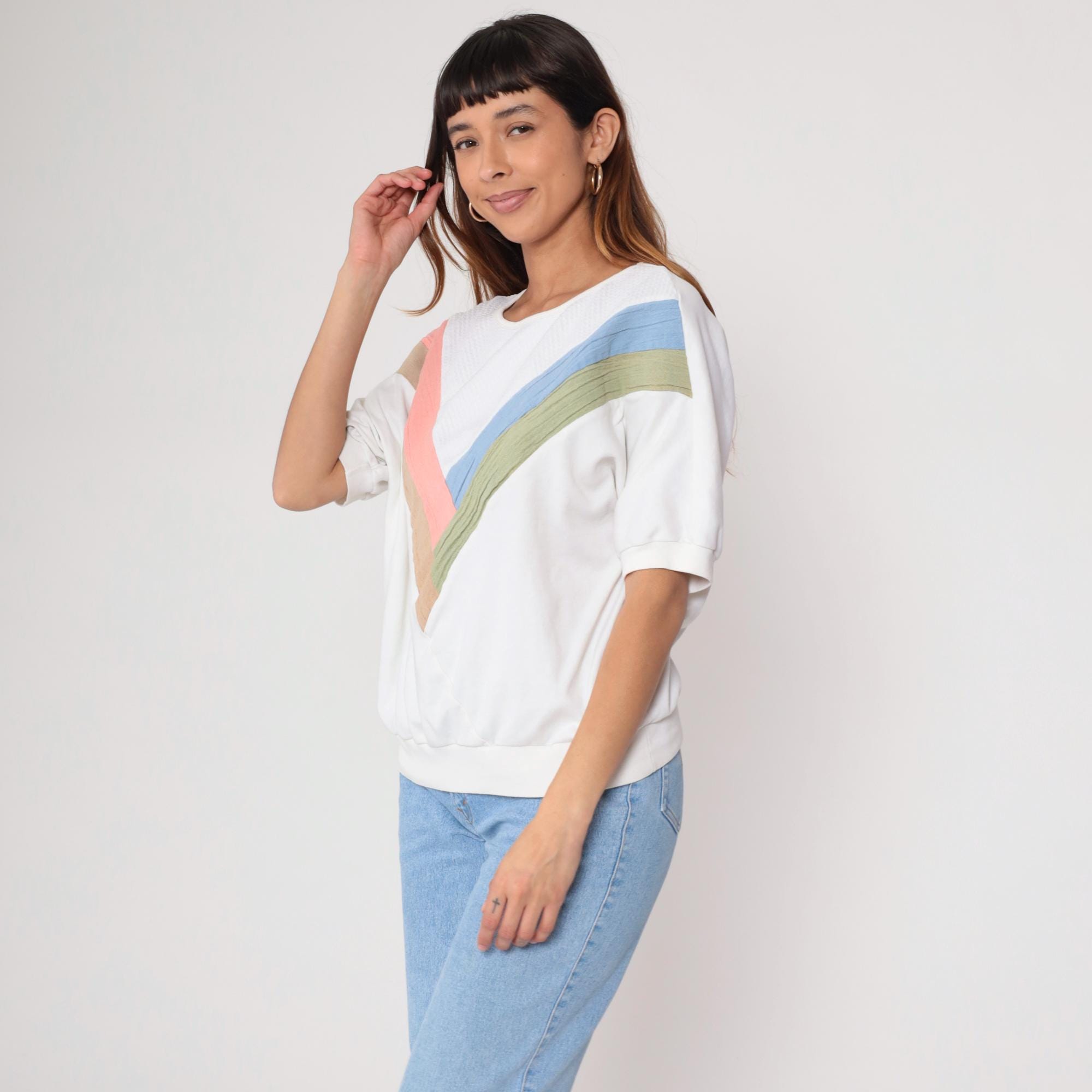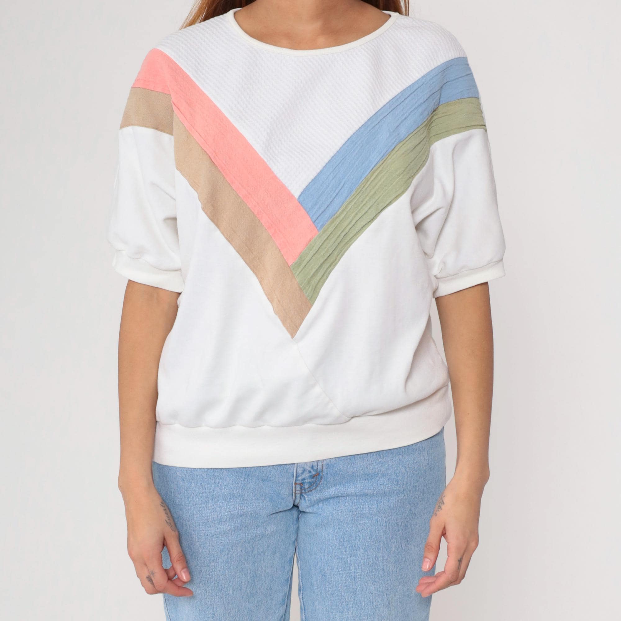 90s white short sleeve sweatshirt featuring pastel colorblock V chevron pattern in pink, tan, blue and green. Textured knit detail on chest.