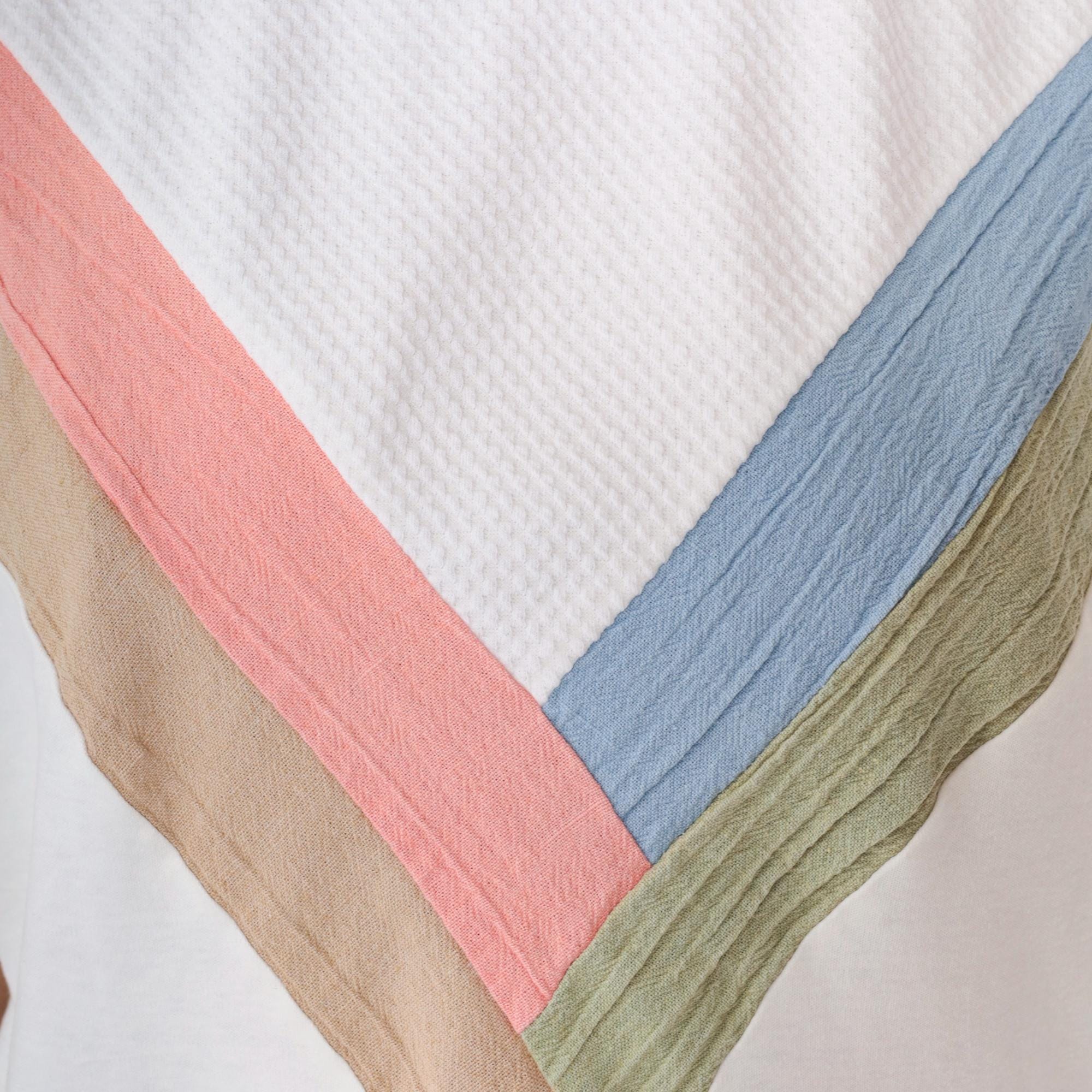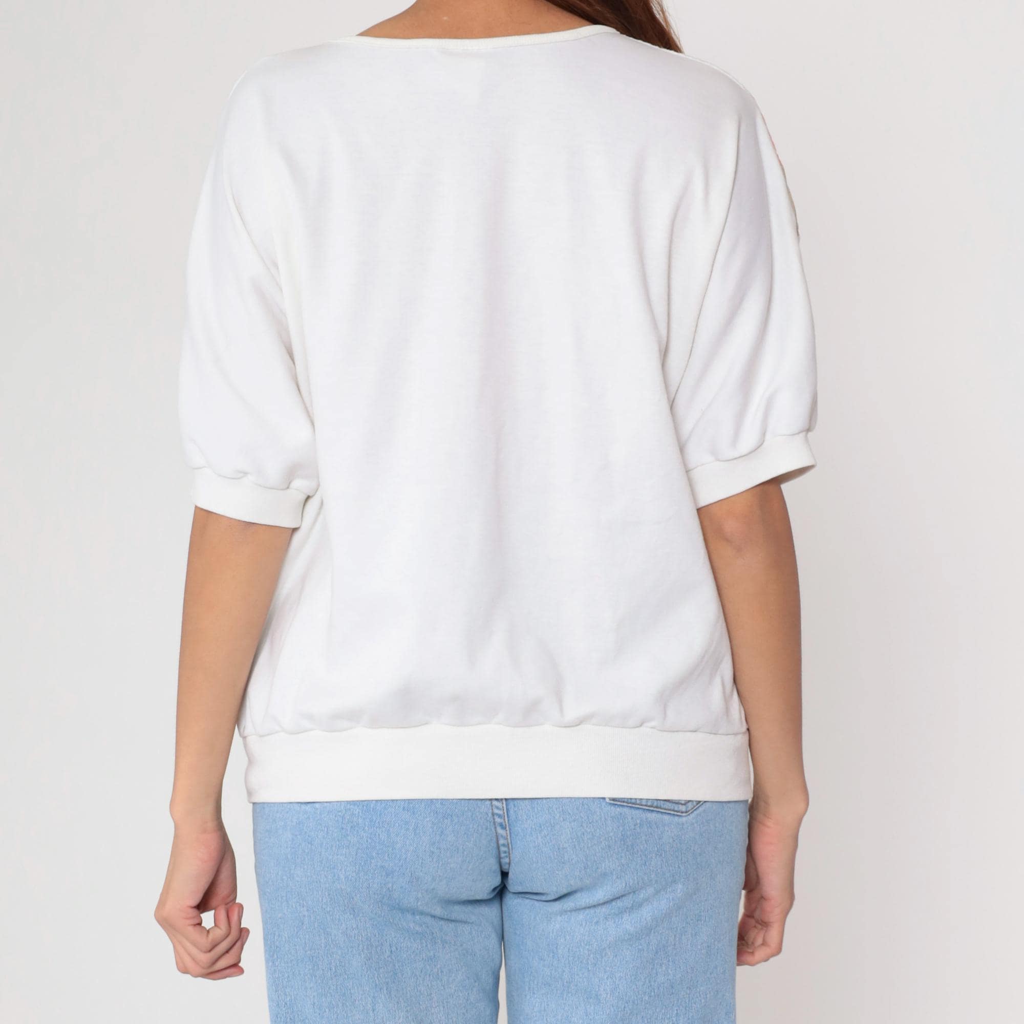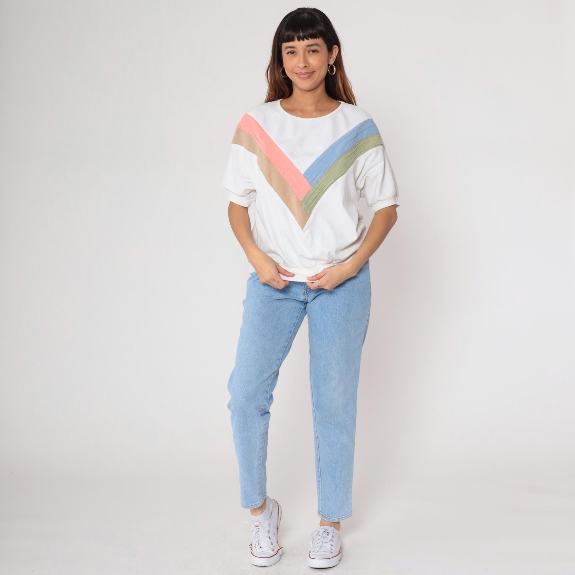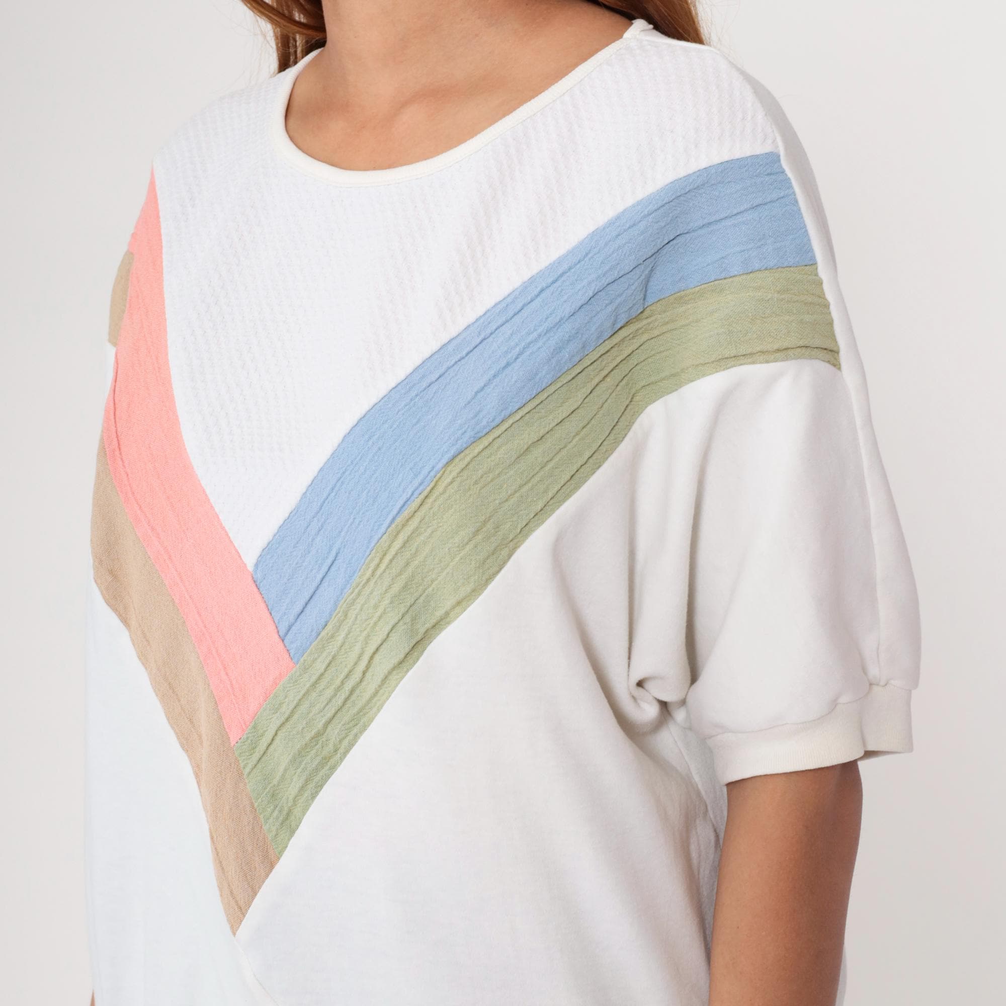 90s white short sleeve sweatshirt featuring pastel colorblock V chevron pattern in pink, tan, blue and green. Textured knit detail on chest.