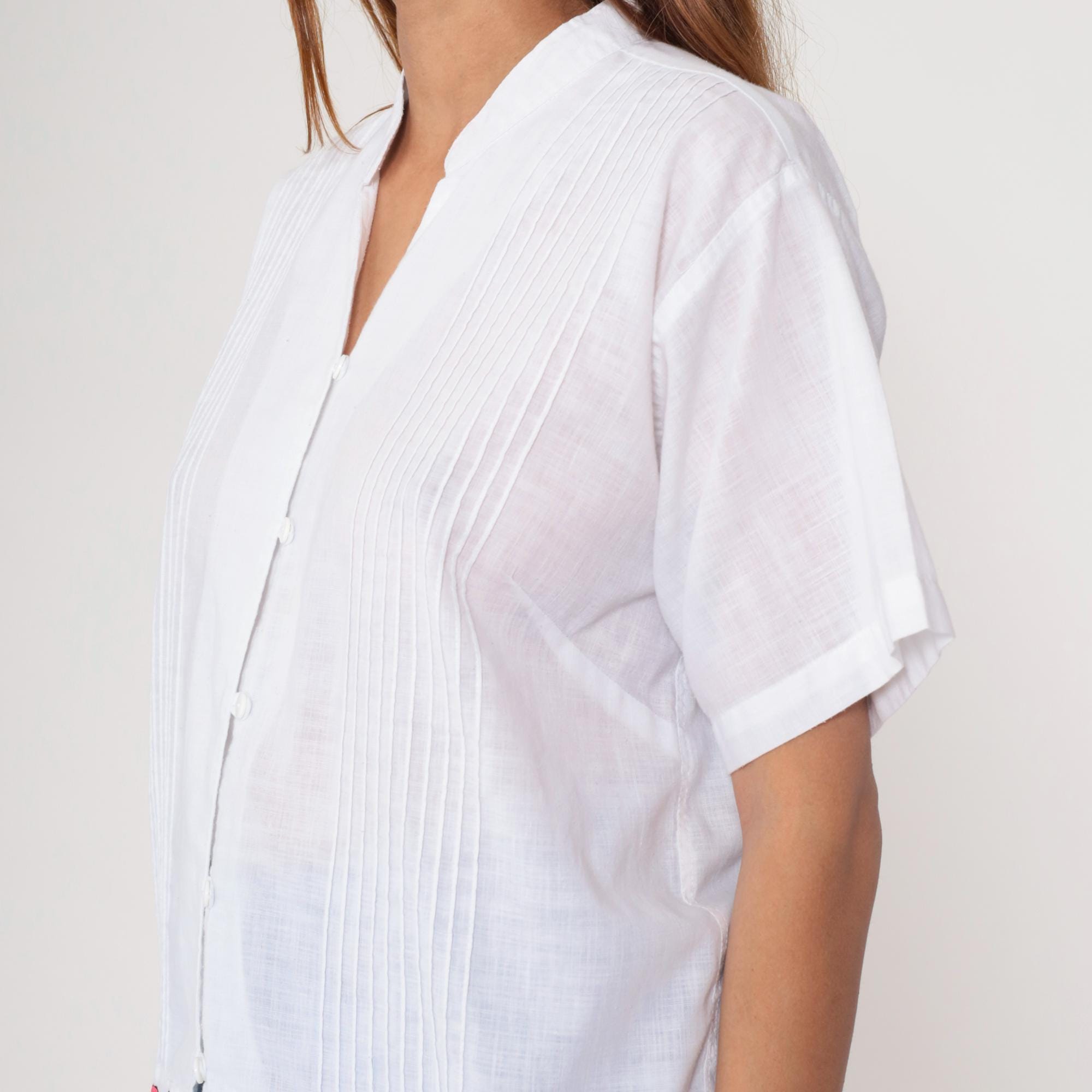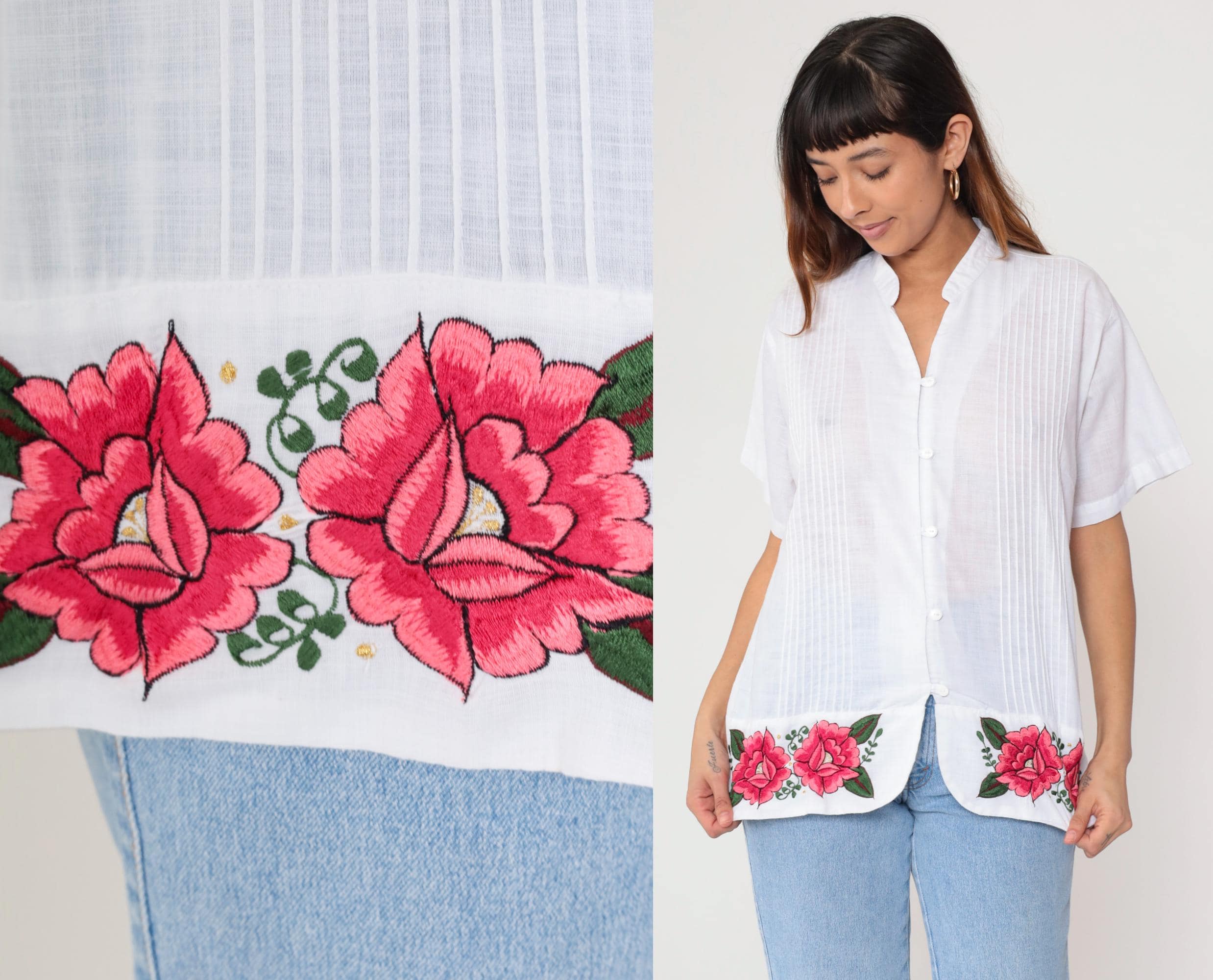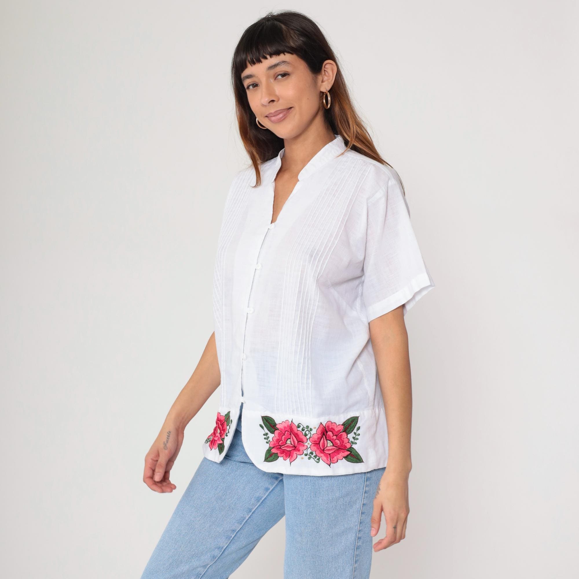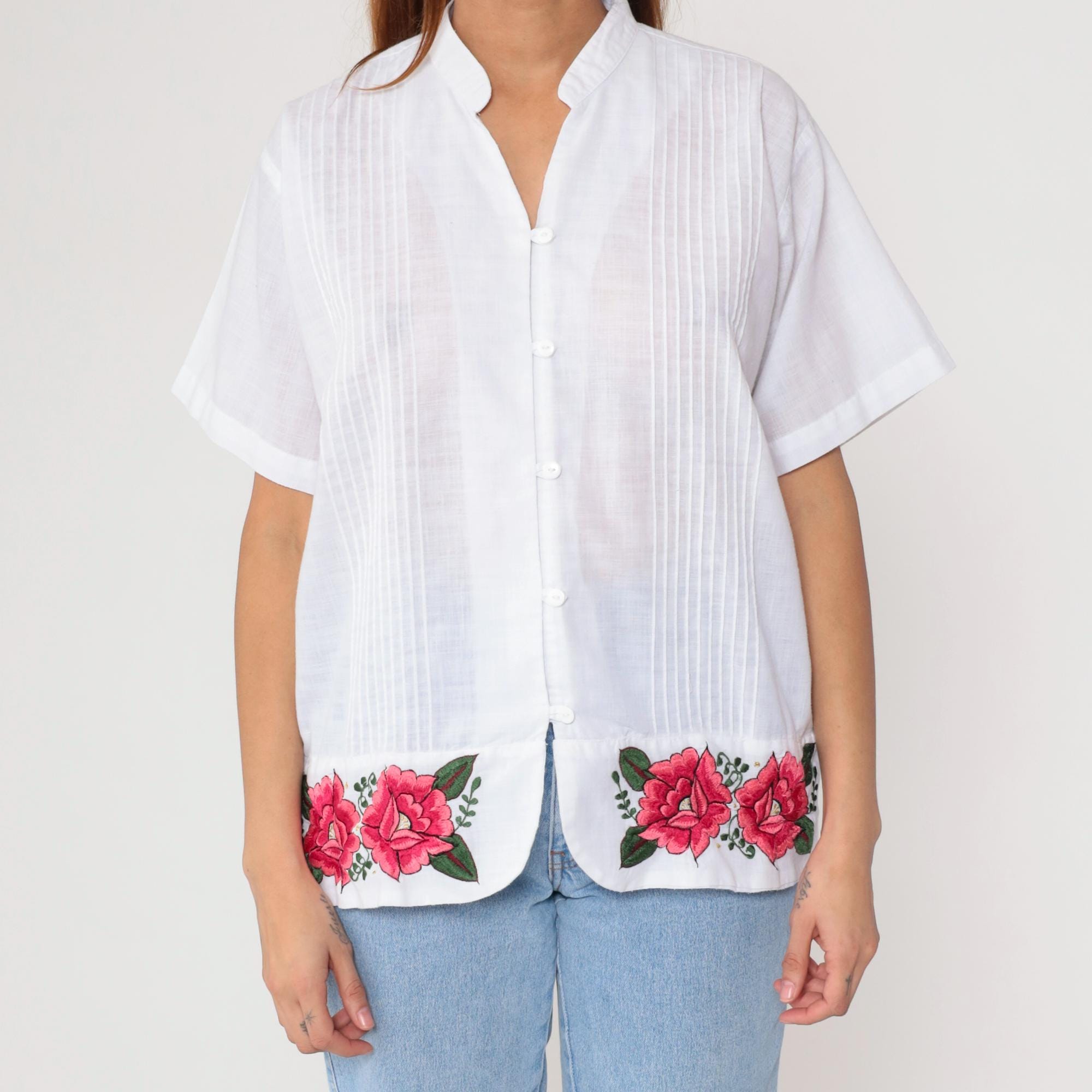 90s white button-down shirt featuring bright pink embroidered roses along hem. Pleated front panel with mandarin collar. Short sleeves with turned cuffs.