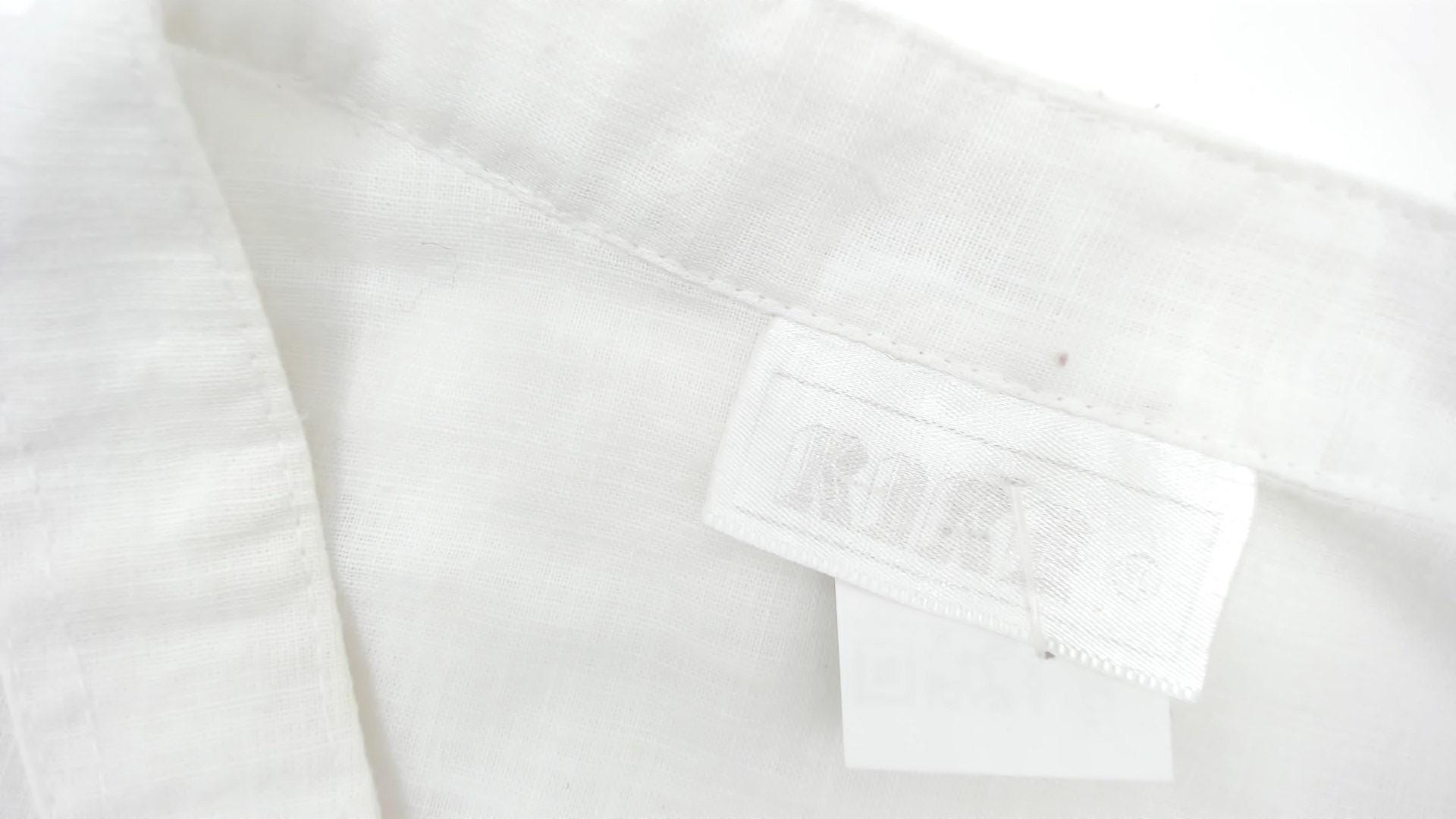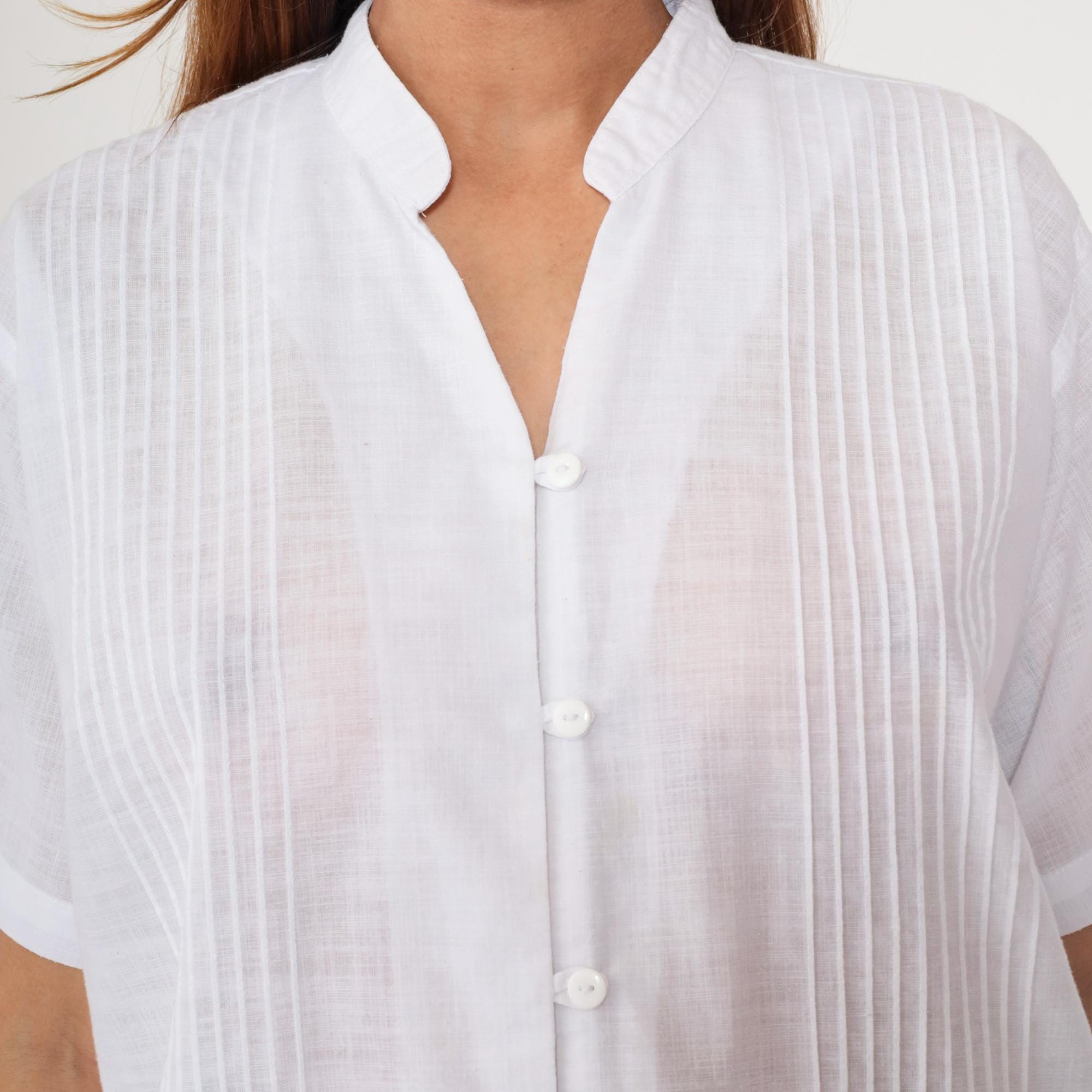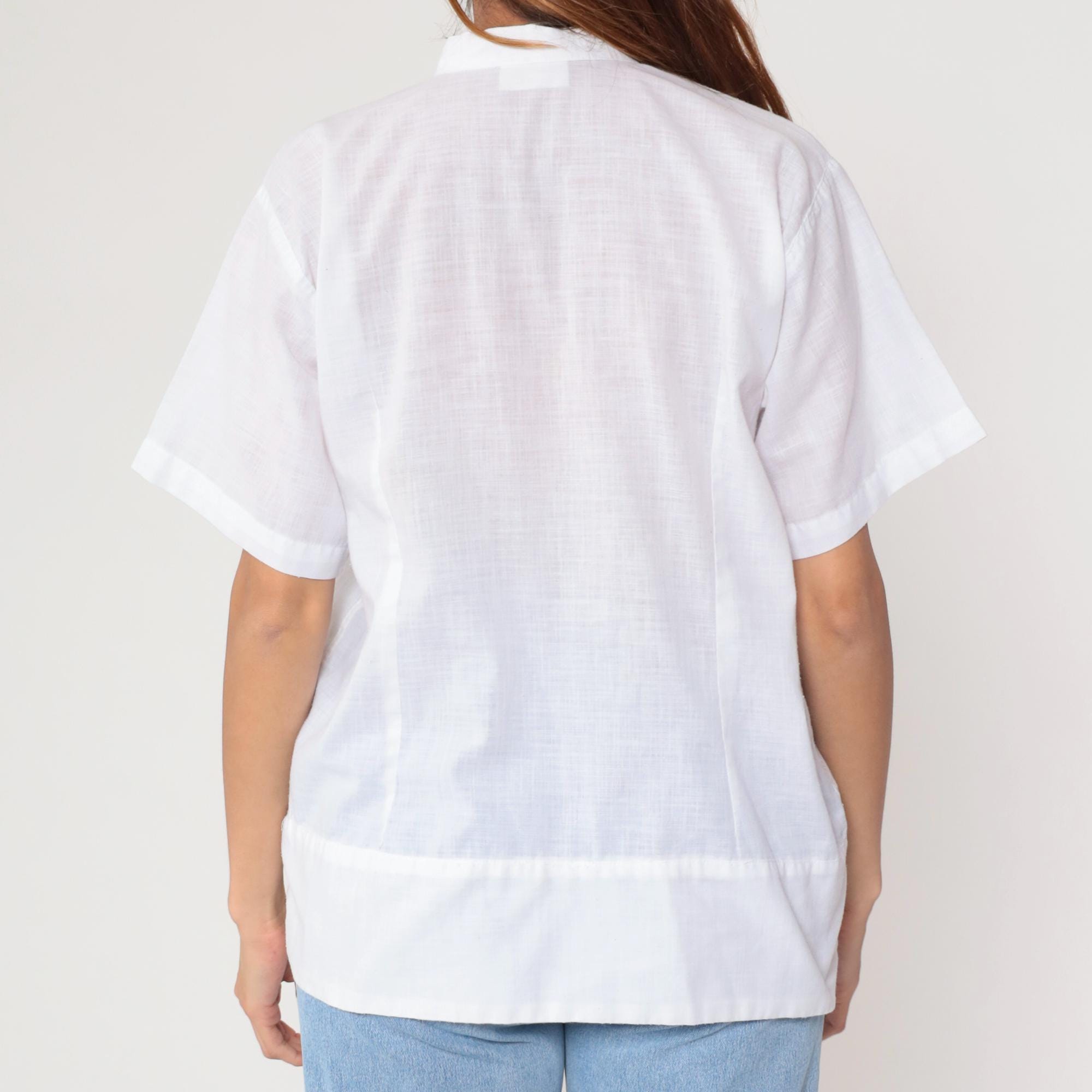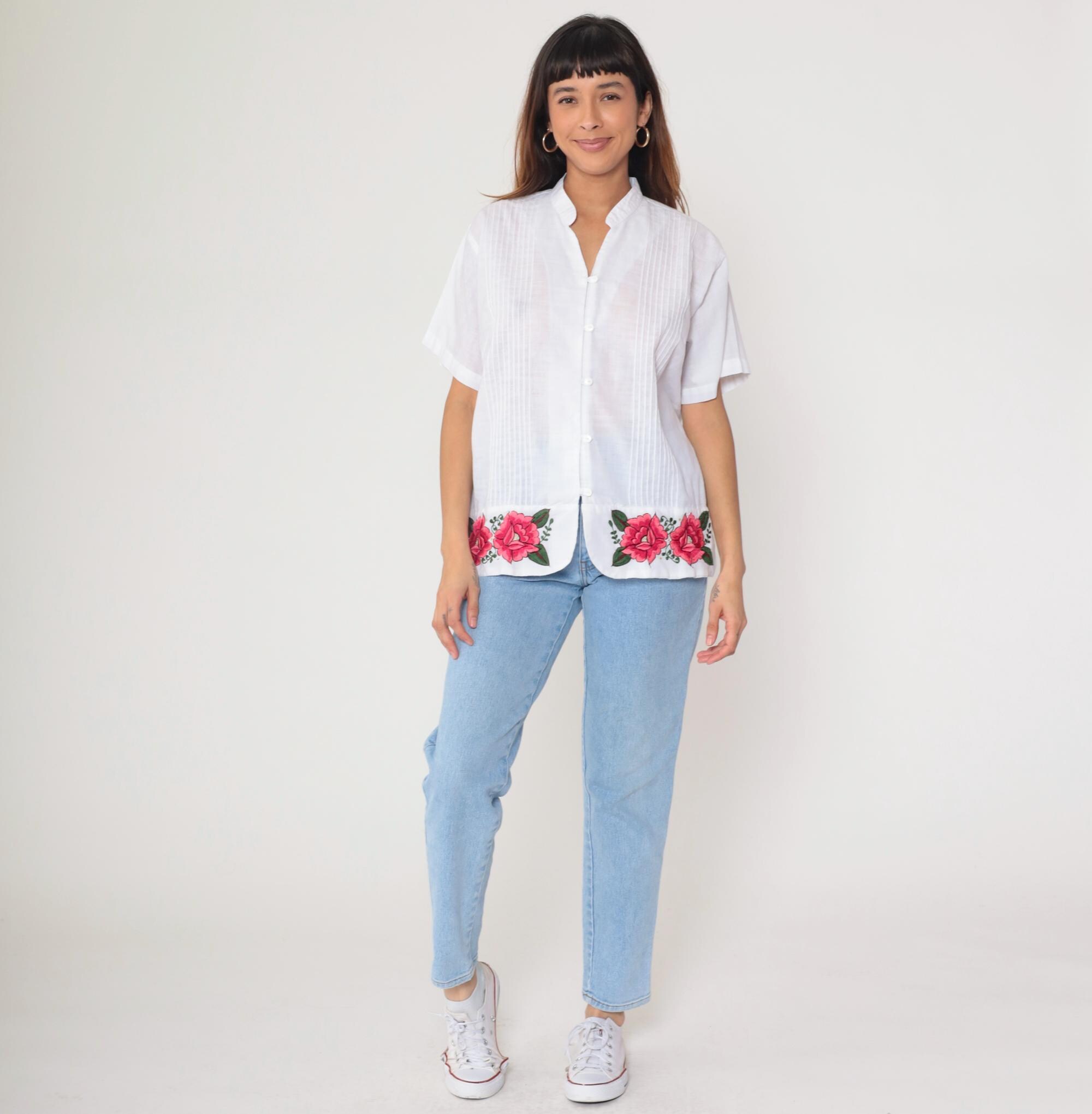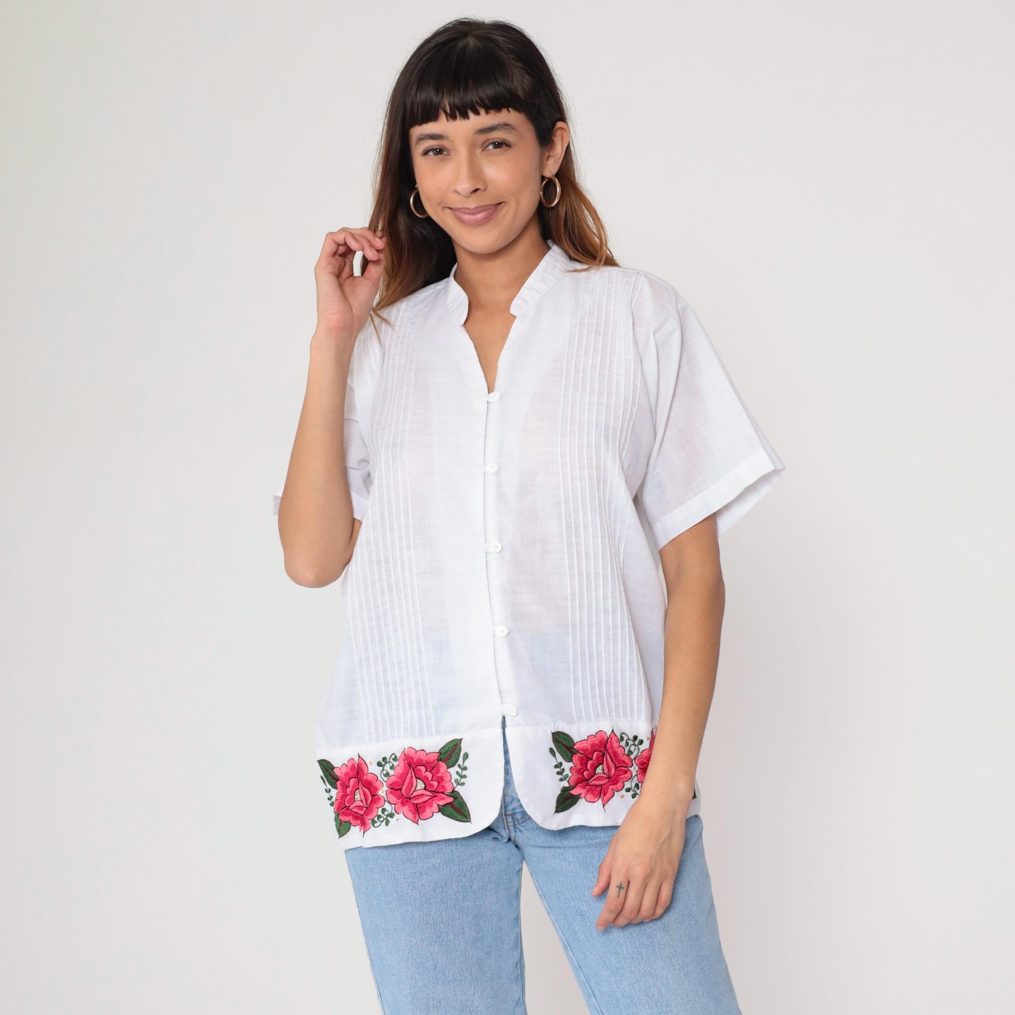90s white button-down shirt featuring bright pink embroidered roses along hem. Pleated front panel with mandarin collar. Short sleeves with turned cuffs.