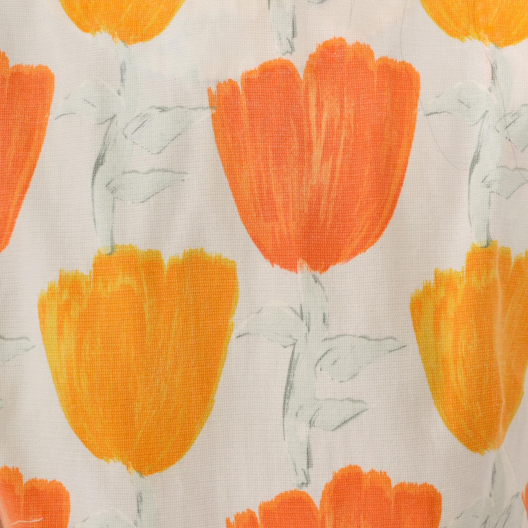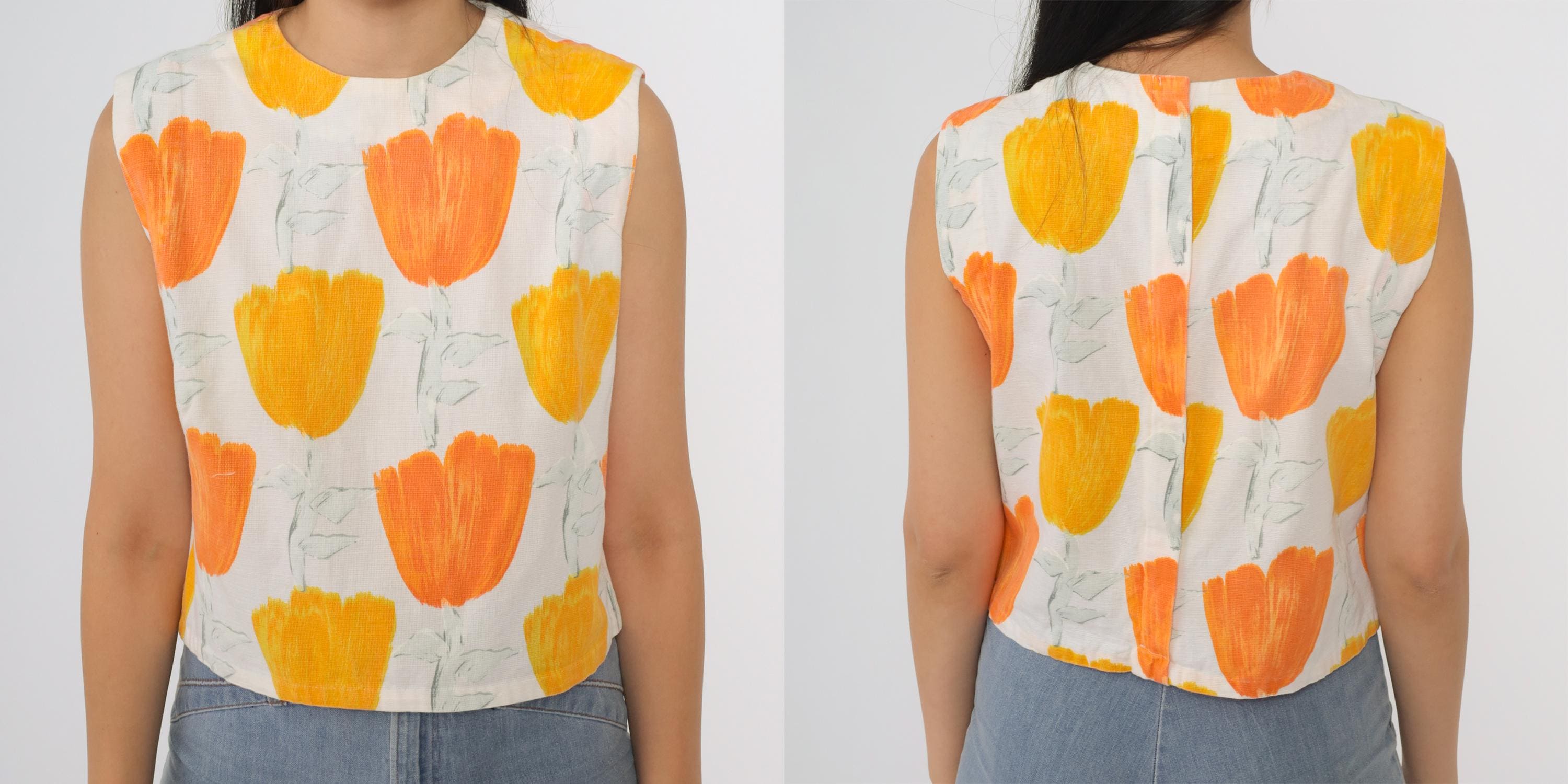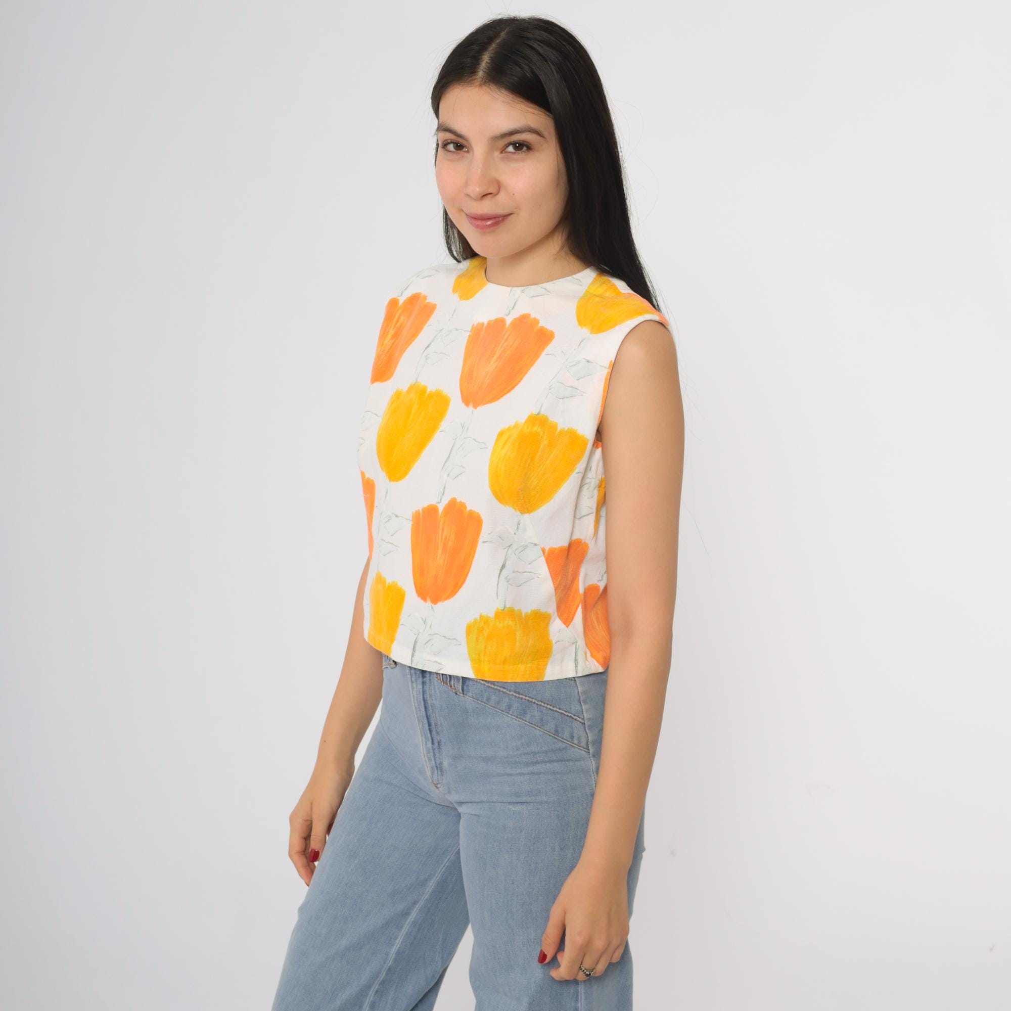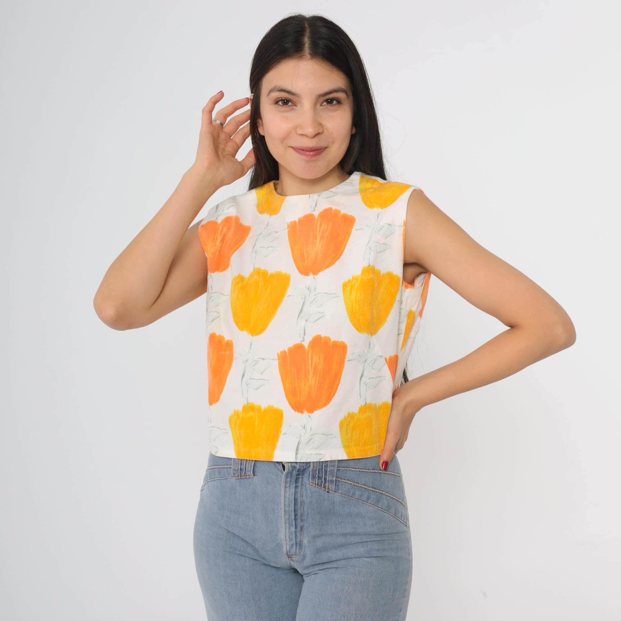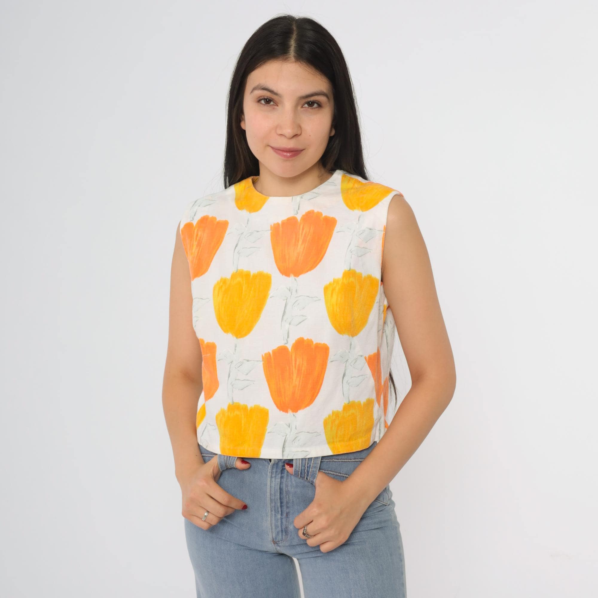 60s tulip print crop top in vibrant spring colors. Features large-scale orange and yellow tulips with delicate green stem details on white background. Sleeveless boxy cut with round neckline and straight hem. Lightweight polyester fabric with slight texture. Has a zipper closure on back.