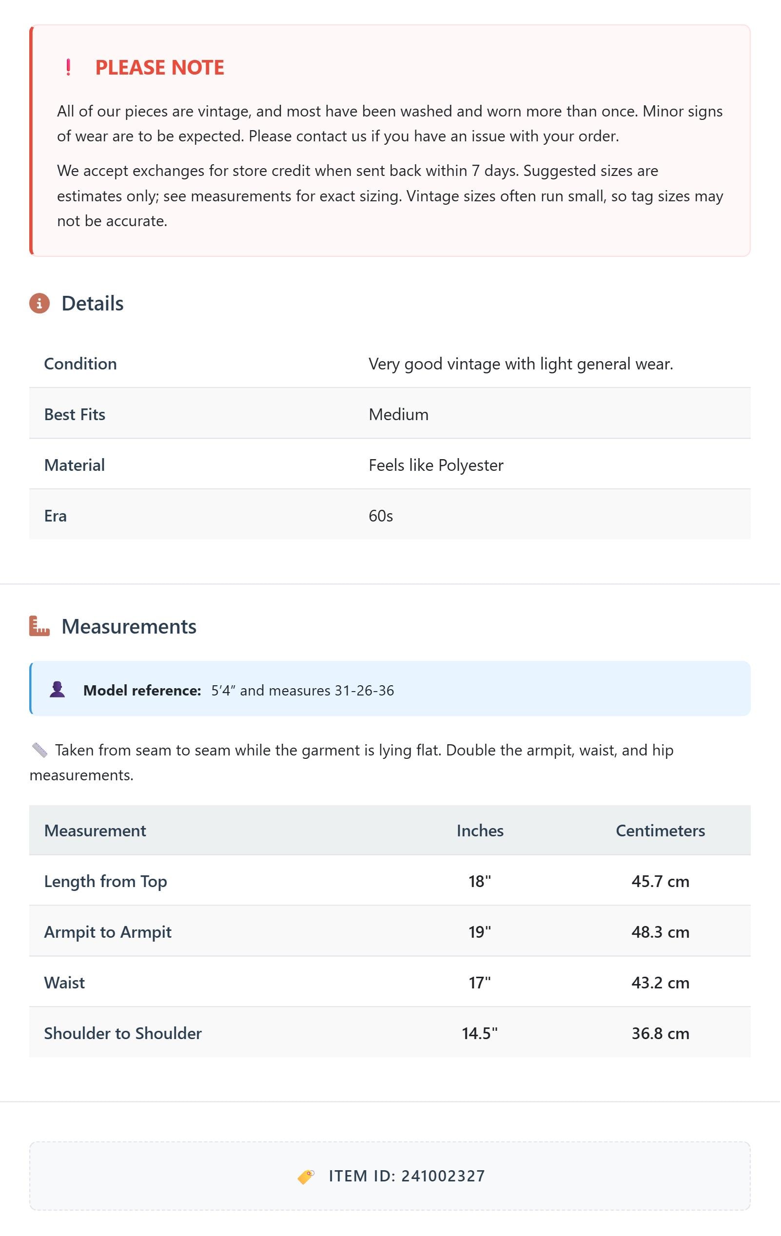 Suggested sizes are estimates only; see measurements for exact sizing. Vintage sizes often run small, so tag sizes may not be accurate.