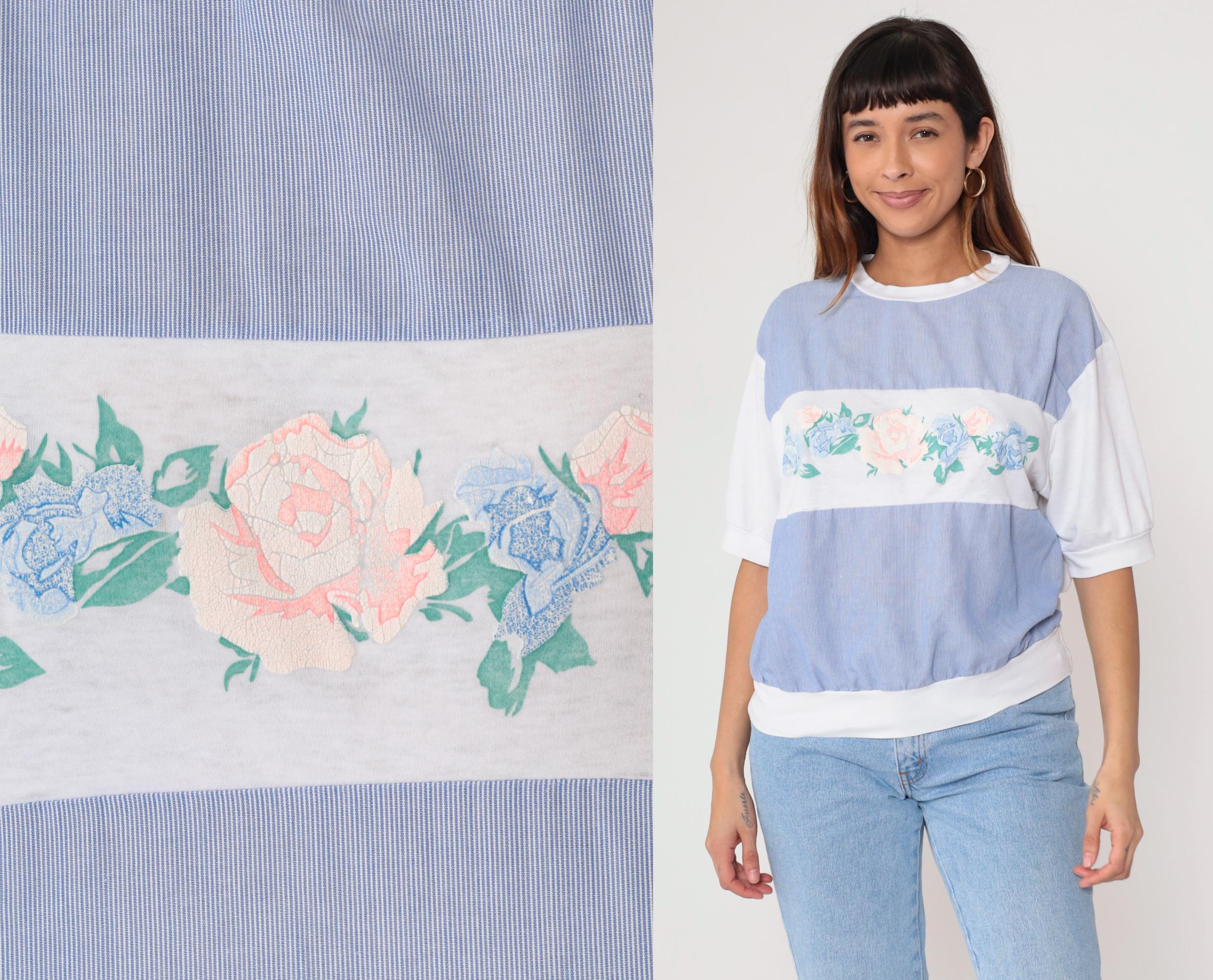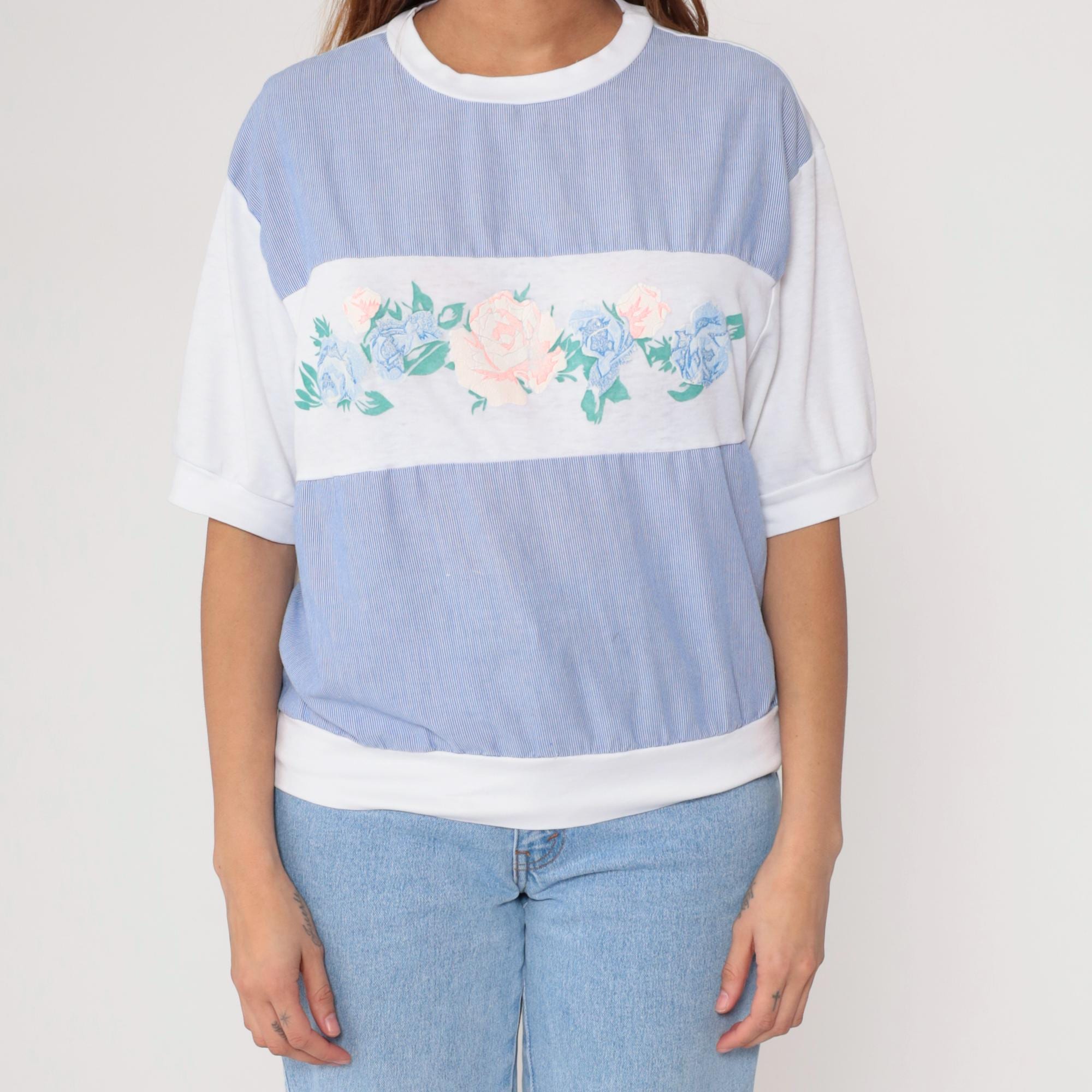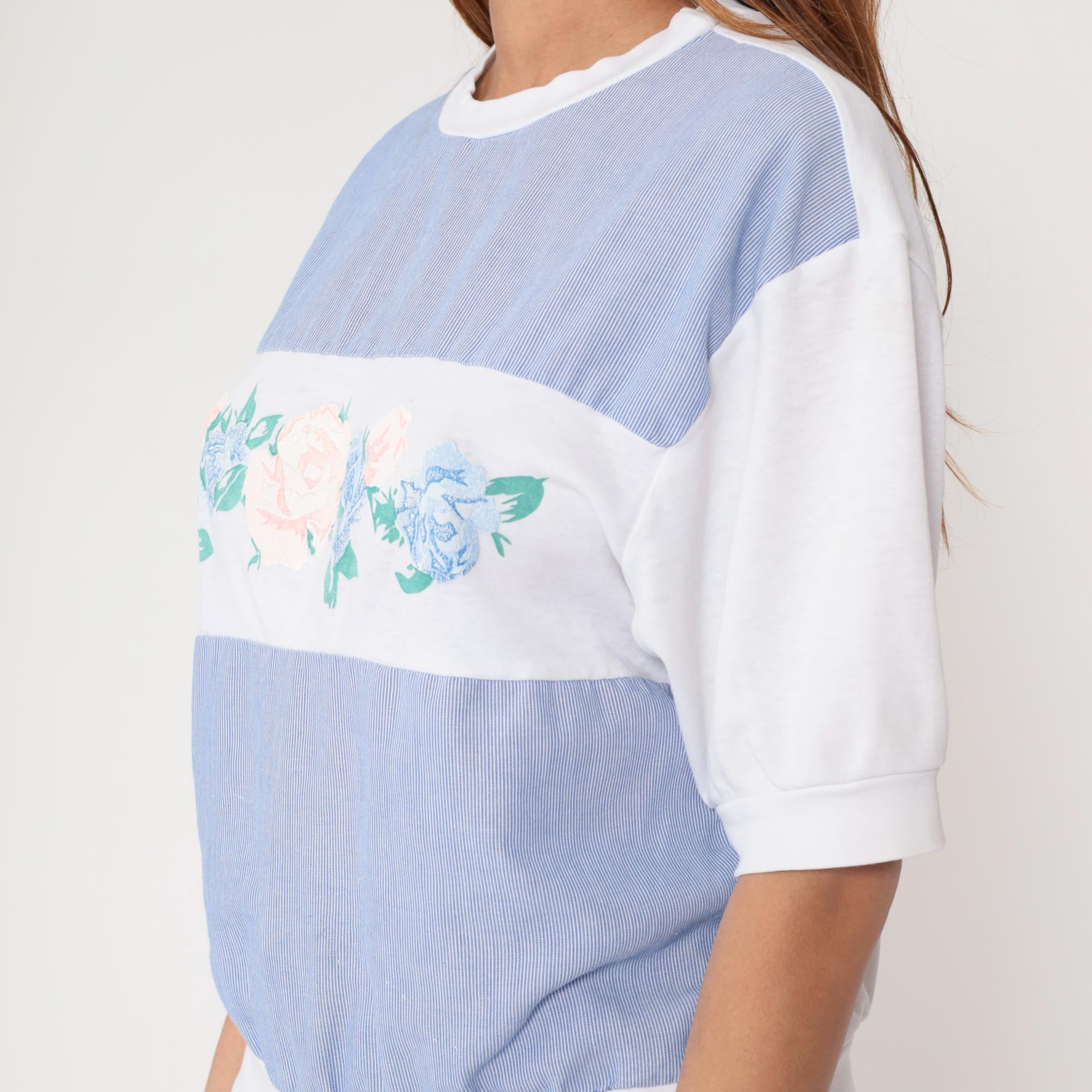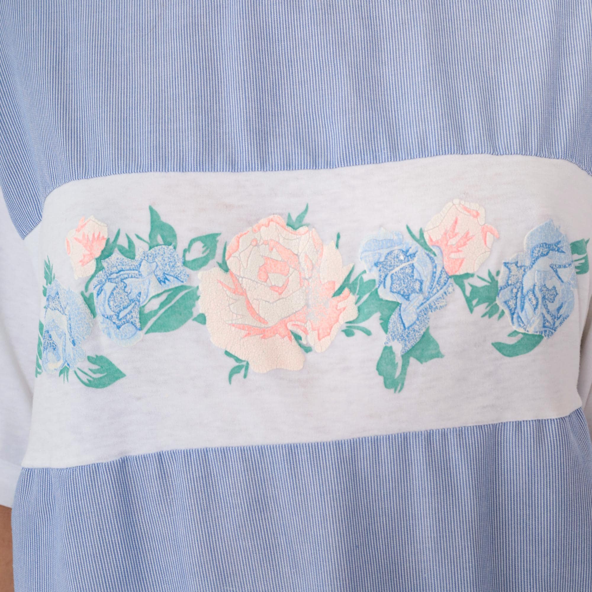 90s short sleeve top featuring blue vertical stripes with central white panel of pink and blue rose print. Ribbed white collar, cuffs and waistband.