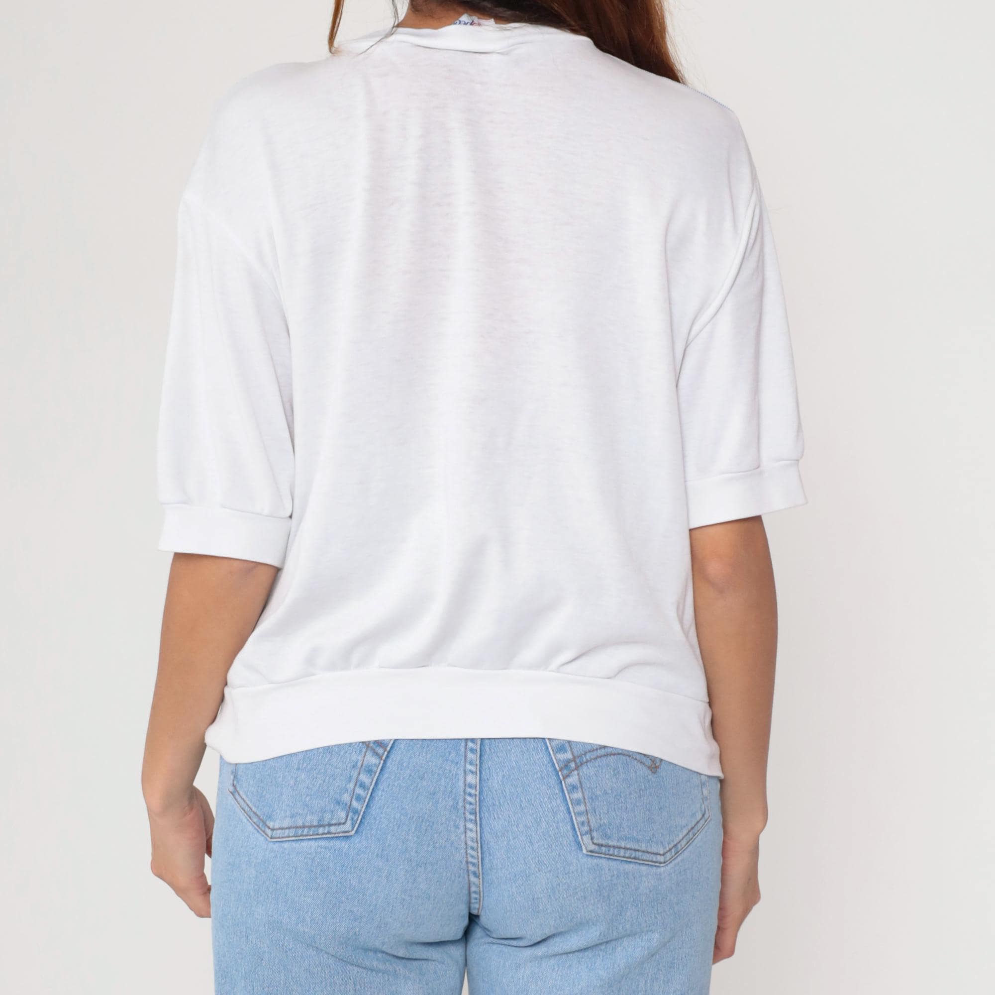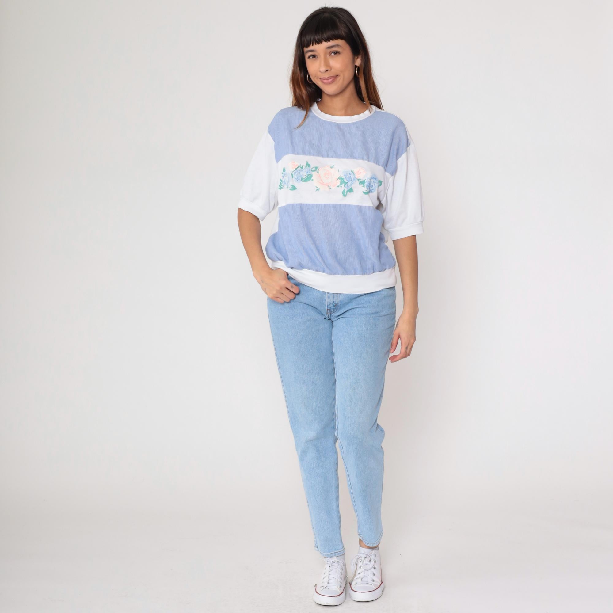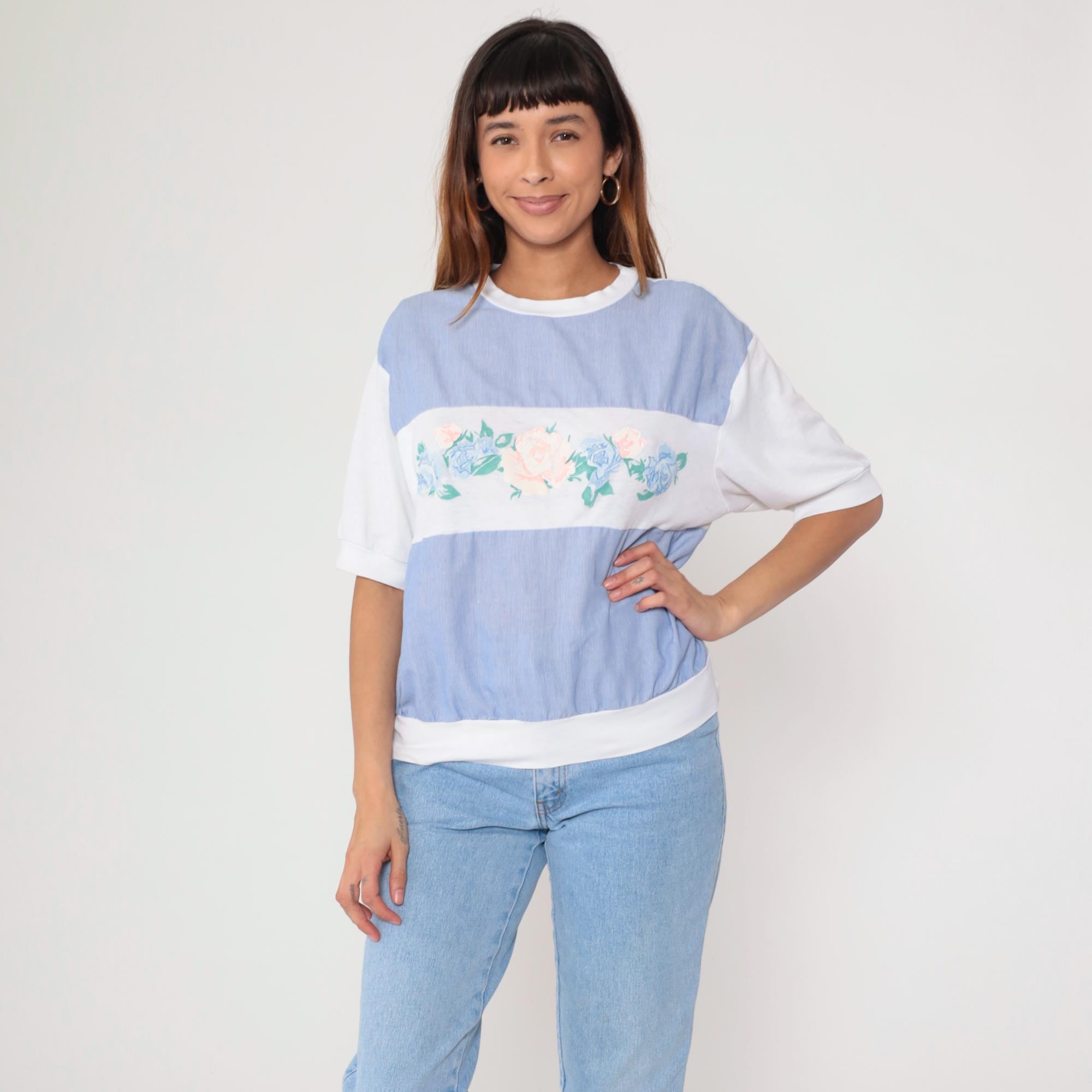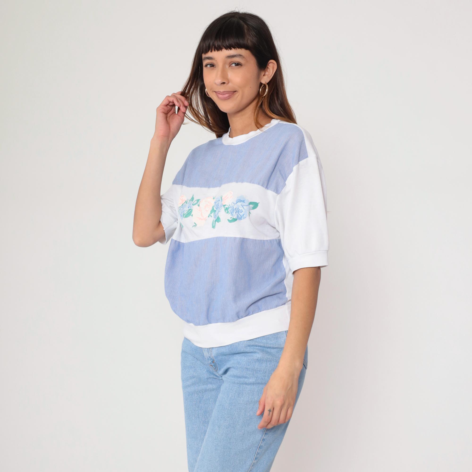90s short sleeve top featuring blue vertical stripes with central white panel of pink and blue rose print. Ribbed white collar, cuffs and waistband.