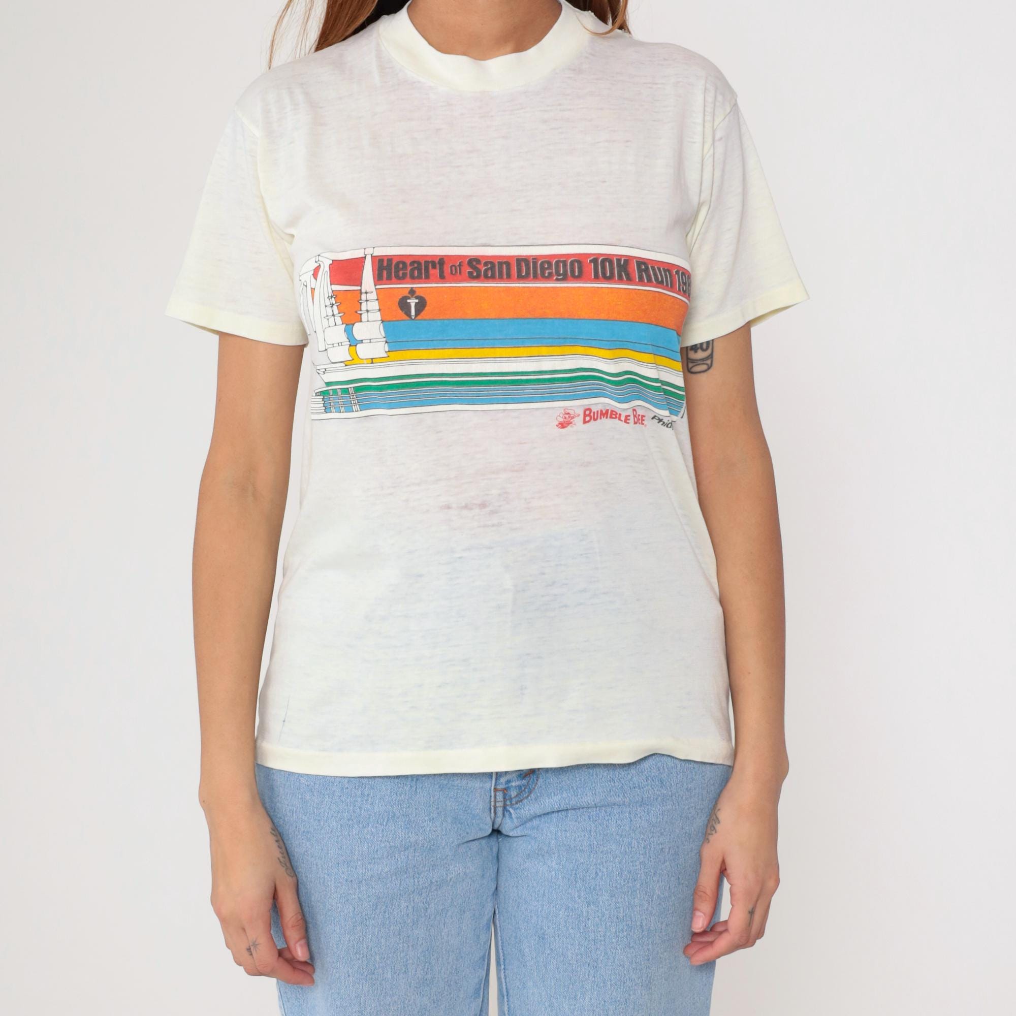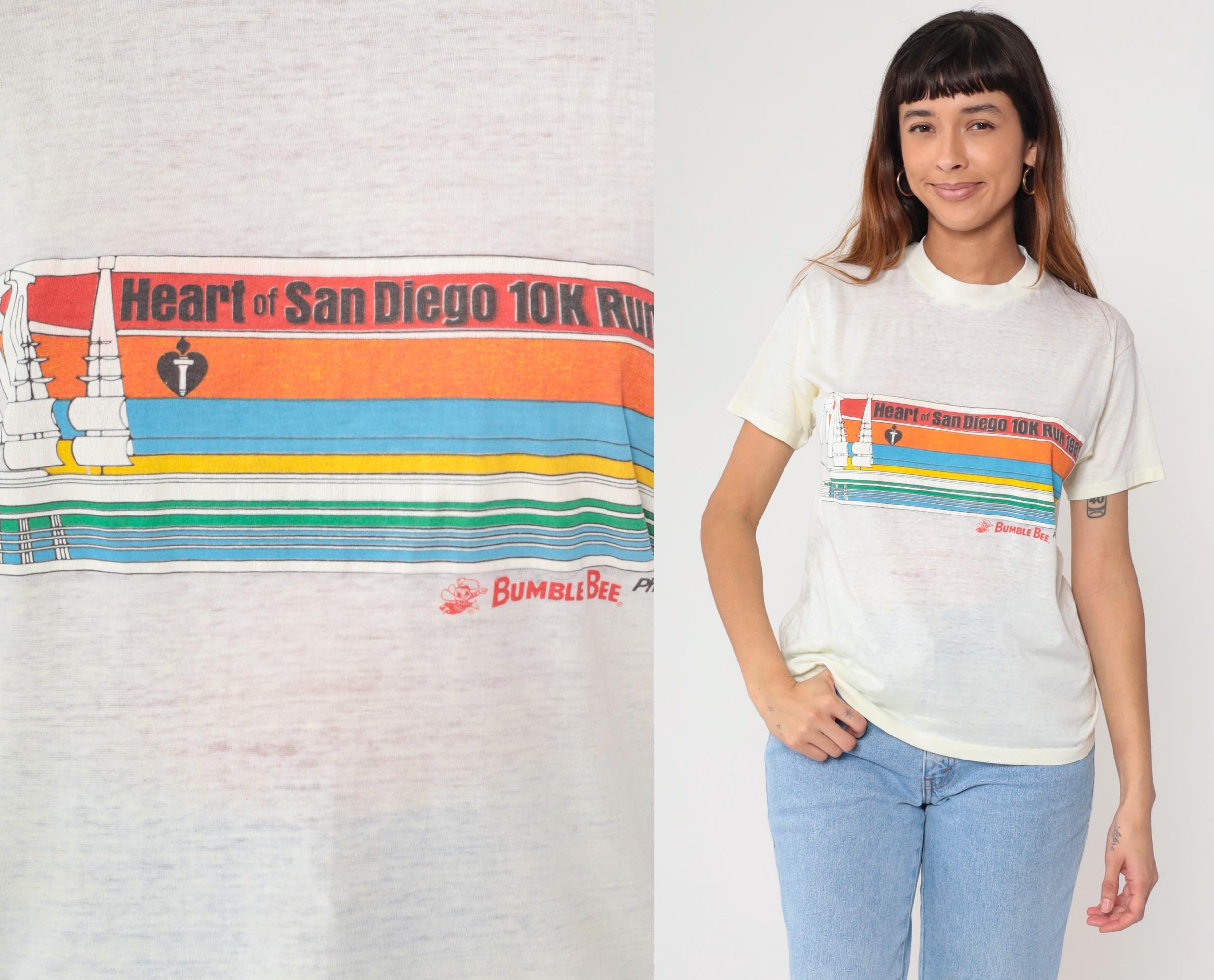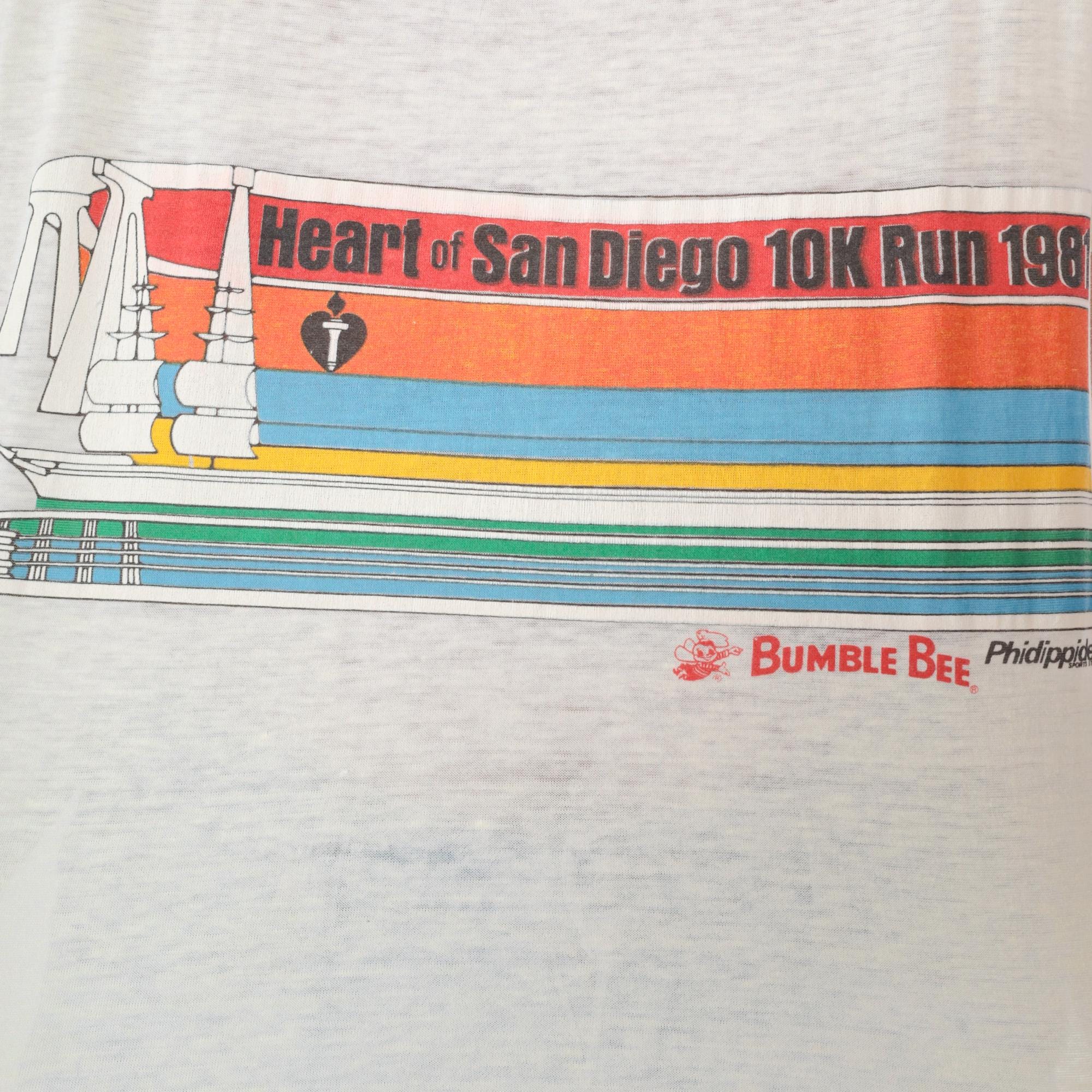 80s Yellow t-shirt from Heart of San Diego 10K Run featuring rainbow stripe graphic with building silhouette. Bumblebee logo at bottom.