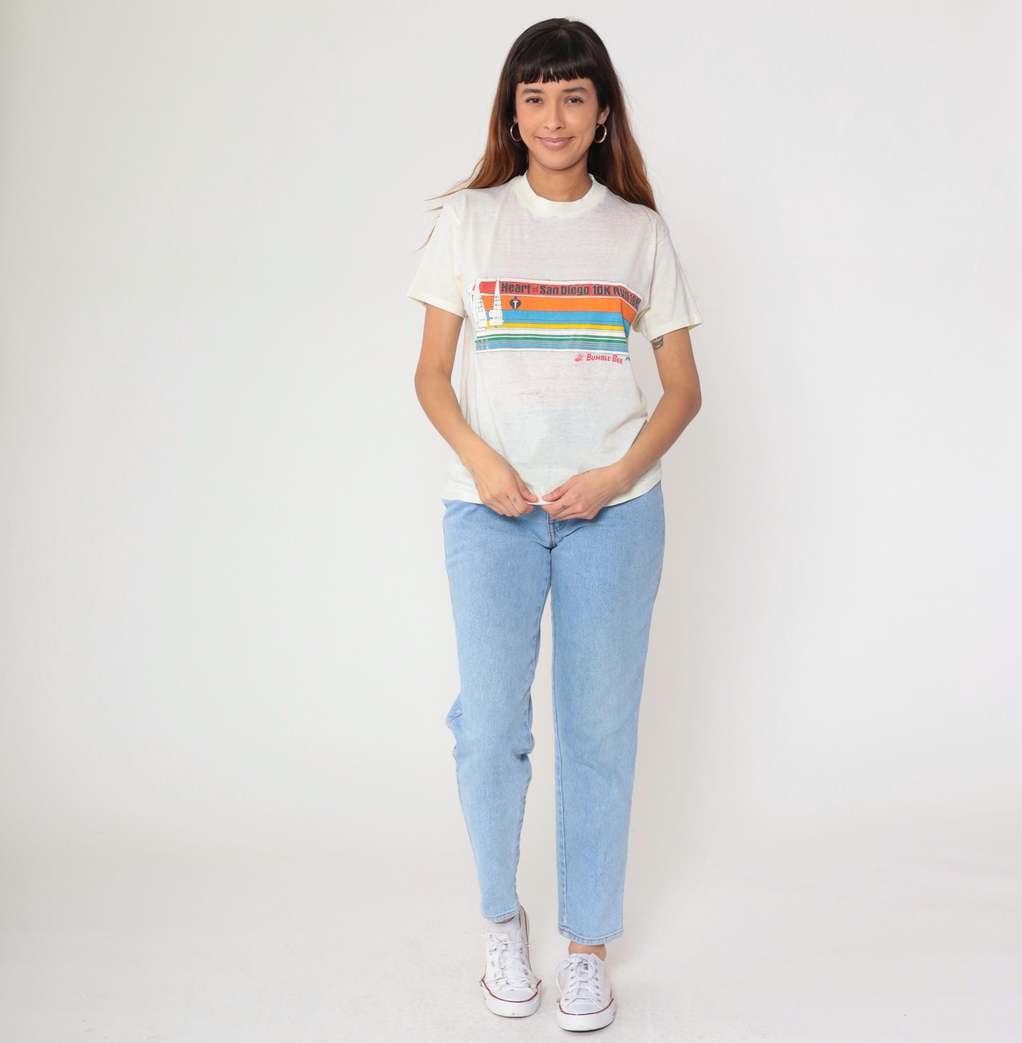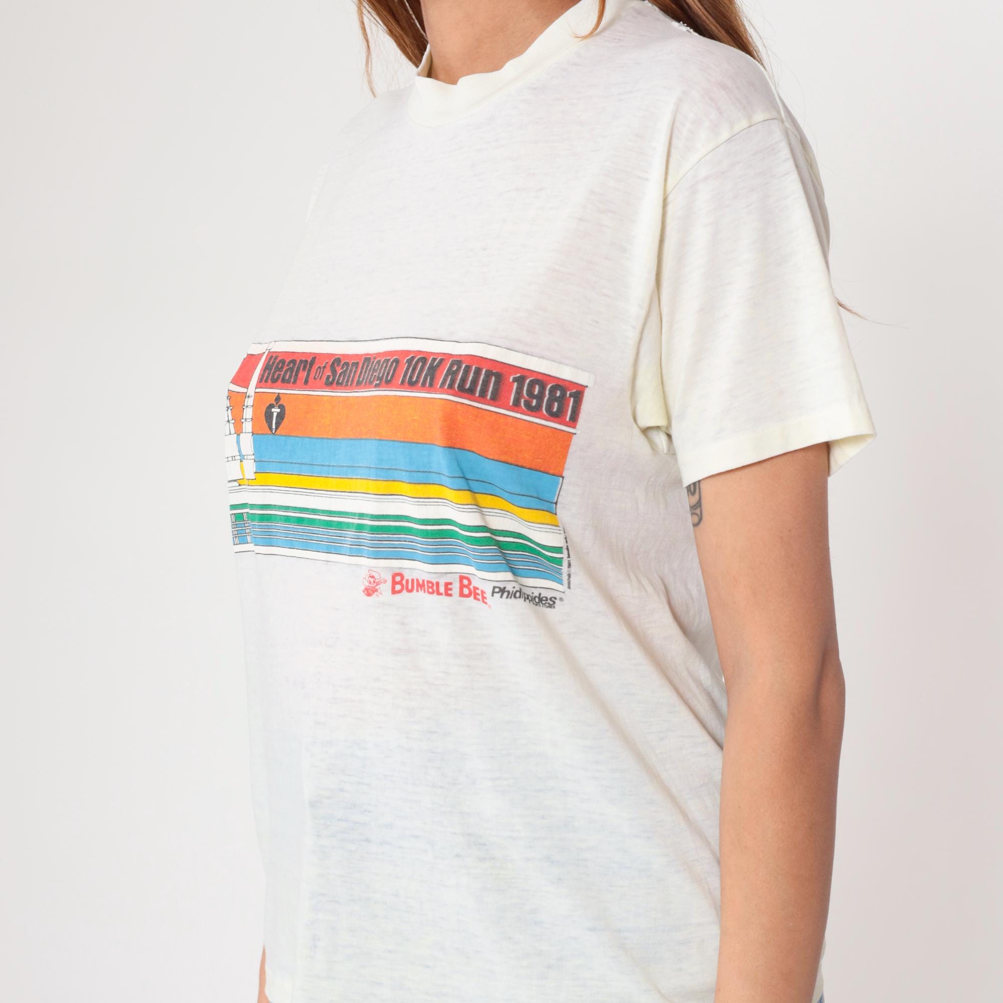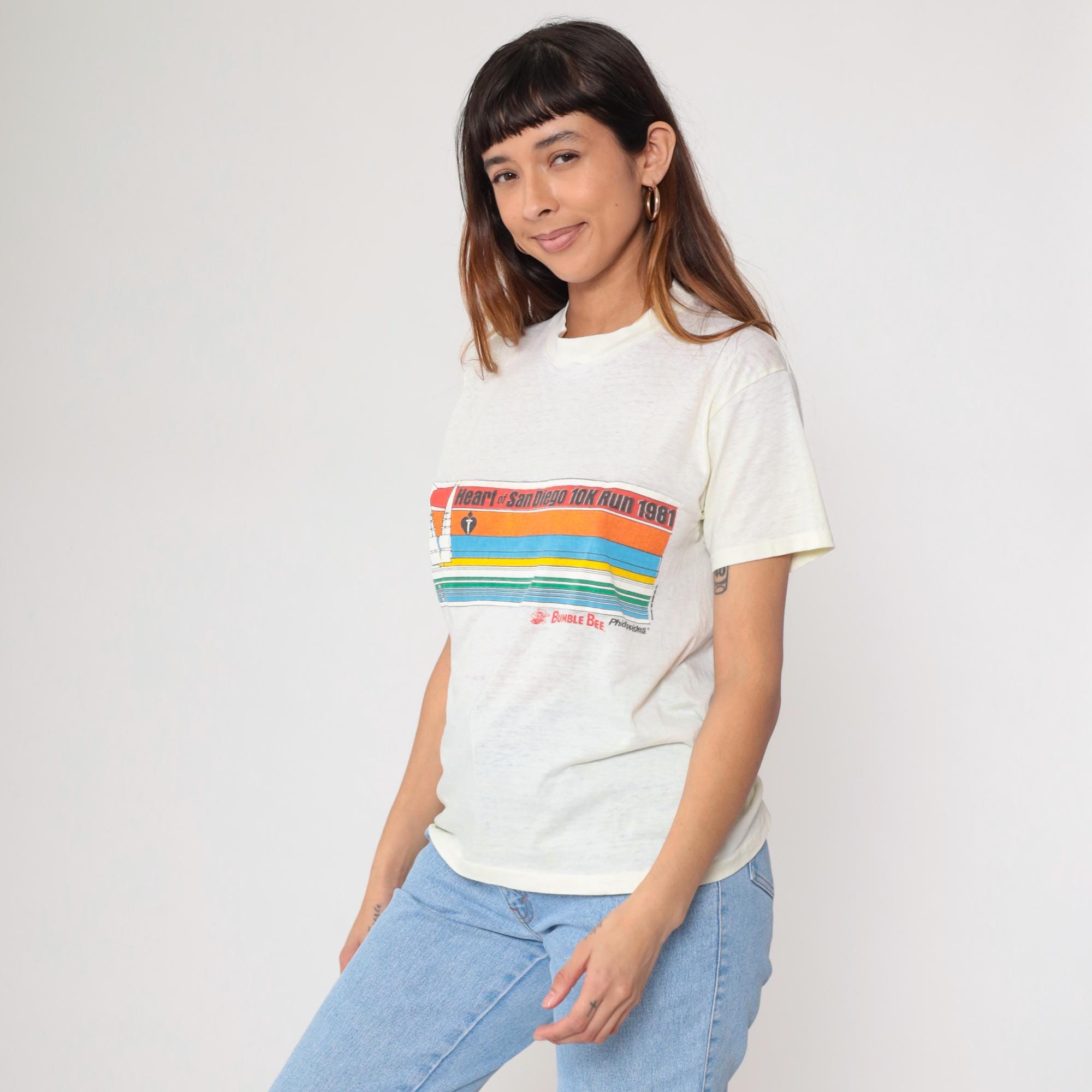80s Yellow t-shirt from Heart of San Diego 10K Run featuring rainbow stripe graphic with building silhouette. Bumblebee logo at bottom.