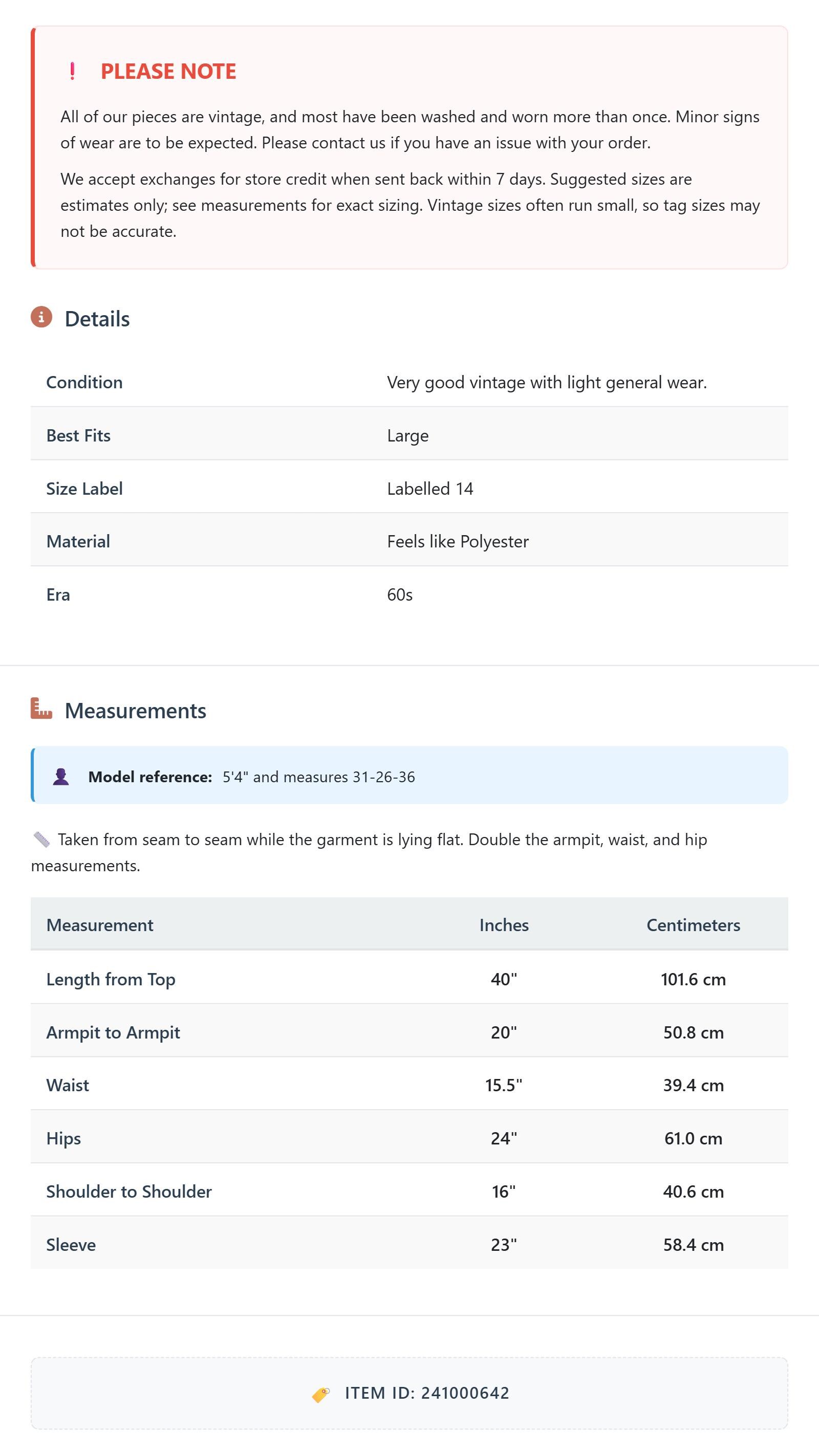 Suggested sizes are estimates only; see measurements for exact sizing. Vintage sizes often run small, so tag sizes may not be accurate.