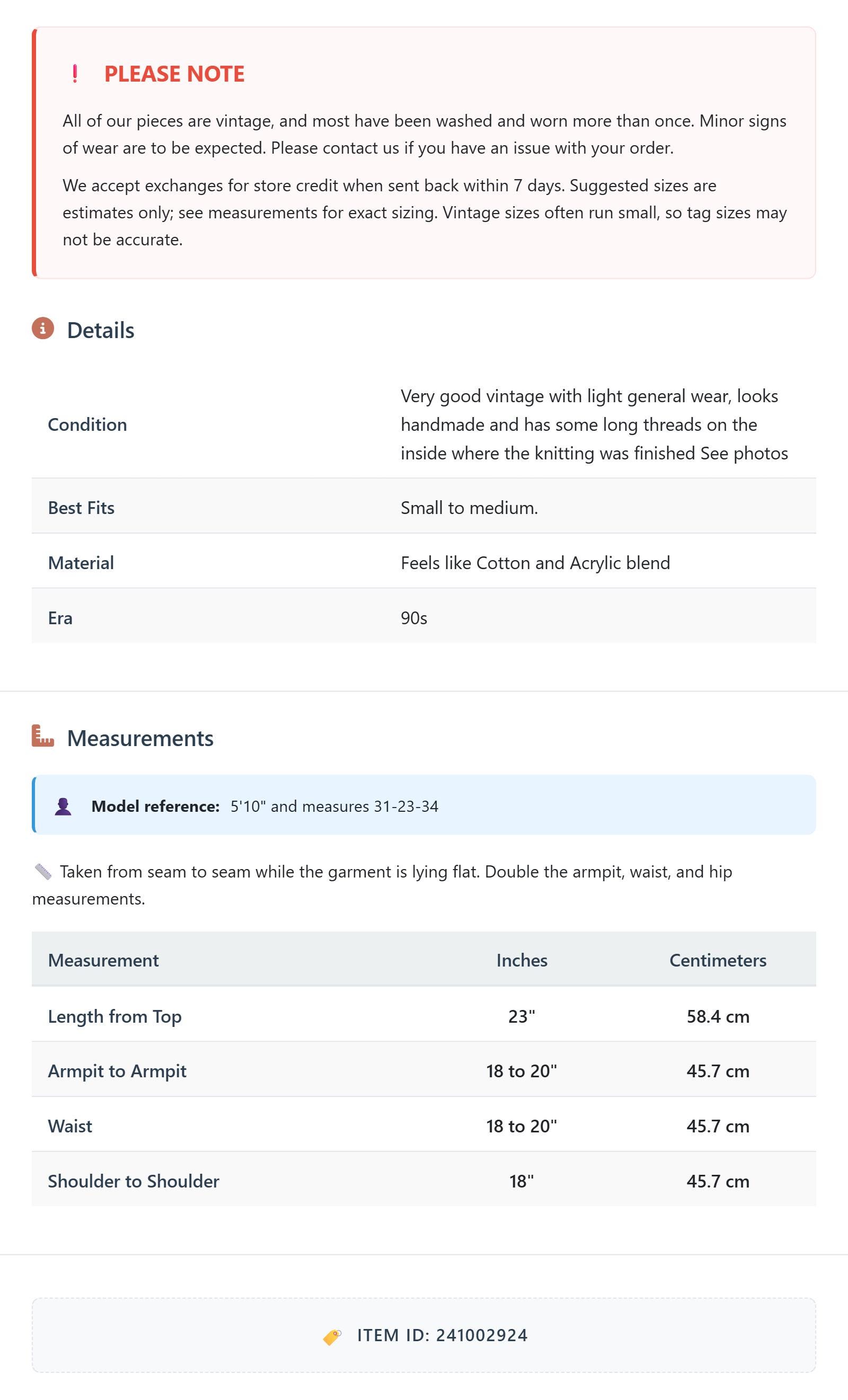 All of our pieces are vintage, and most have been washed and worn more than once. Minor signs of wear are to be expected. Please contact us if you have an issue with your order. We accept exchanges for store credit when sent back within 7 days.