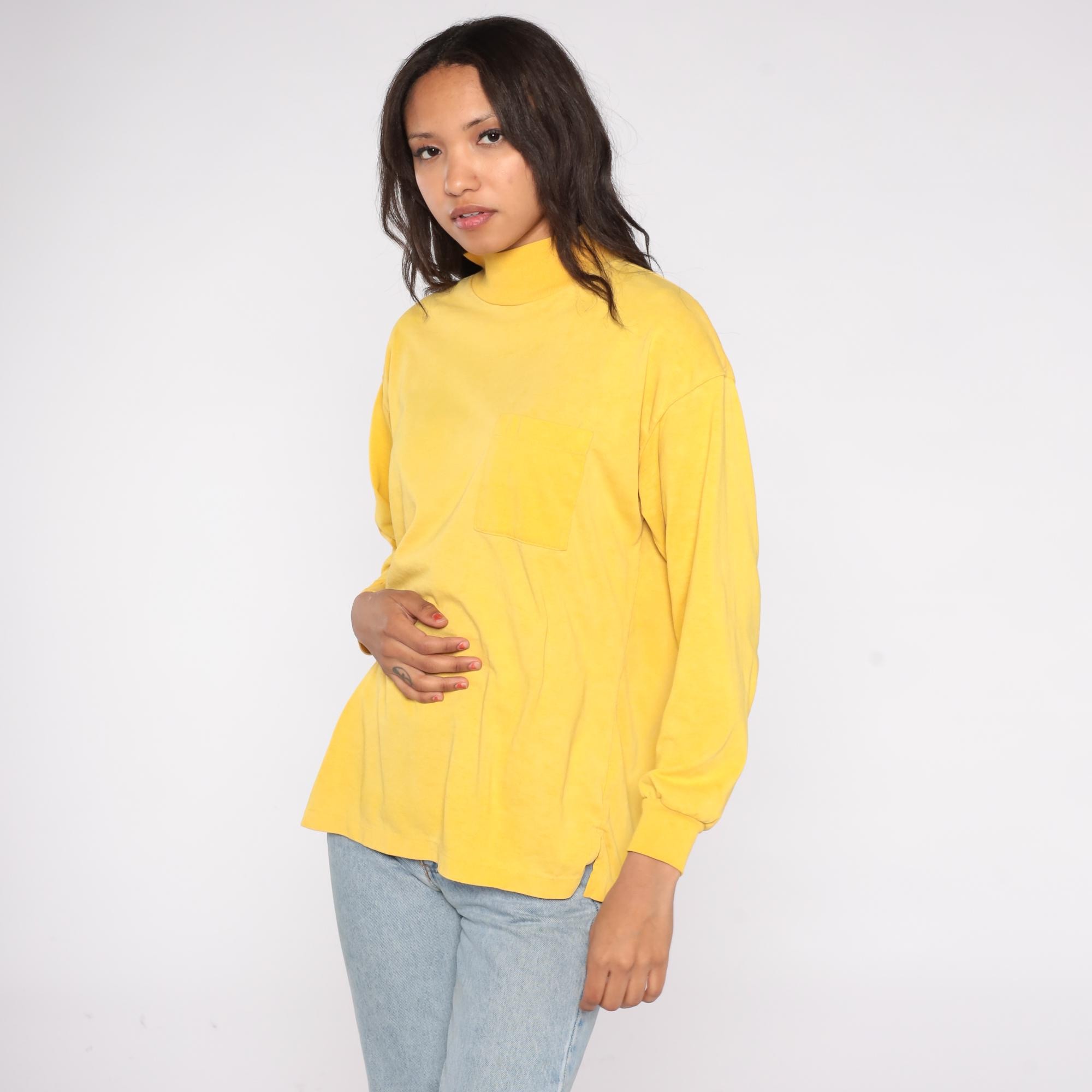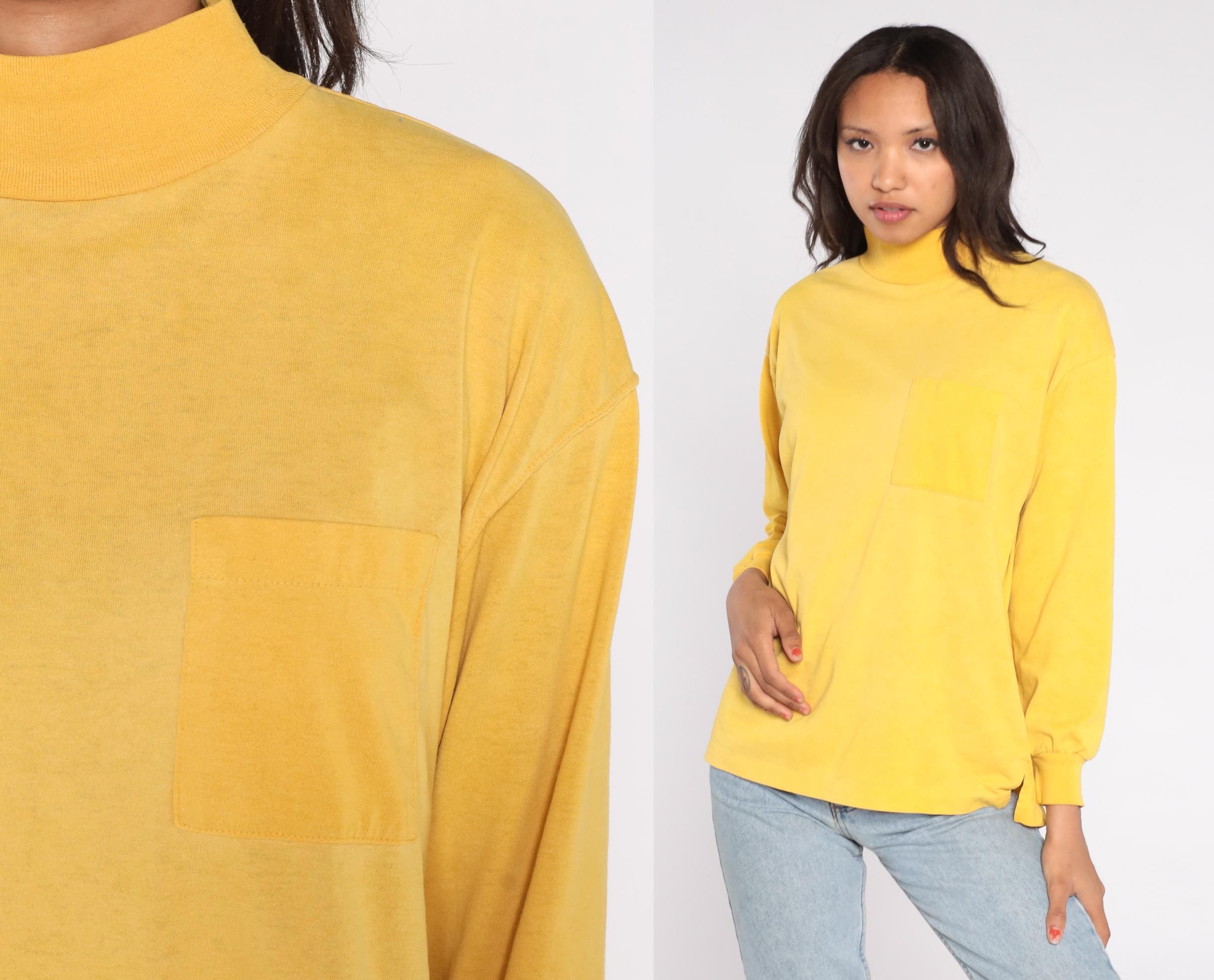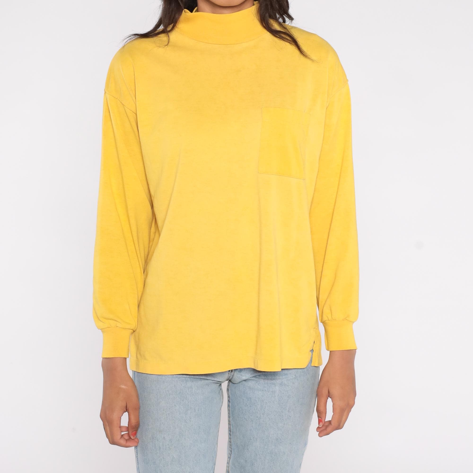 90s bright yellow mock turtleneck by Cristina featuring a clean minimal design with a single chest pocket. This vibrant sunshine-colored top has a comfortable boxy fit with dropped shoulders and ribbed collar and cuffs.