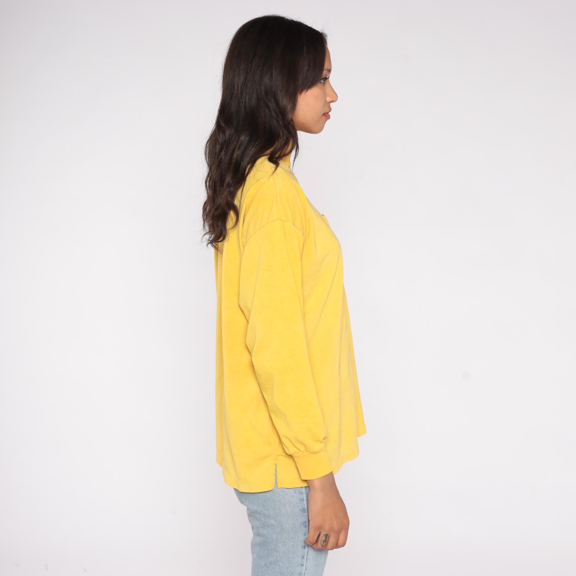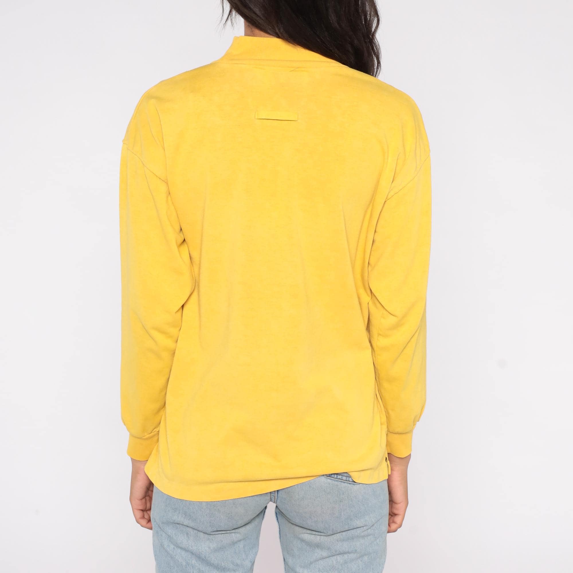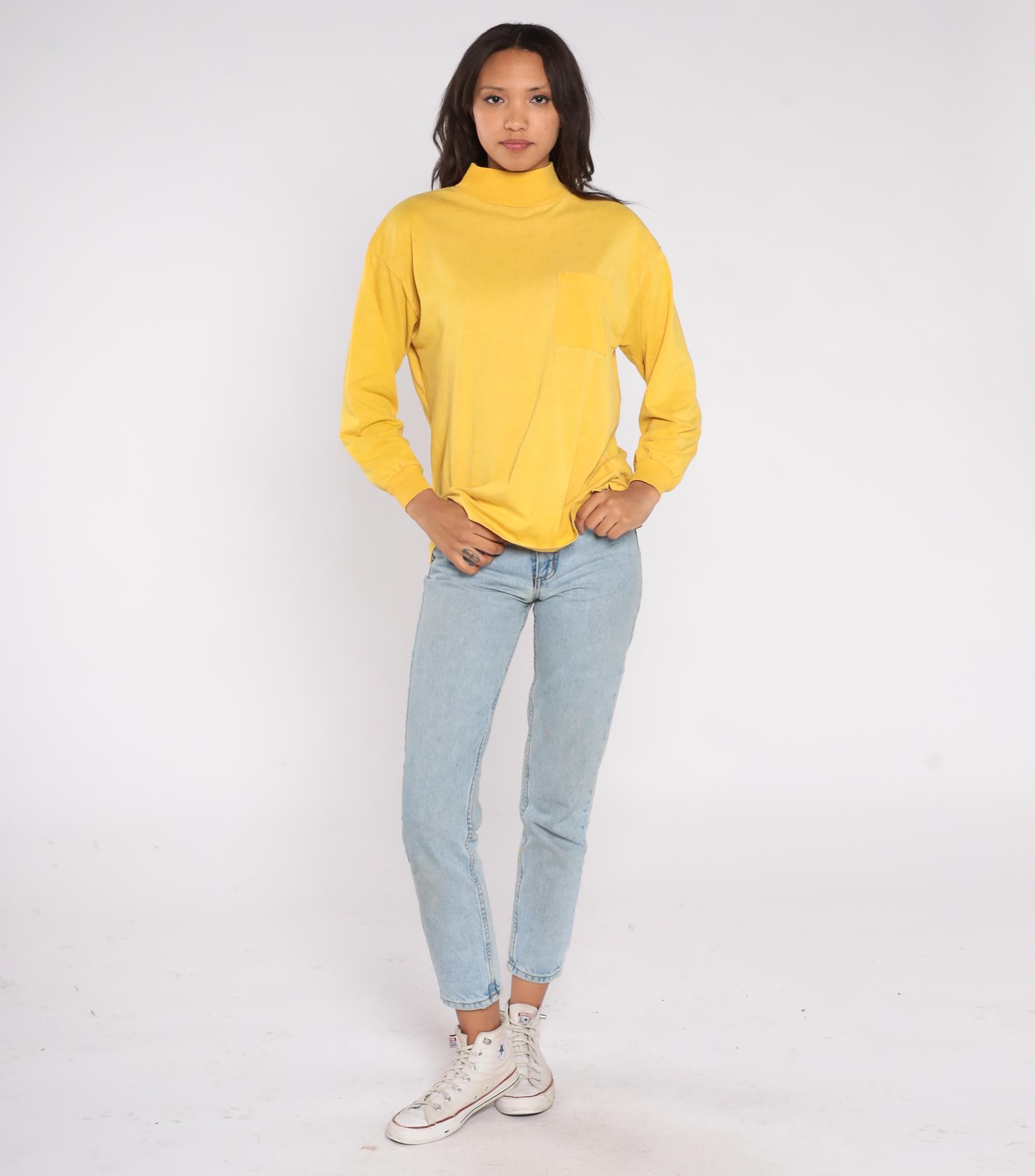 90s bright yellow mock turtleneck by Cristina featuring a clean minimal design with a single chest pocket. This vibrant sunshine-colored top has a comfortable boxy fit with dropped shoulders and ribbed collar and cuffs.