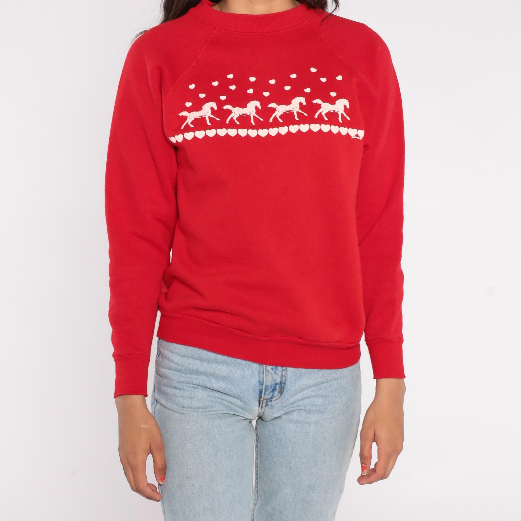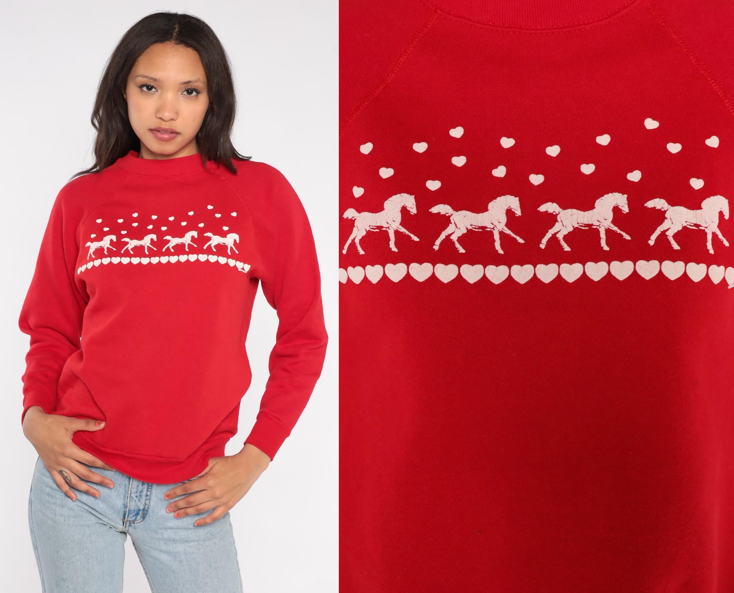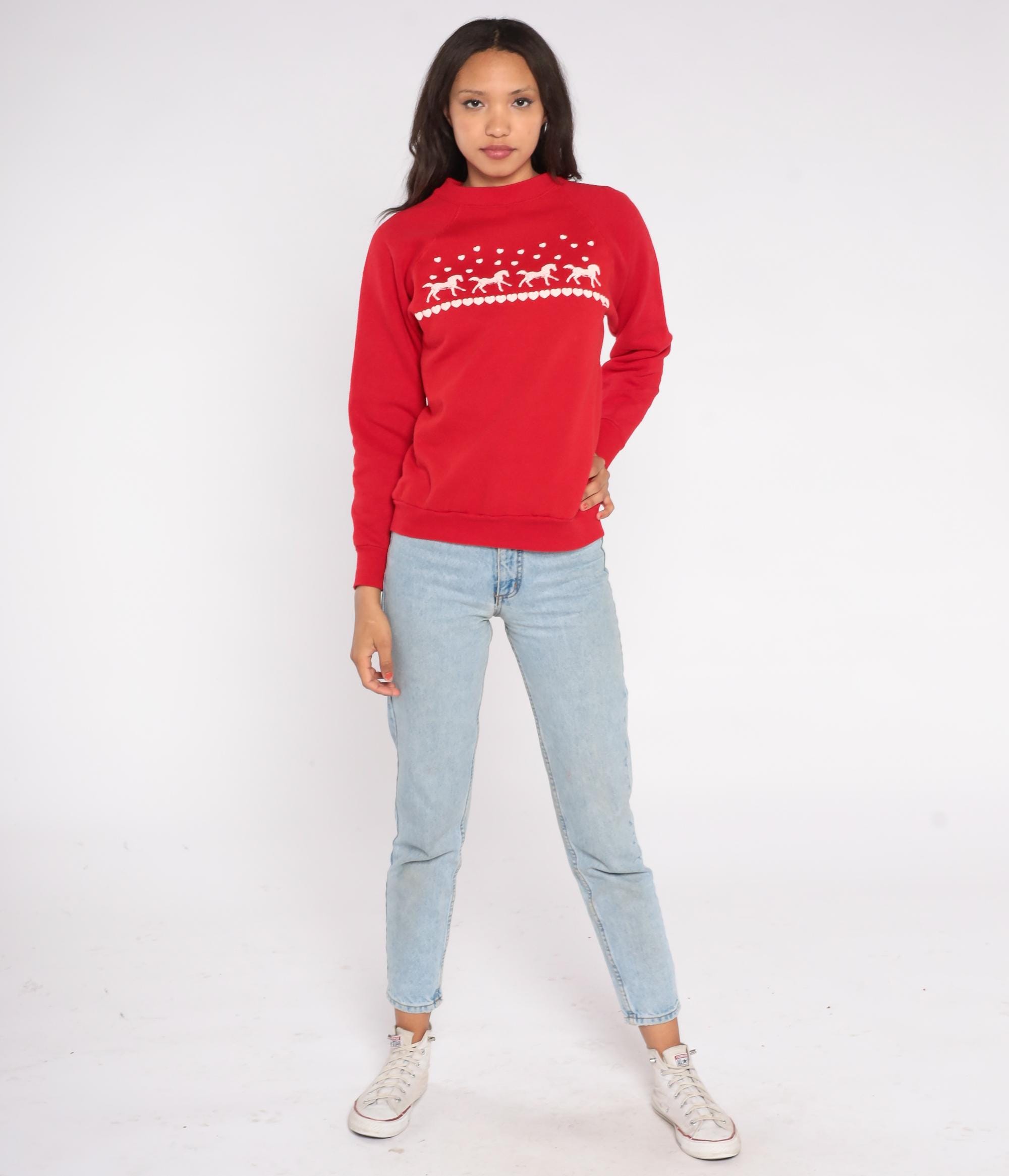 80s red sweatshirt by Joy Brass featuring a charming Nordic-inspired horse pattern. This festive pullover showcases a horizontal band of galloping white horses bordered by rows of hearts on a vibrant red background. The folk art style creates a distinctive fairisle-inspired look that's perfect for the holiday season. Classic raglan sleeve construction with ribbed crew neckline, cuffs, and hem provides a traditional fit. This sweatshirt combines nostalgic 80s folk style with a whimsical horse pattern that remains popular in contemporary fashion.