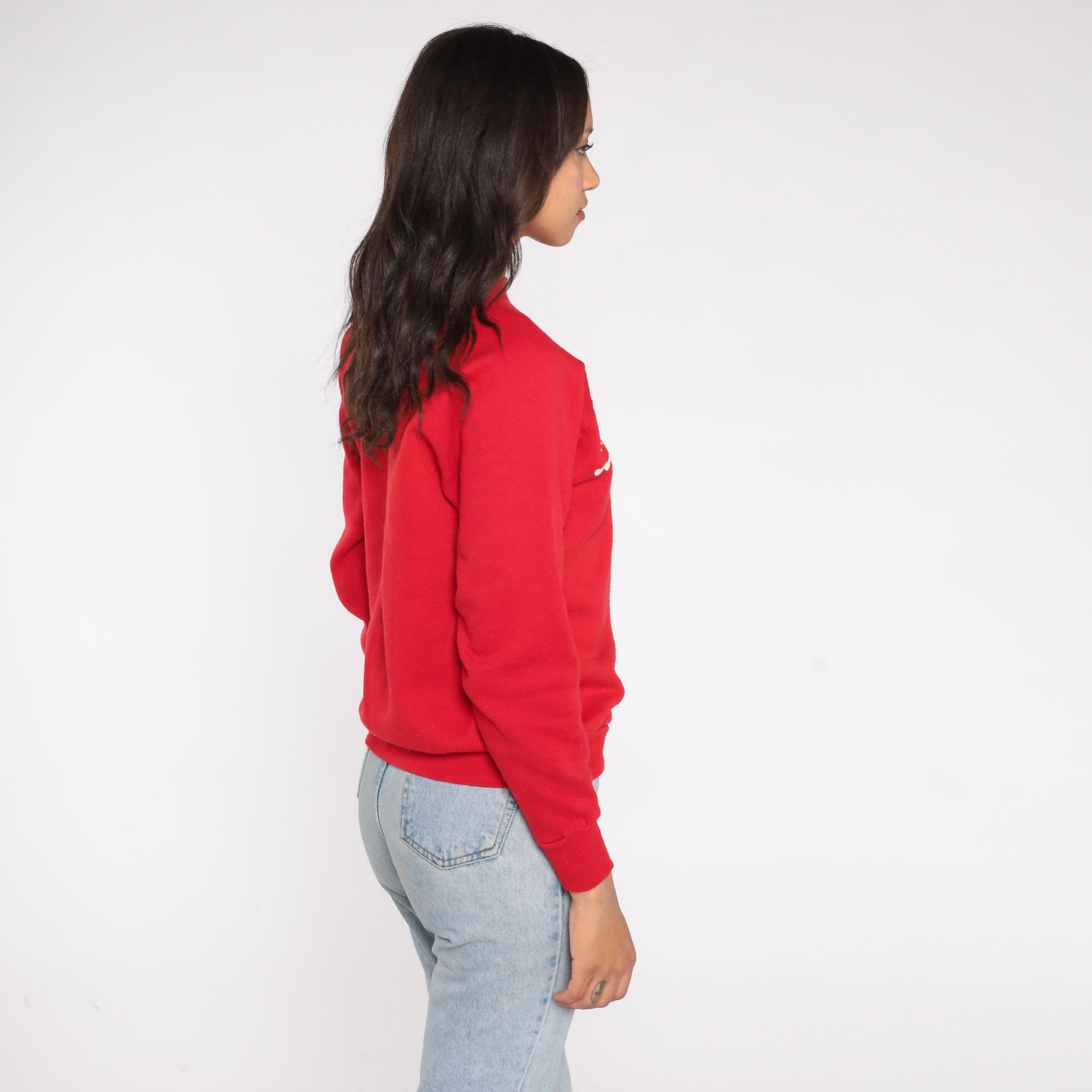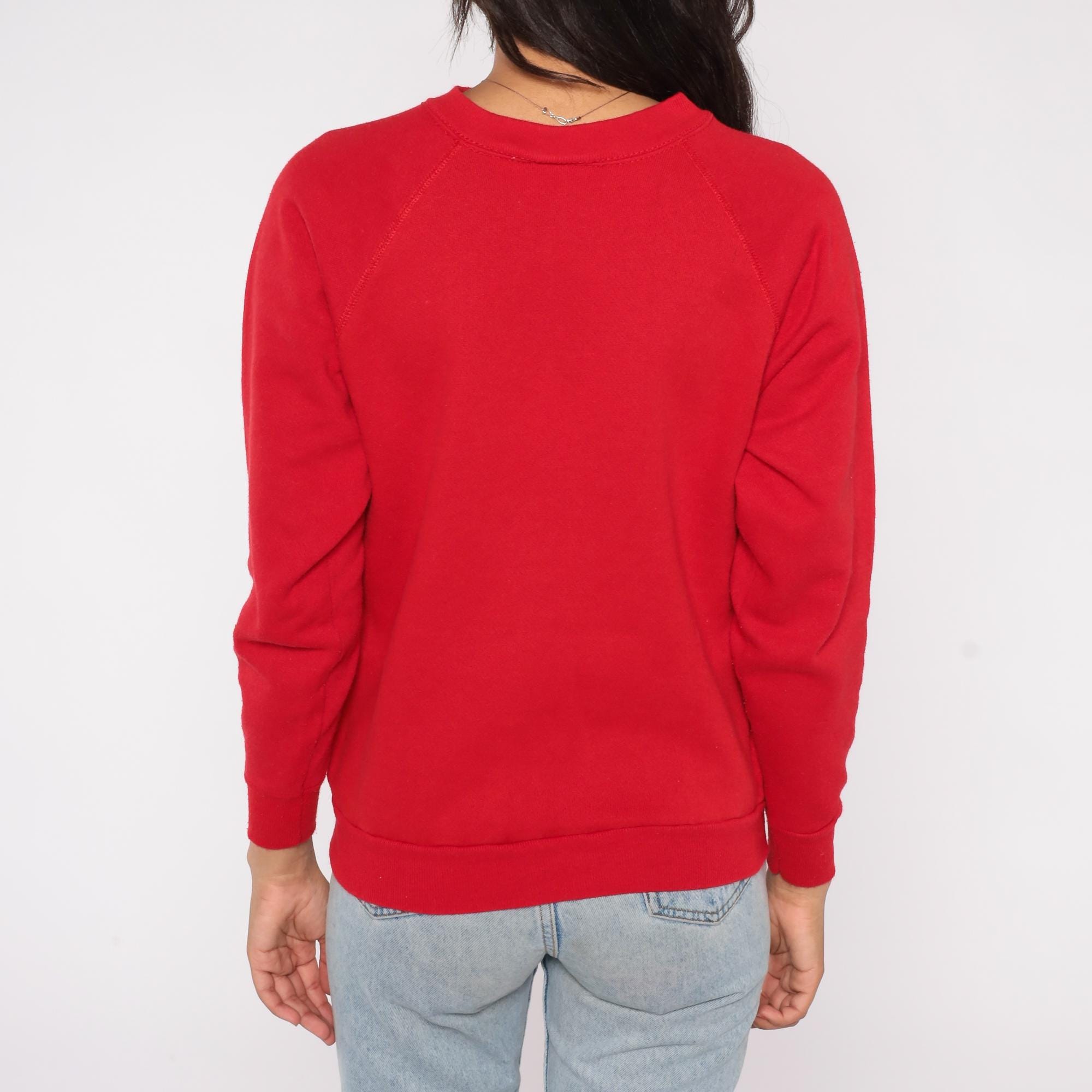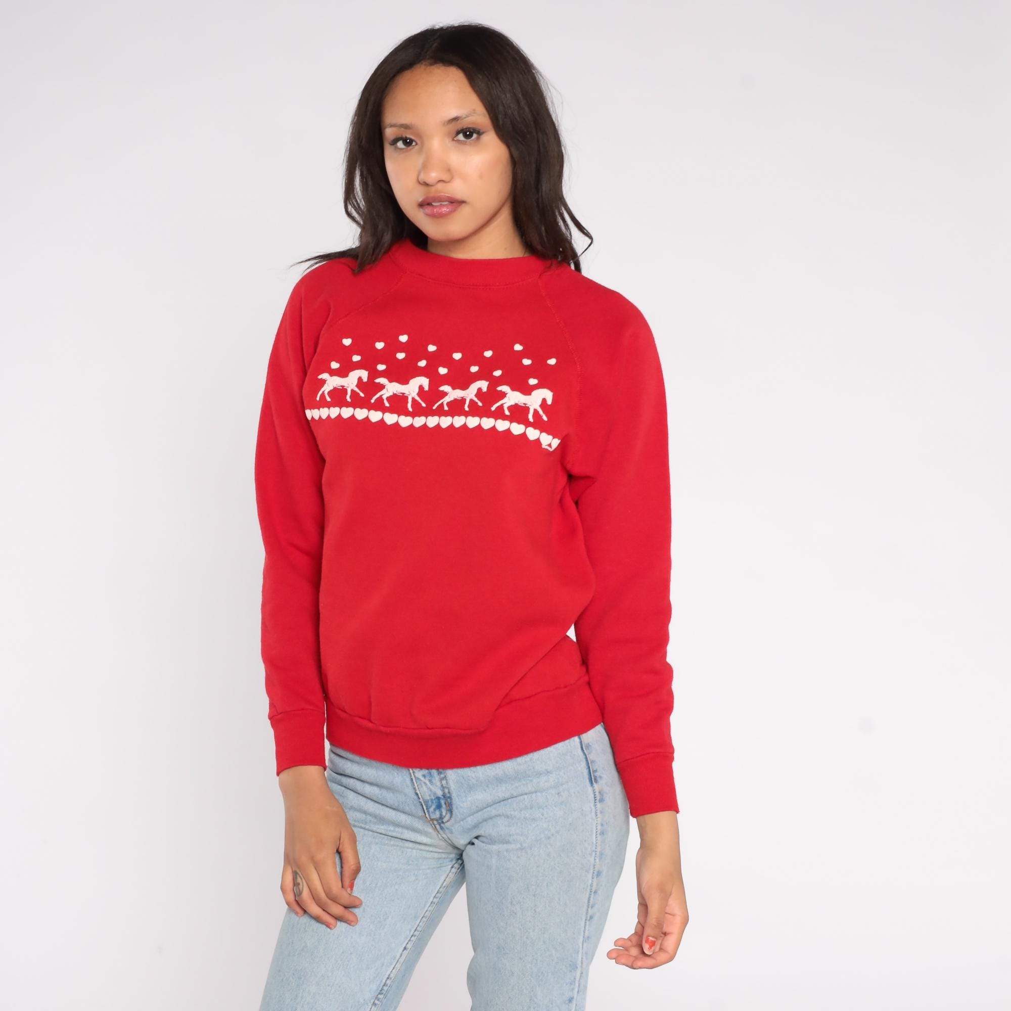 80s red sweatshirt by Joy Brass featuring a charming Nordic-inspired horse pattern. This festive pullover showcases a horizontal band of galloping white horses bordered by rows of hearts on a vibrant red background. The folk art style creates a distinctive fairisle-inspired look that's perfect for the holiday season. Classic raglan sleeve construction with ribbed crew neckline, cuffs, and hem provides a traditional fit. This sweatshirt combines nostalgic 80s folk style with a whimsical horse pattern that remains popular in contemporary fashion.