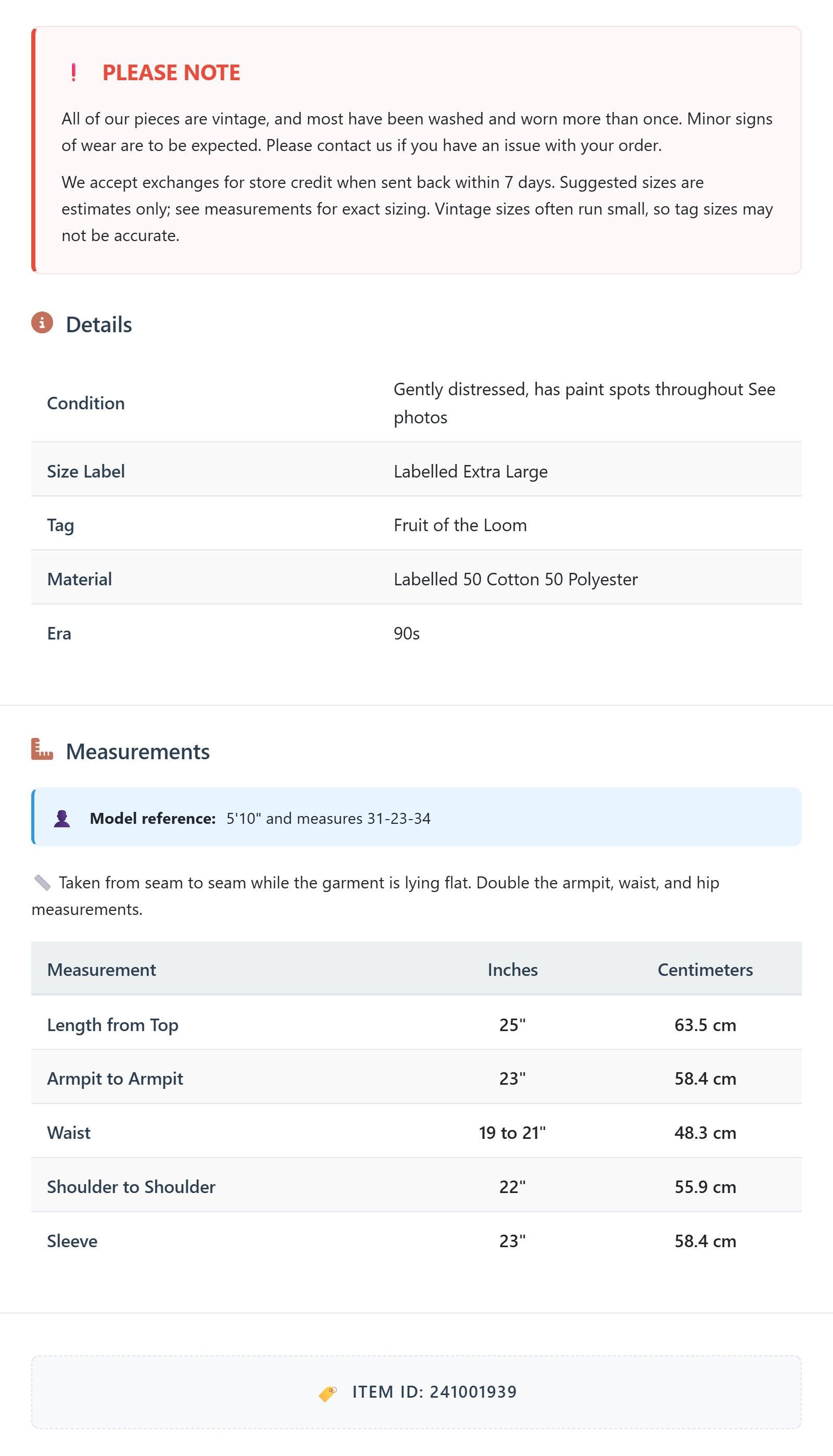 All of our pieces are vintage, and most have been washed and worn more than once. Minor signs of wear are to be expected. Please contact us if you have an issue with your order. We accept exchanges for store credit when sent back within 7 days.
