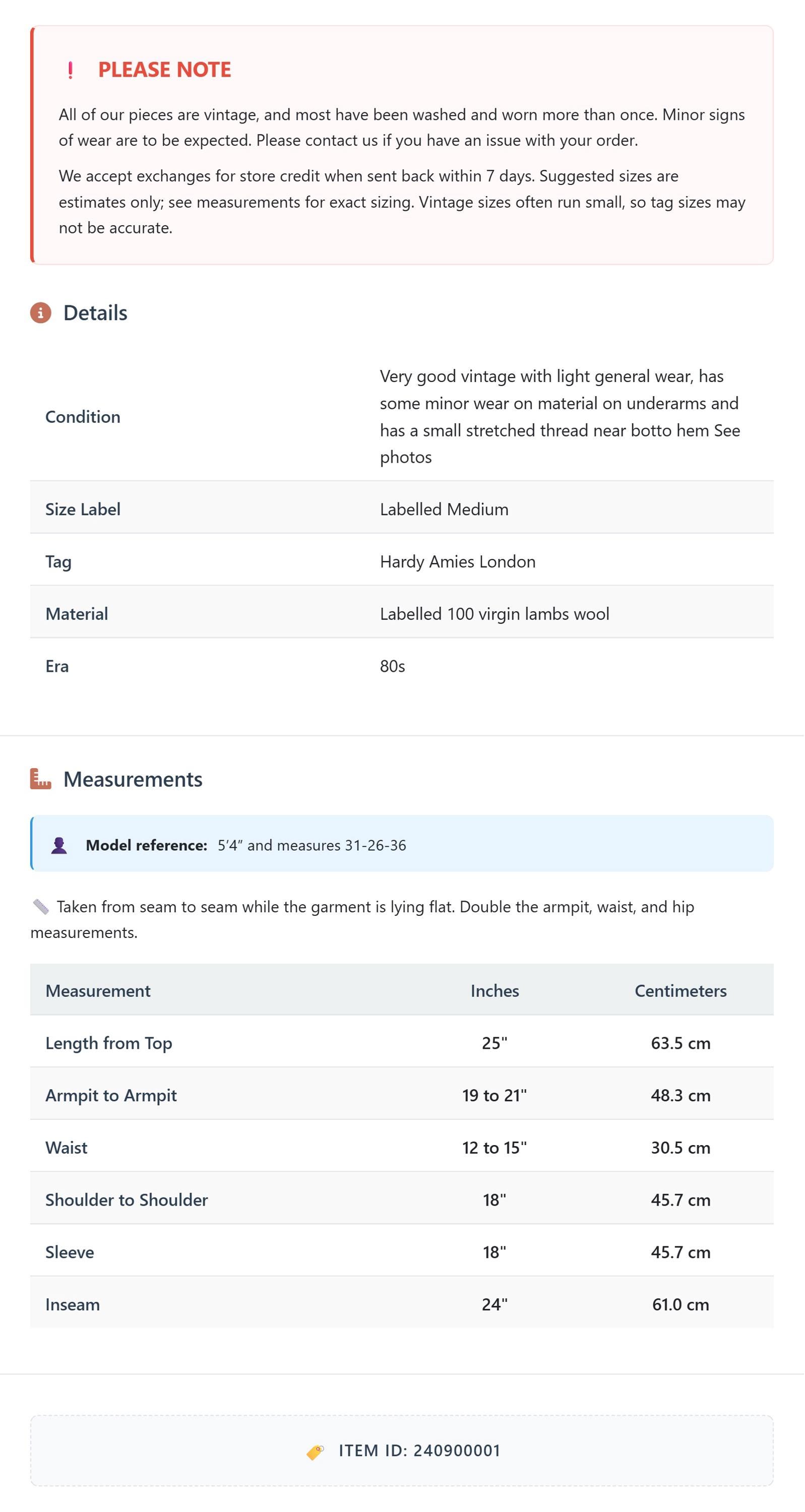 Condition: Very good vintage with light general wear, has some minor wear on material on underarms and has a small stretched thread near botto hem See photos