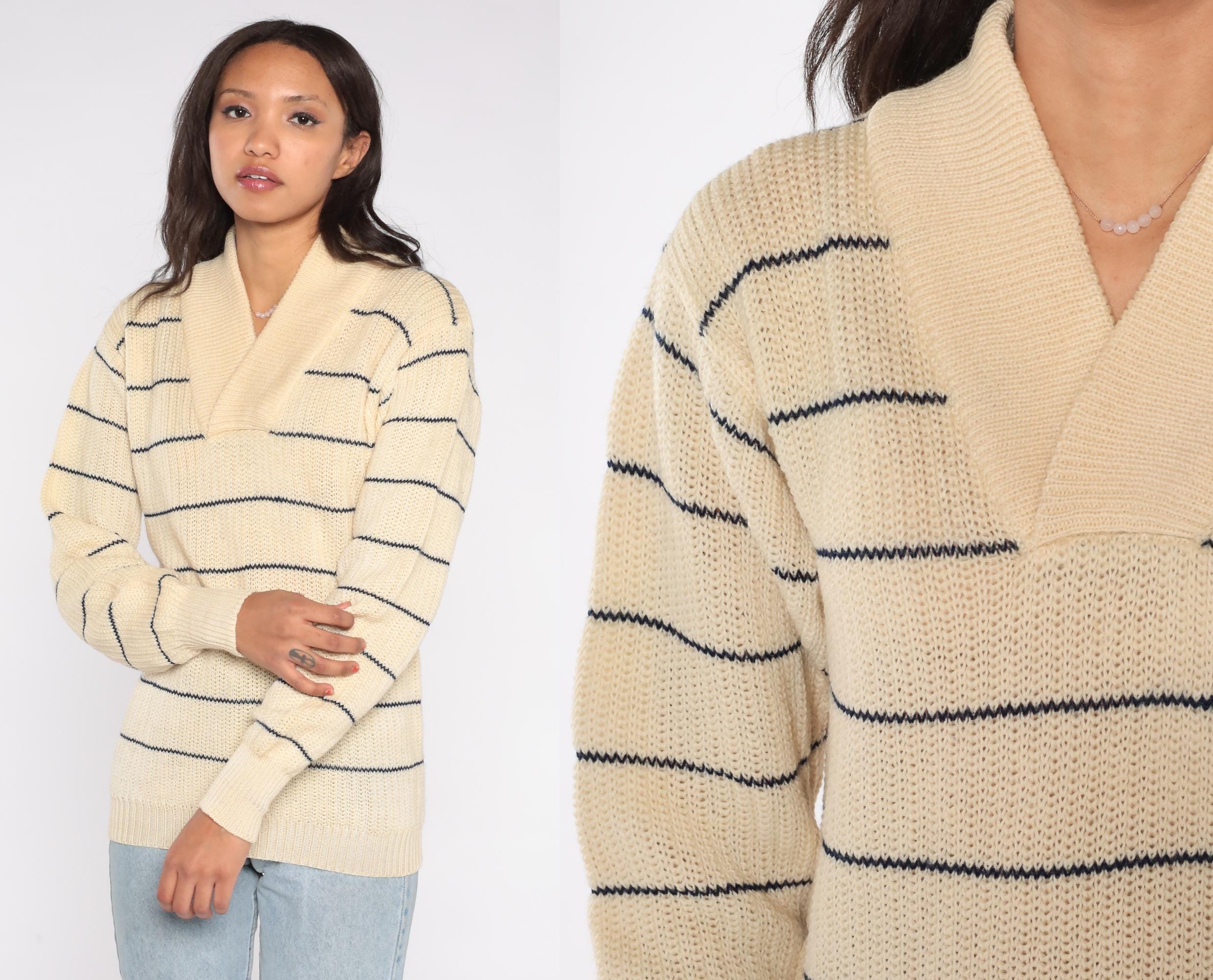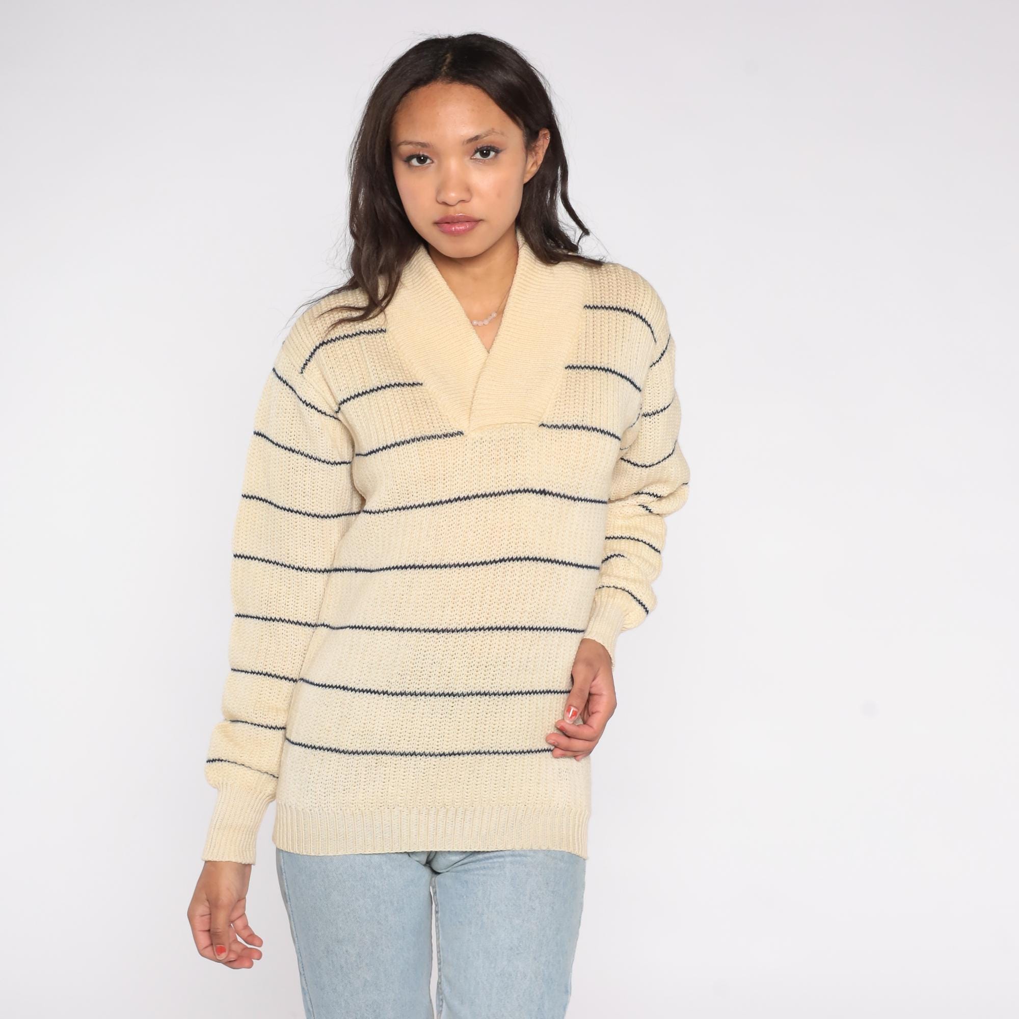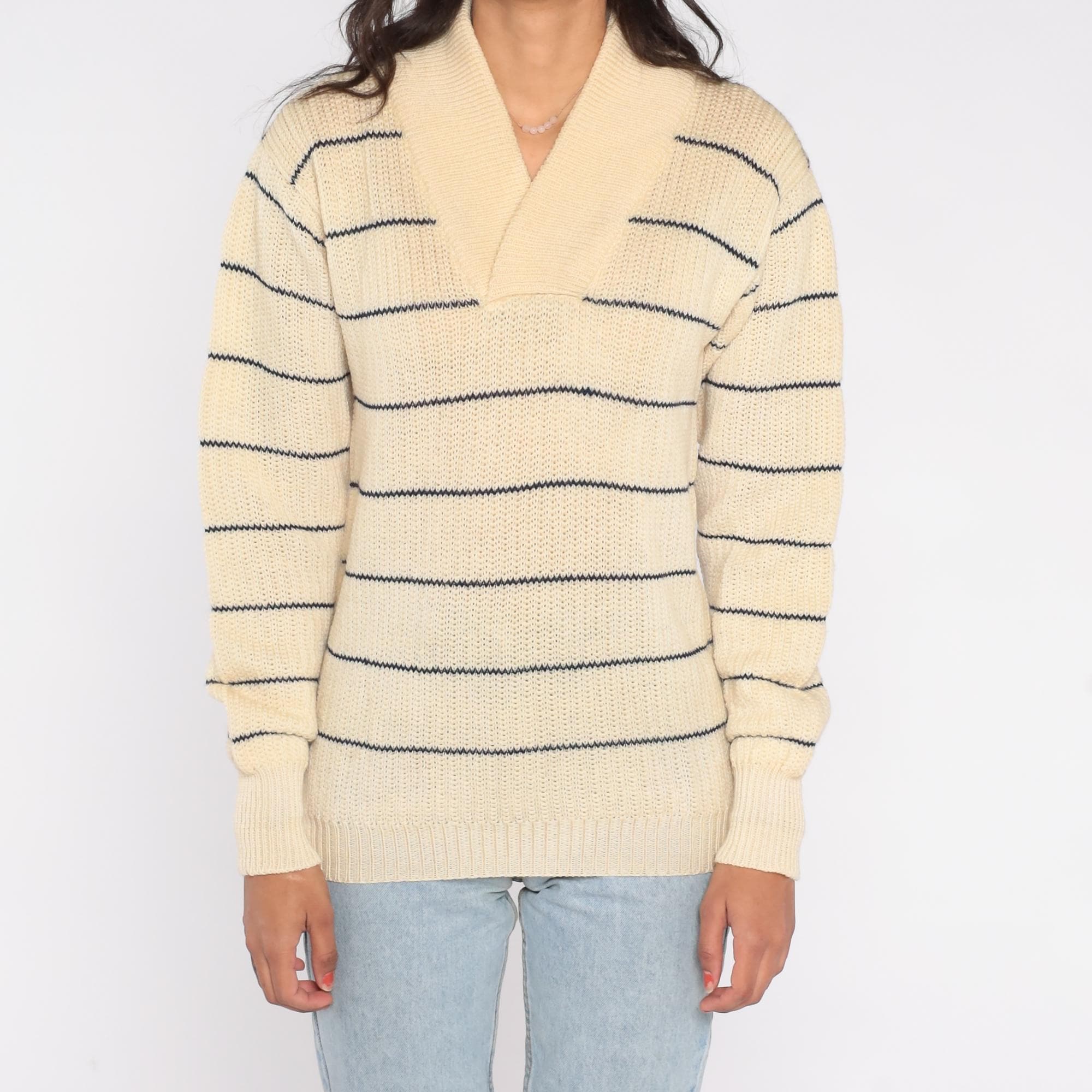 80s cream striped sweater featuring a shawl collar and black horizontal stripes. This pullover has a preppy ski lodge aesthetic with ribbed cuffs and hem and a relaxed fit through the body.