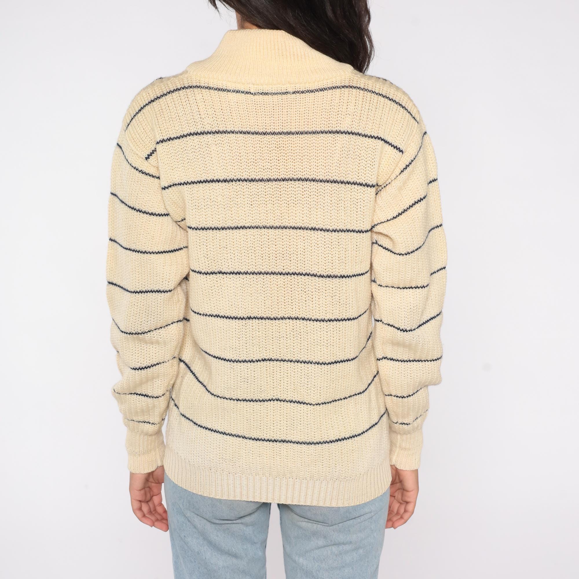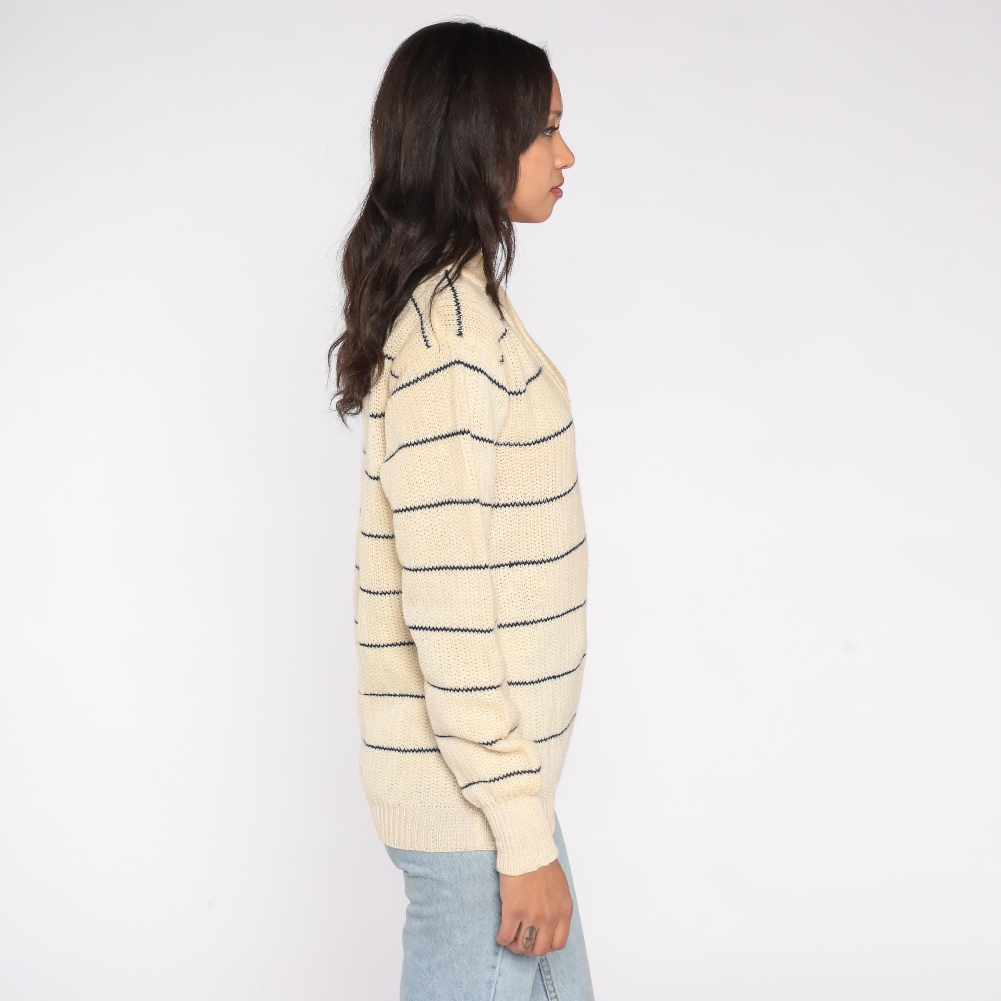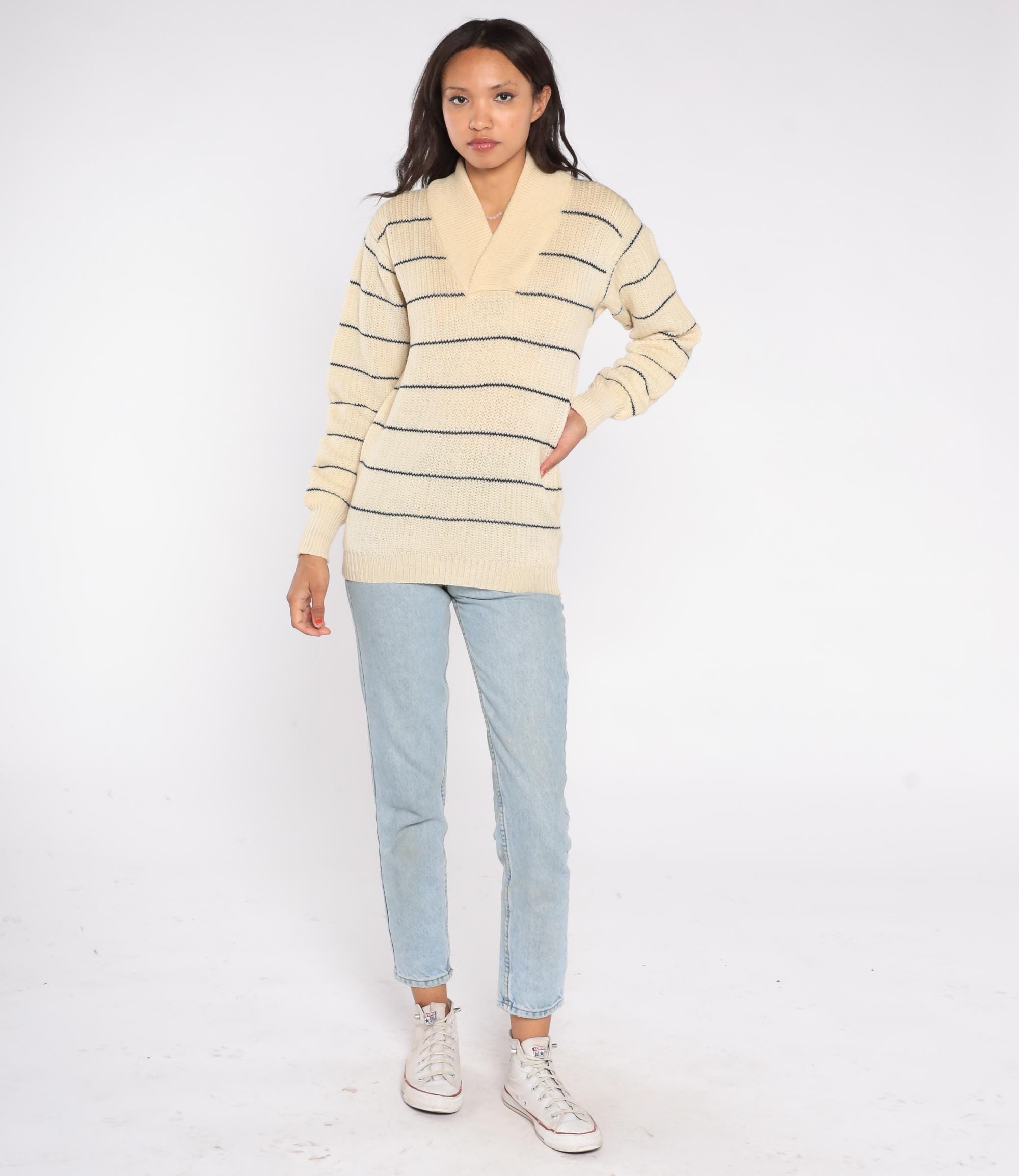 80s cream striped sweater featuring a shawl collar and black horizontal stripes. This pullover has a preppy ski lodge aesthetic with ribbed cuffs and hem and a relaxed fit through the body.