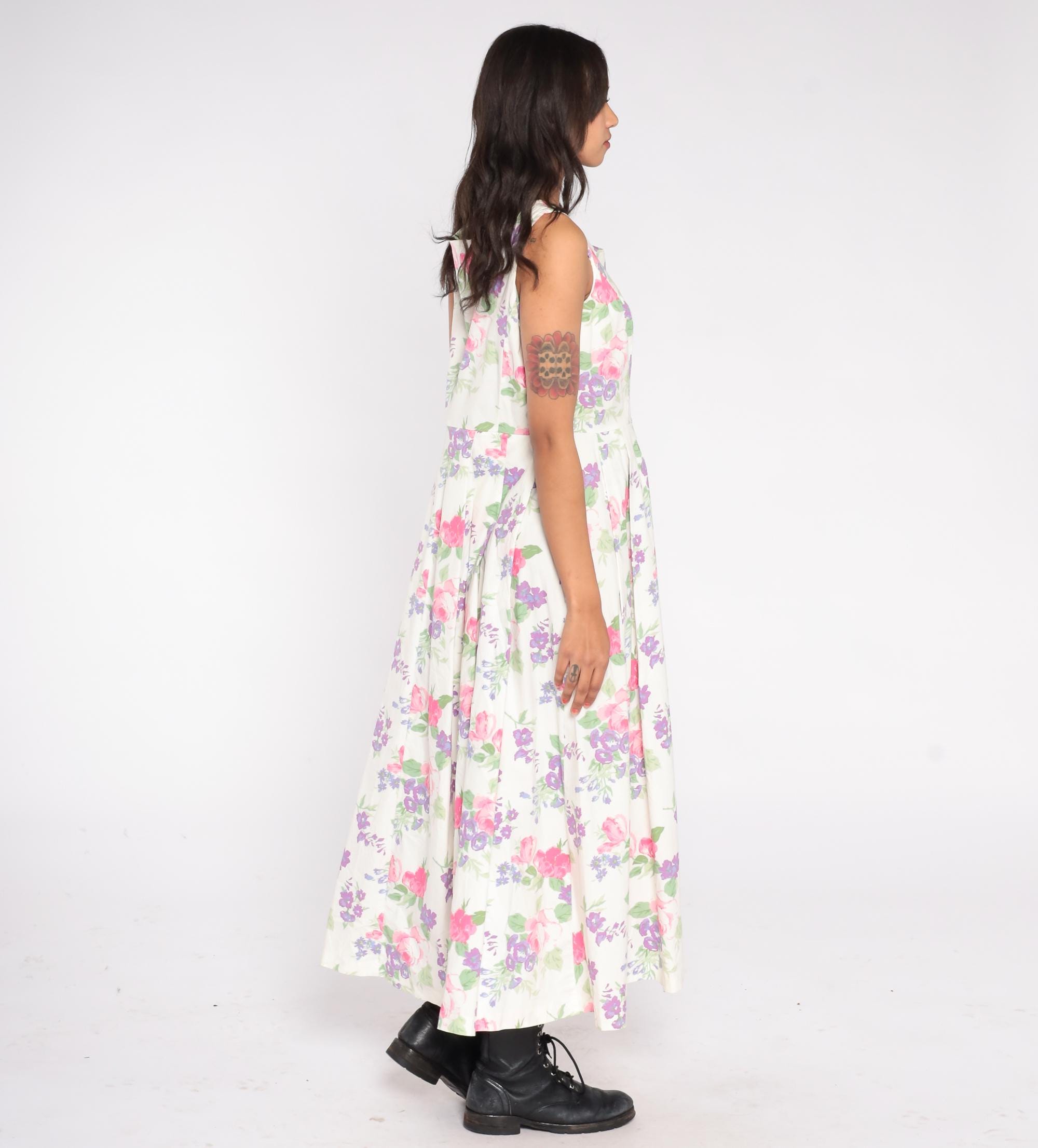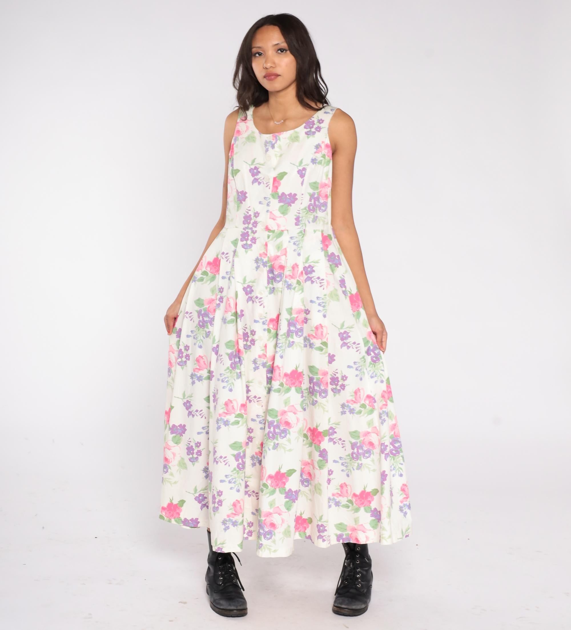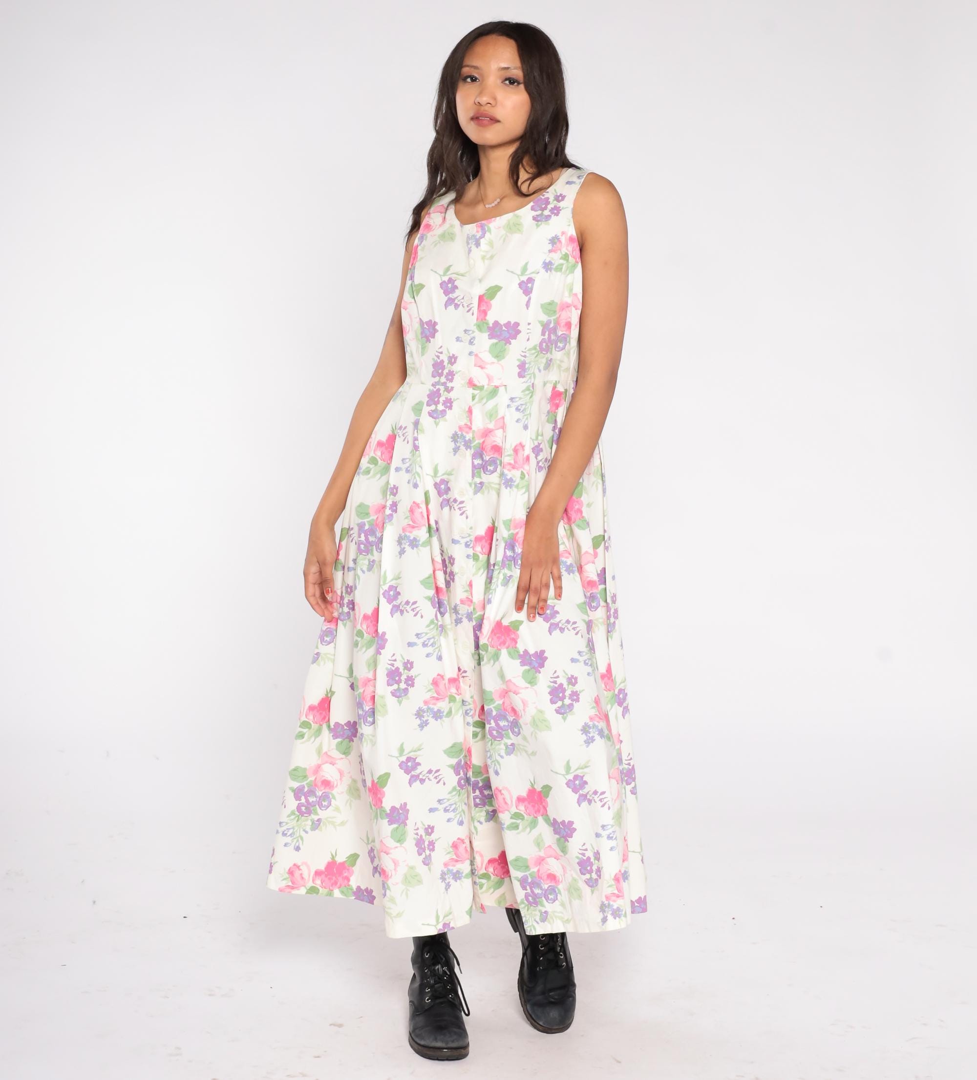 90s white floral maxi dress featuring a pastel garden print with pink, purple, and green flowers. Made from a soft cotton and spandex blend with a sleeveless cut, scoop neckline, and button-front closure. The fitted bodice flows into a long, full skirt for a flattering silhouette.