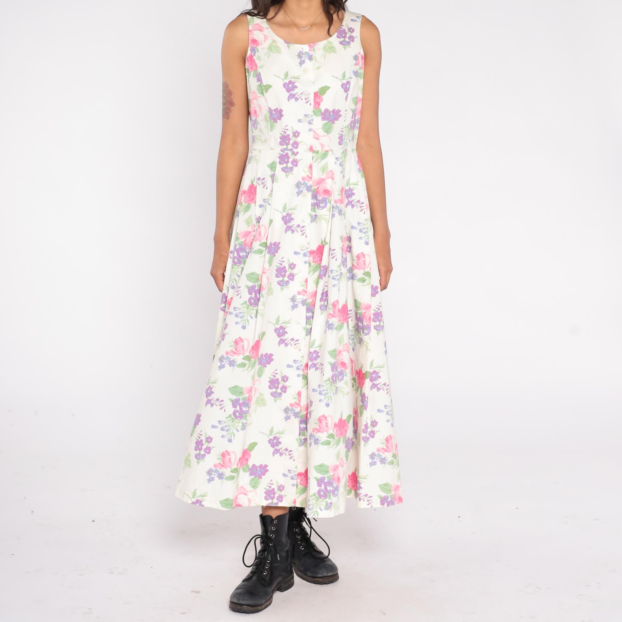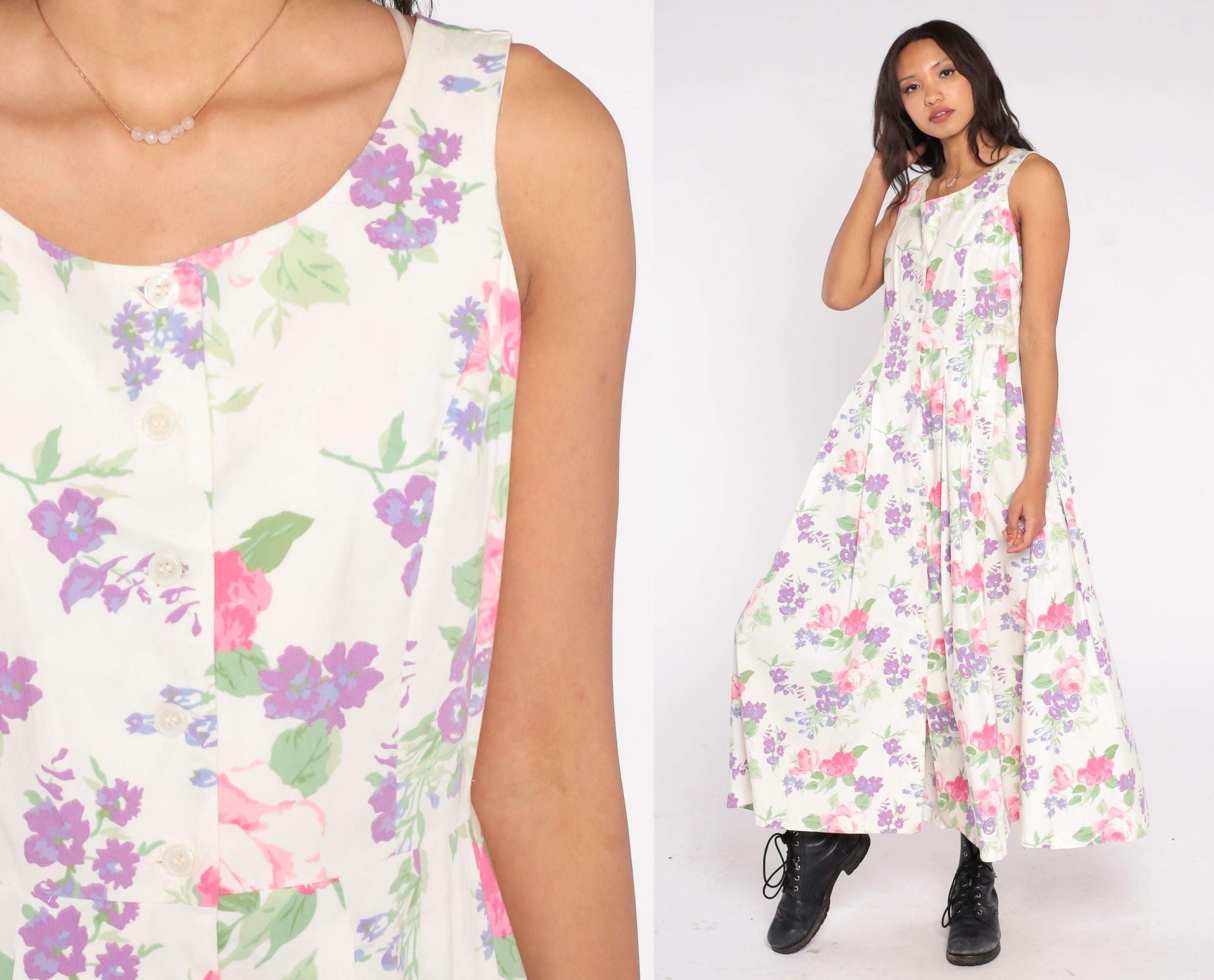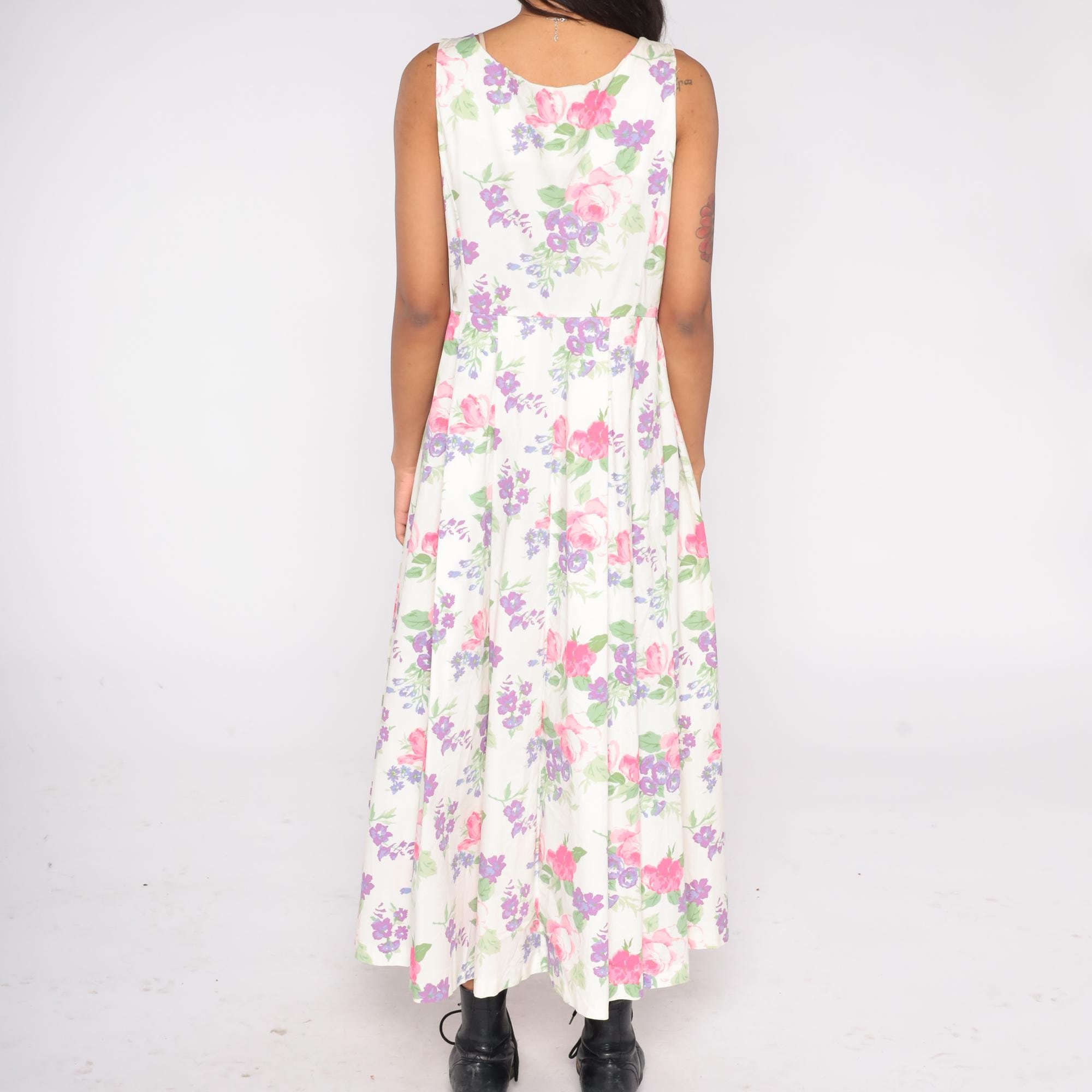 90s white floral maxi dress featuring a pastel garden print with pink, purple, and green flowers. Made from a soft cotton and spandex blend with a sleeveless cut, scoop neckline, and button-front closure. The fitted bodice flows into a long, full skirt for a flattering silhouette.