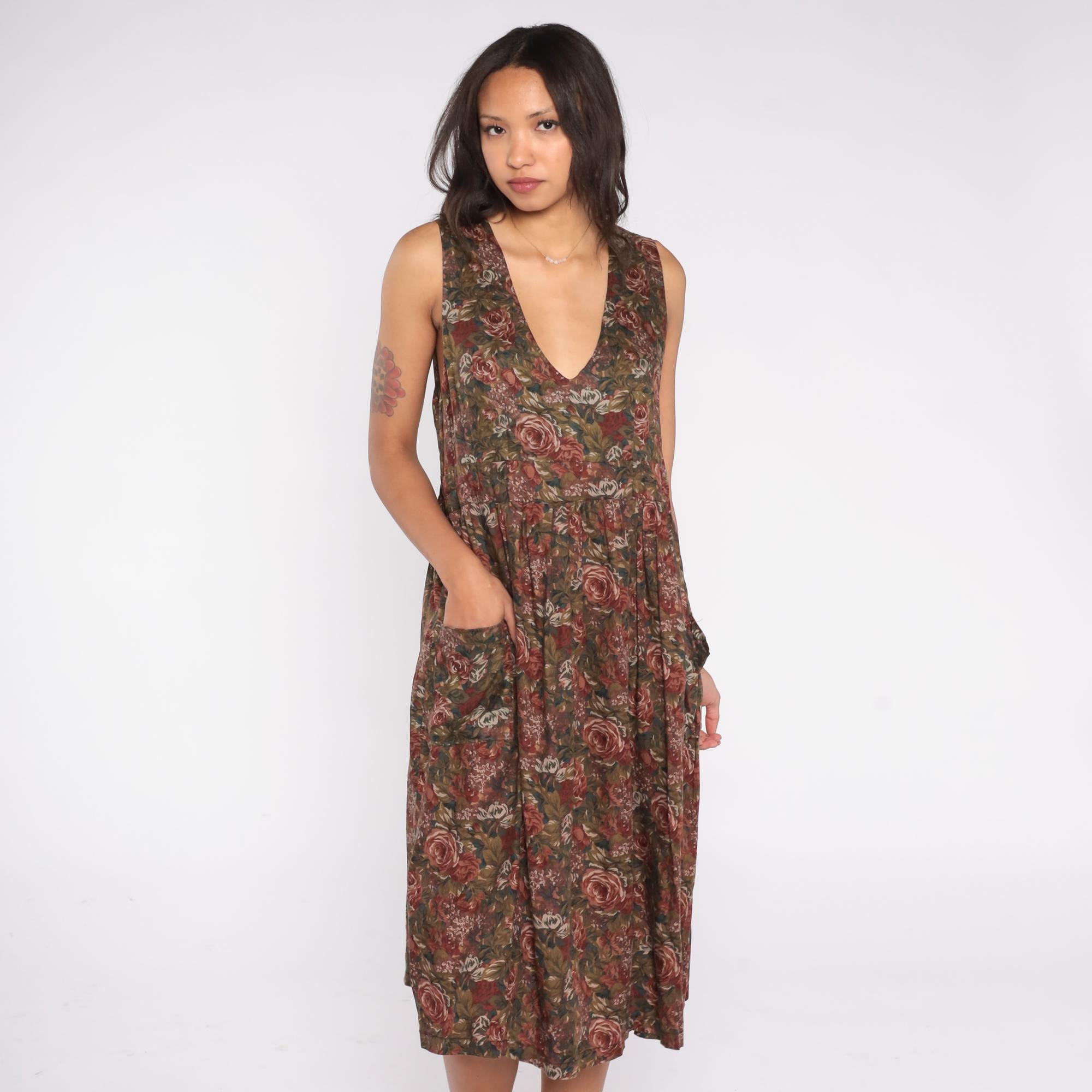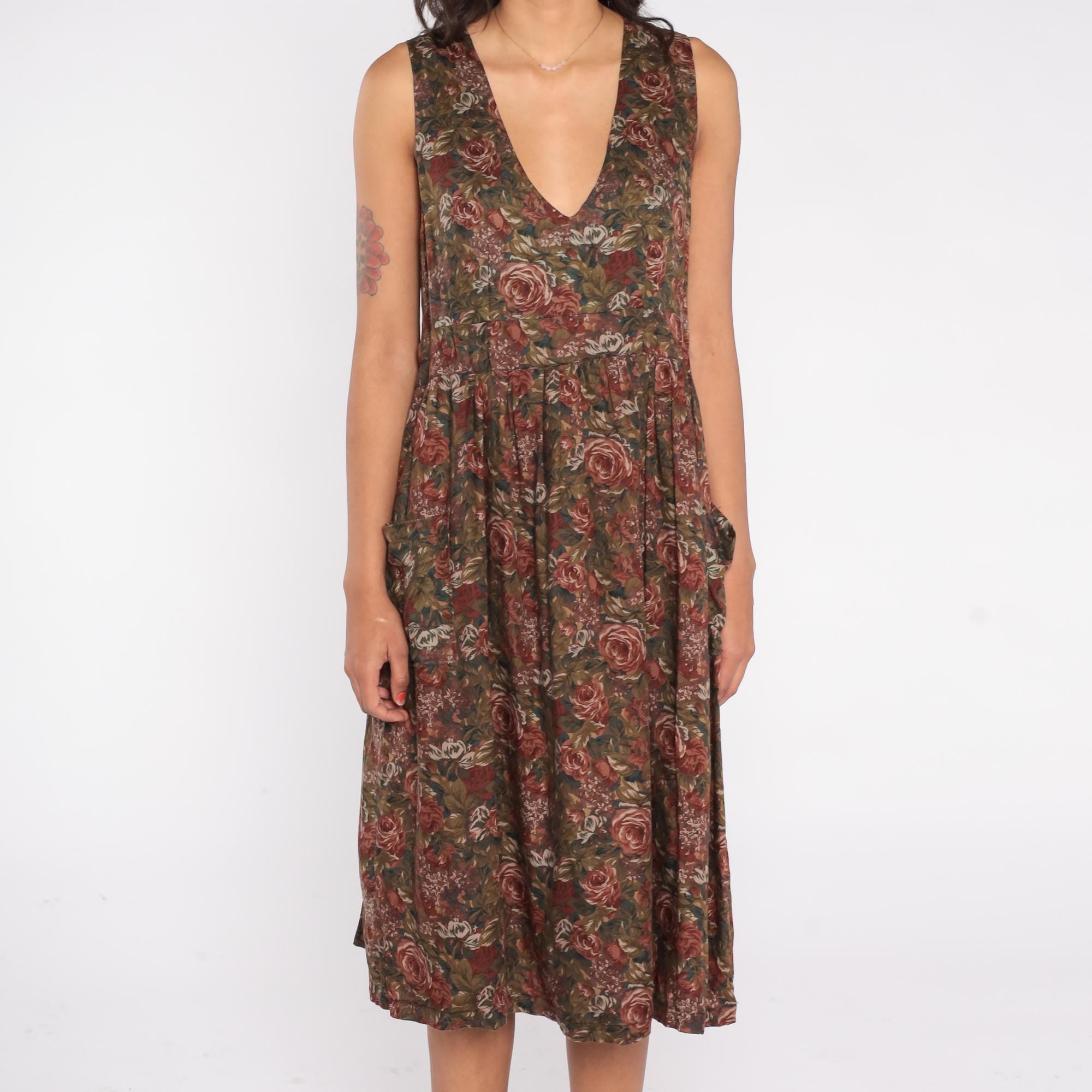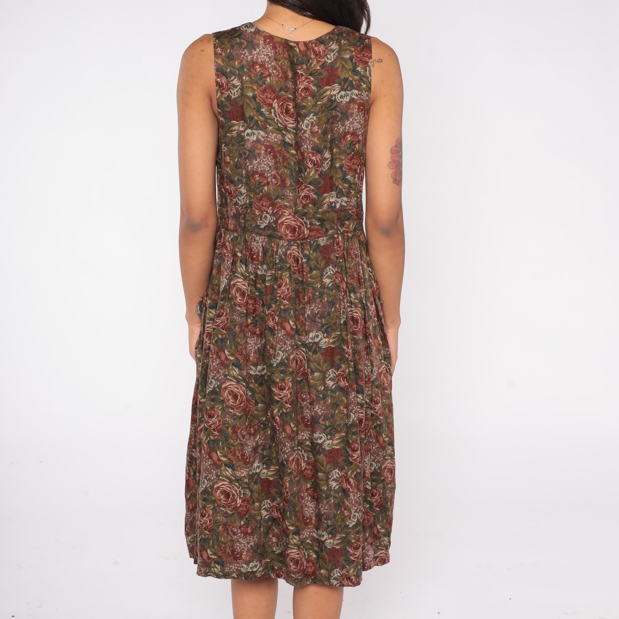 90s sleeveless floral midi dress with a deep V neckline and fit and flare silhouette. Features a romantic rose print in earthy brown, green, and burgundy tones, side pockets, and a soft cotton-acetate blend fabric. Easy pull-on style with a gathered waist and full skirt.