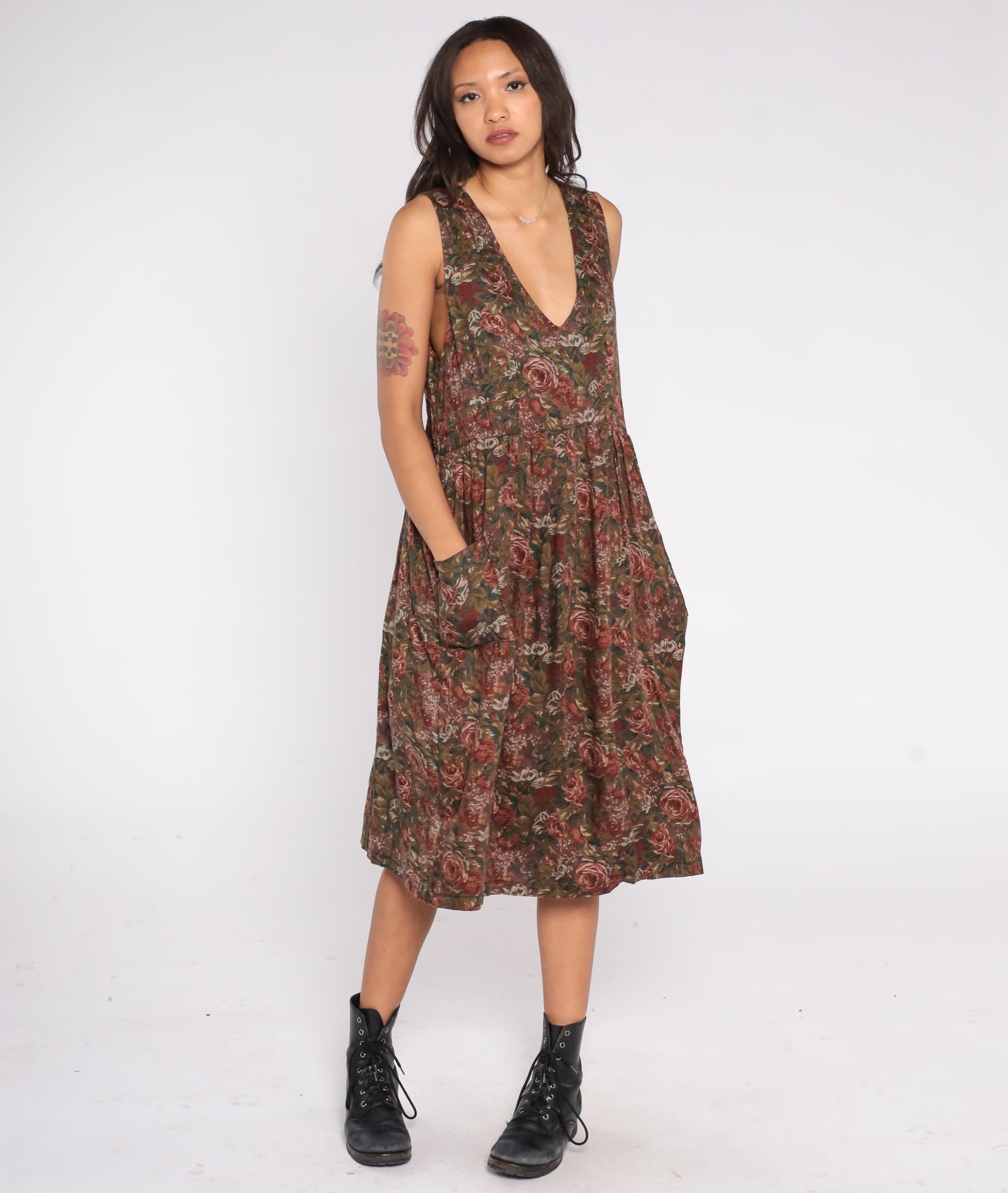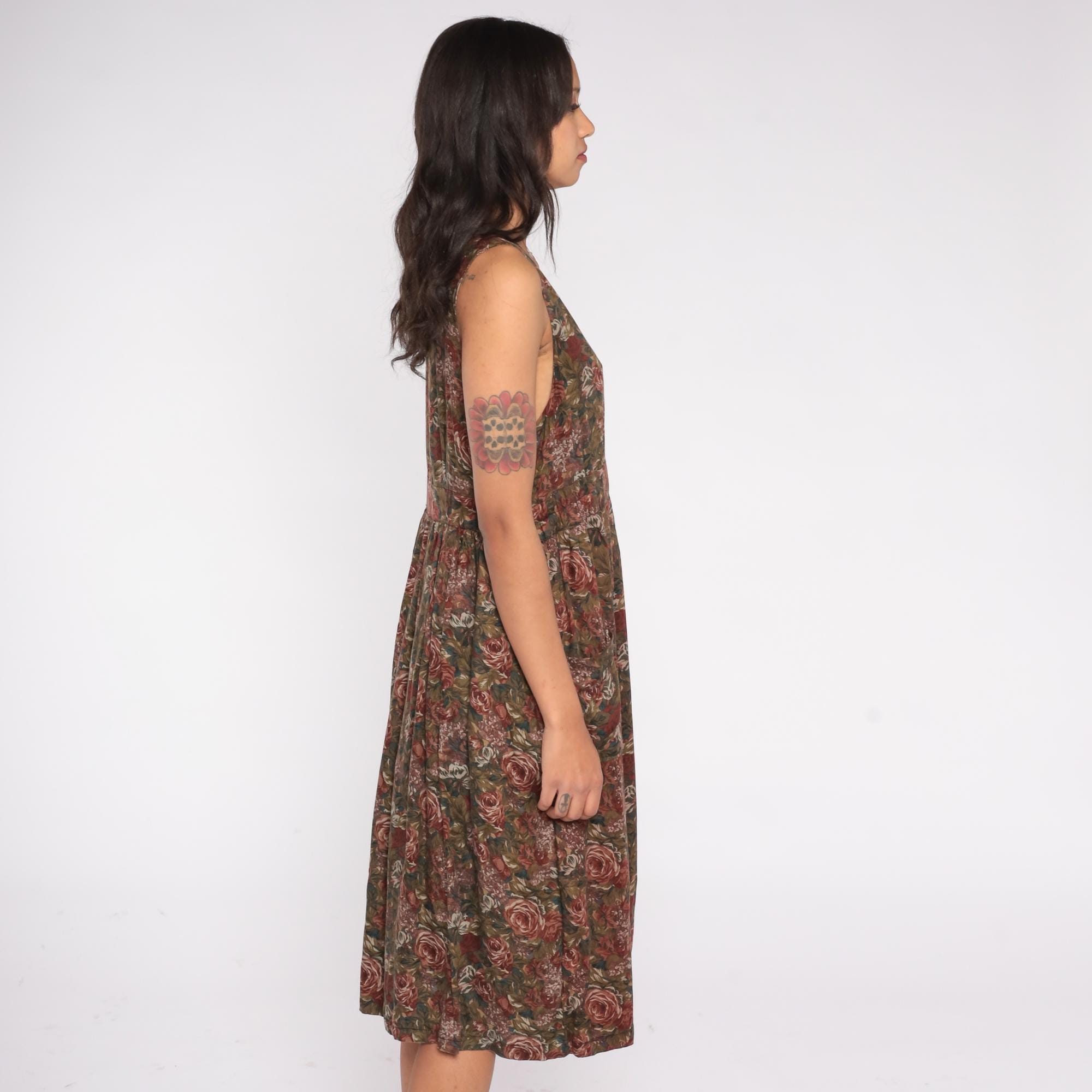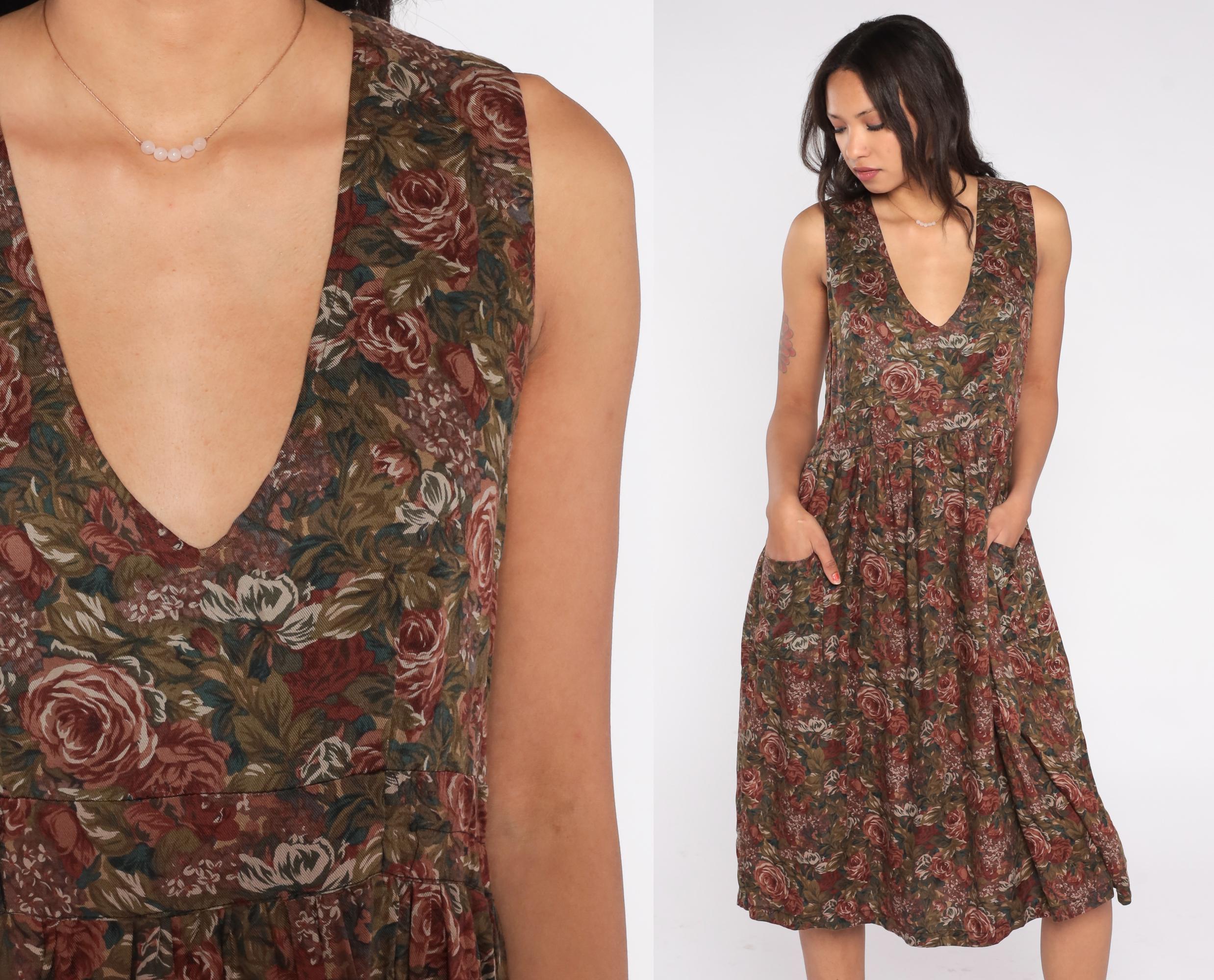 90s sleeveless floral midi dress with a deep V neckline and fit and flare silhouette. Features a romantic rose print in earthy brown, green, and burgundy tones, side pockets, and a soft cotton-acetate blend fabric. Easy pull-on style with a gathered waist and full skirt.