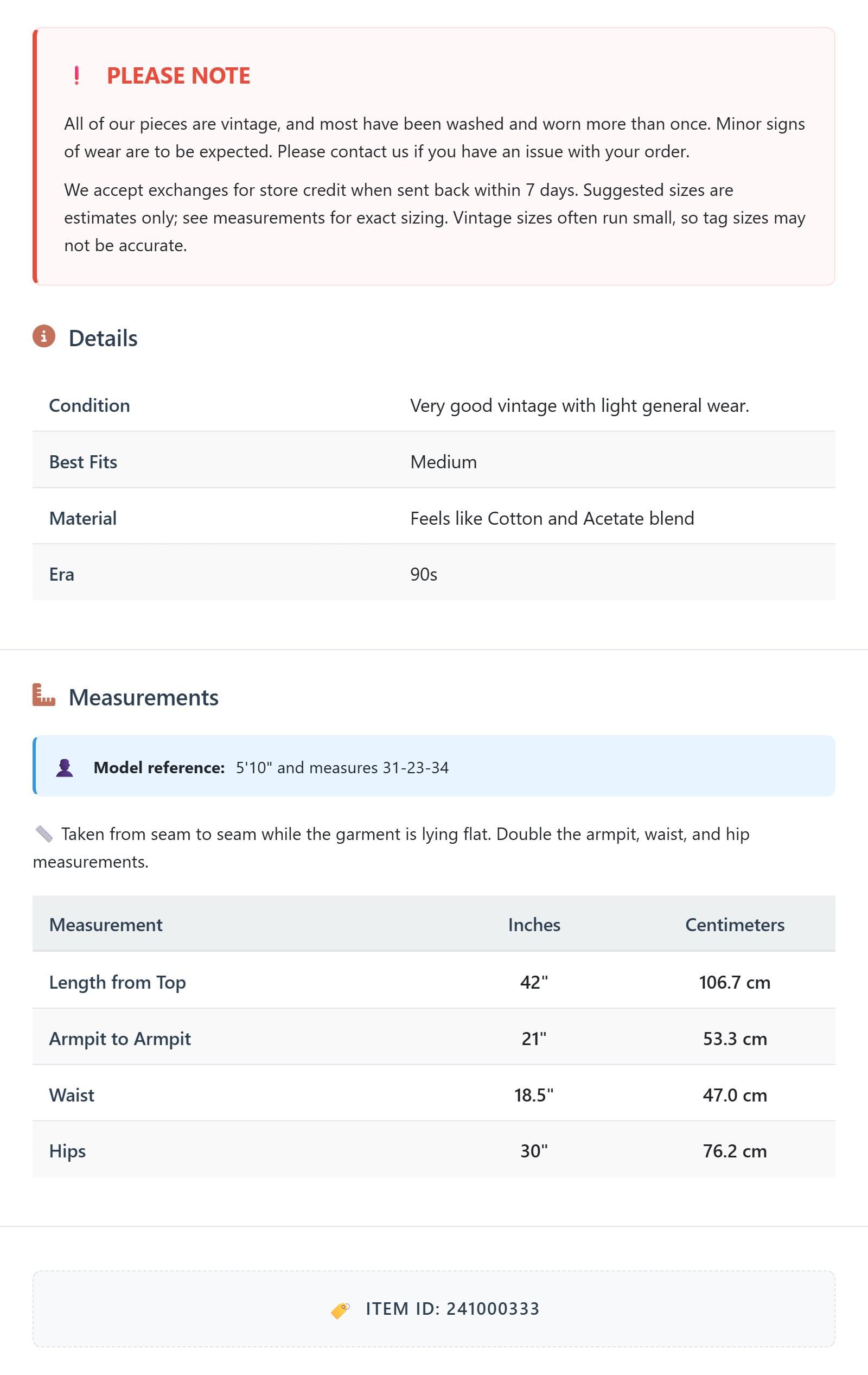 Suggested sizes are estimates only; see measurements for exact sizing. Vintage sizes often run small, so tag sizes may not be accurate.