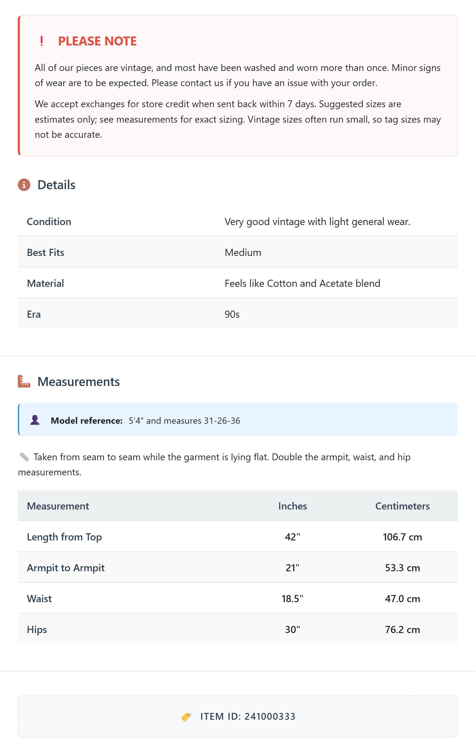 All of our pieces are vintage, and most have been washed and worn more than once. Minor signs of wear are to be expected. Please contact us if you have an issue with your order. We accept exchanges for store credit when sent back within 7 days.