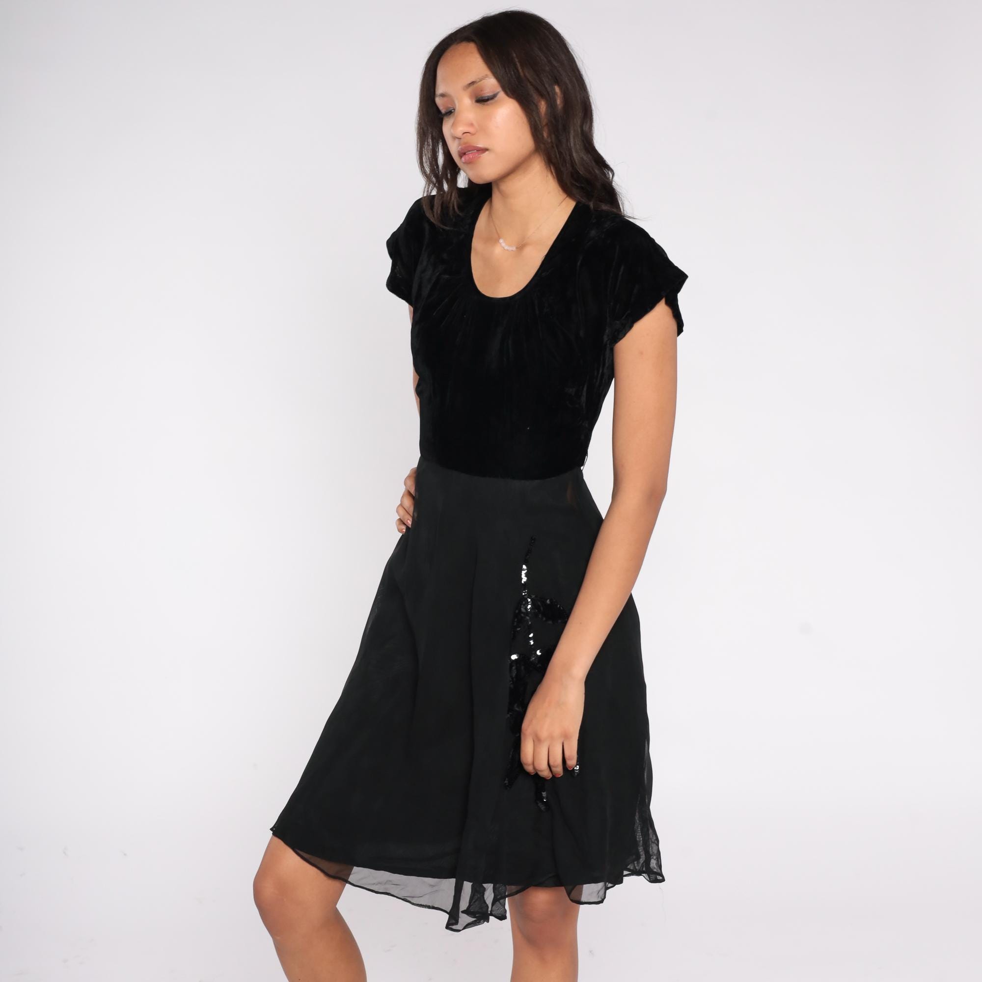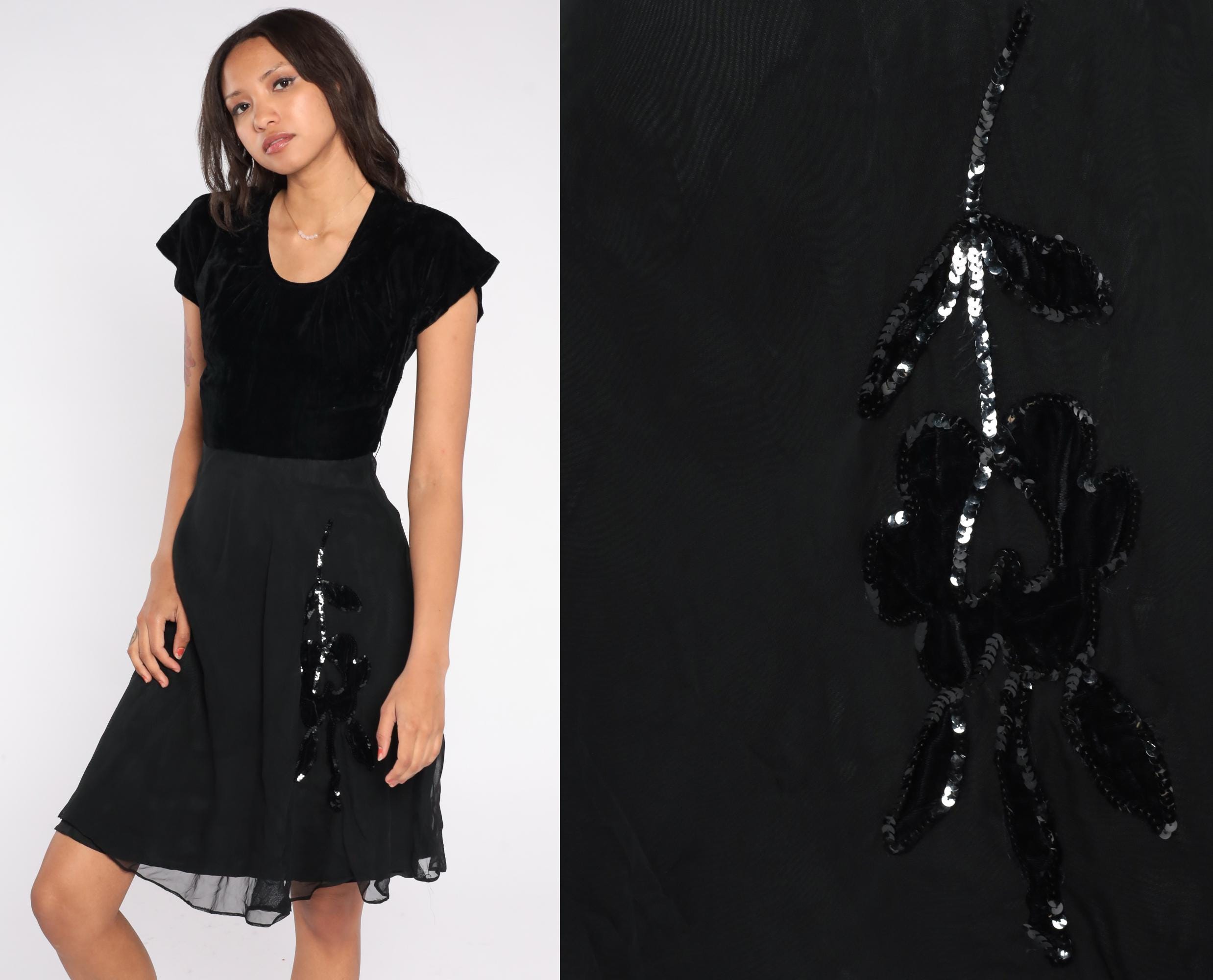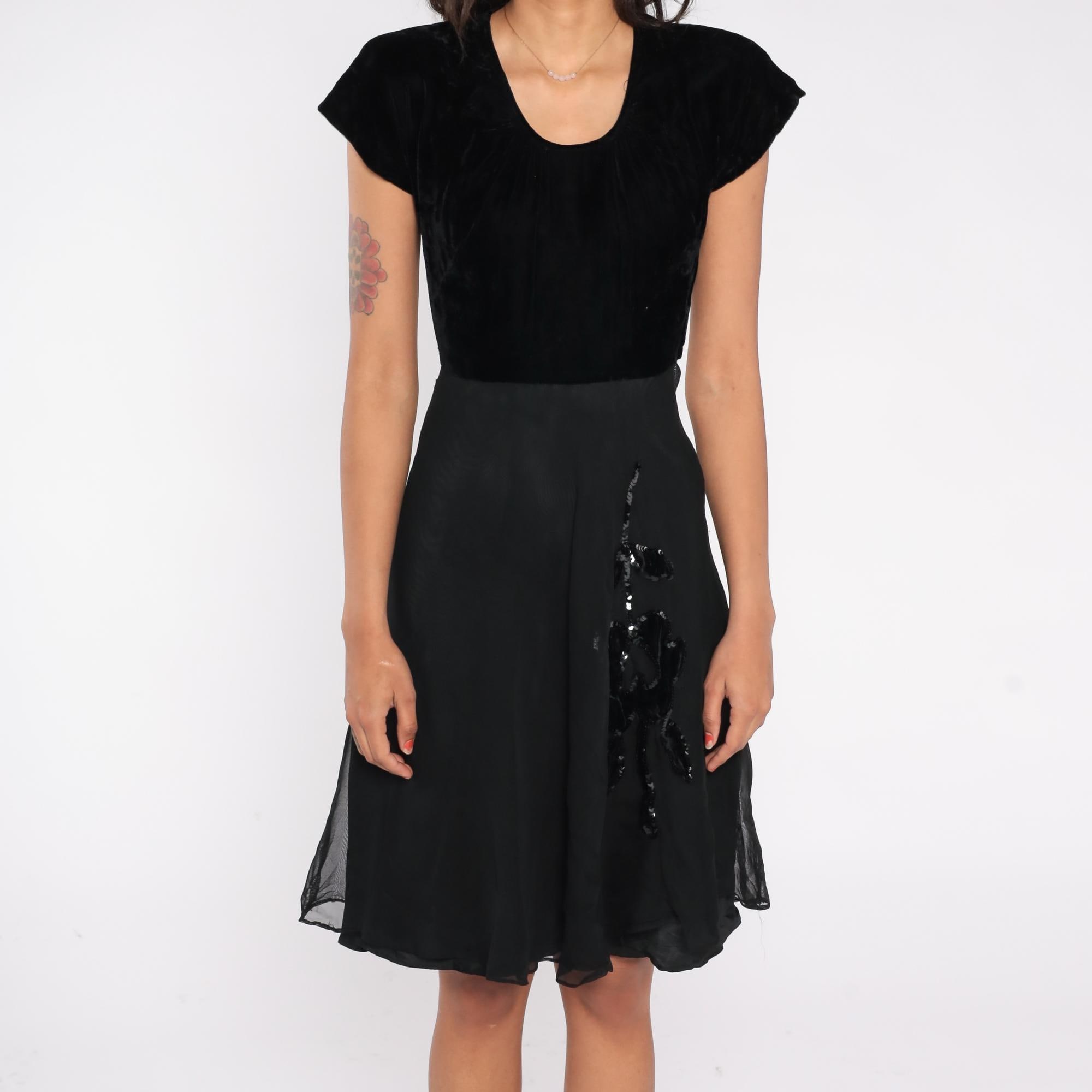 1940s black dress by Kayo Dress featuring a fitted velvet bodice with short sleeves and a flowing chiffon-style skirt. The skirt includes a black sequin floral applique for a touch of understated glamour. Made from an acetate blend with a soft drape and lightweight movement. Classic fit-and-flare silhouette ideal for evening or cocktail wear.