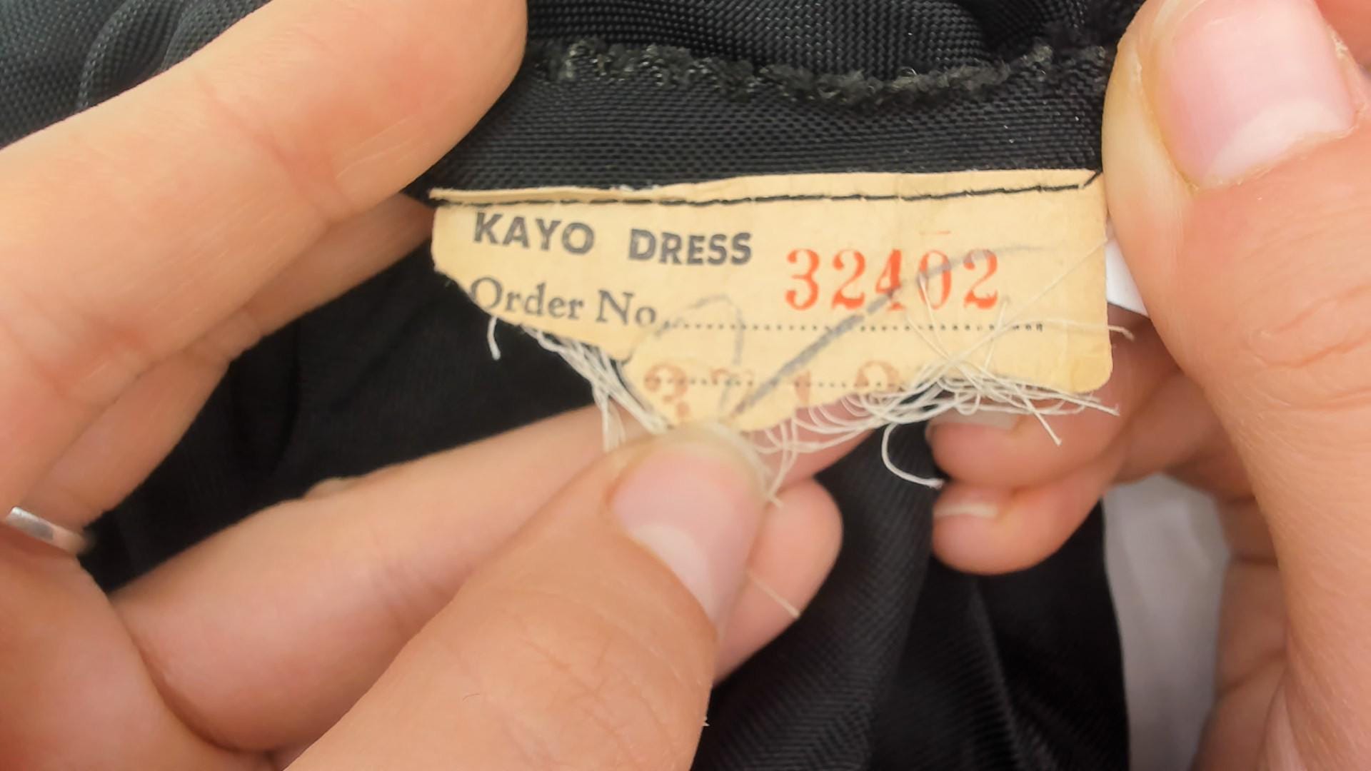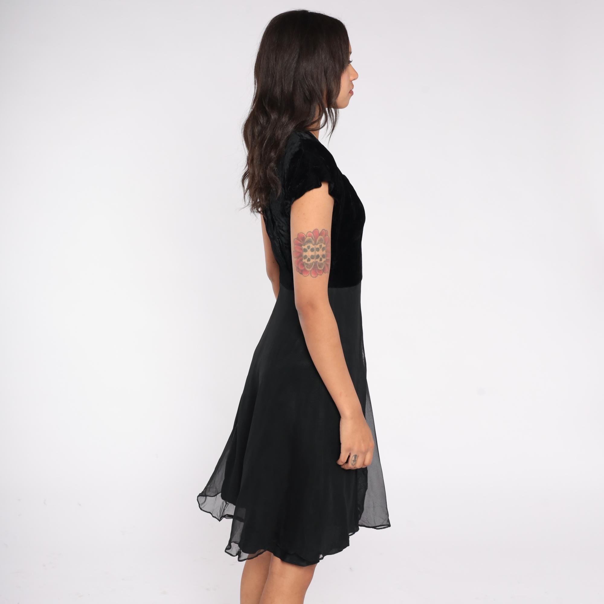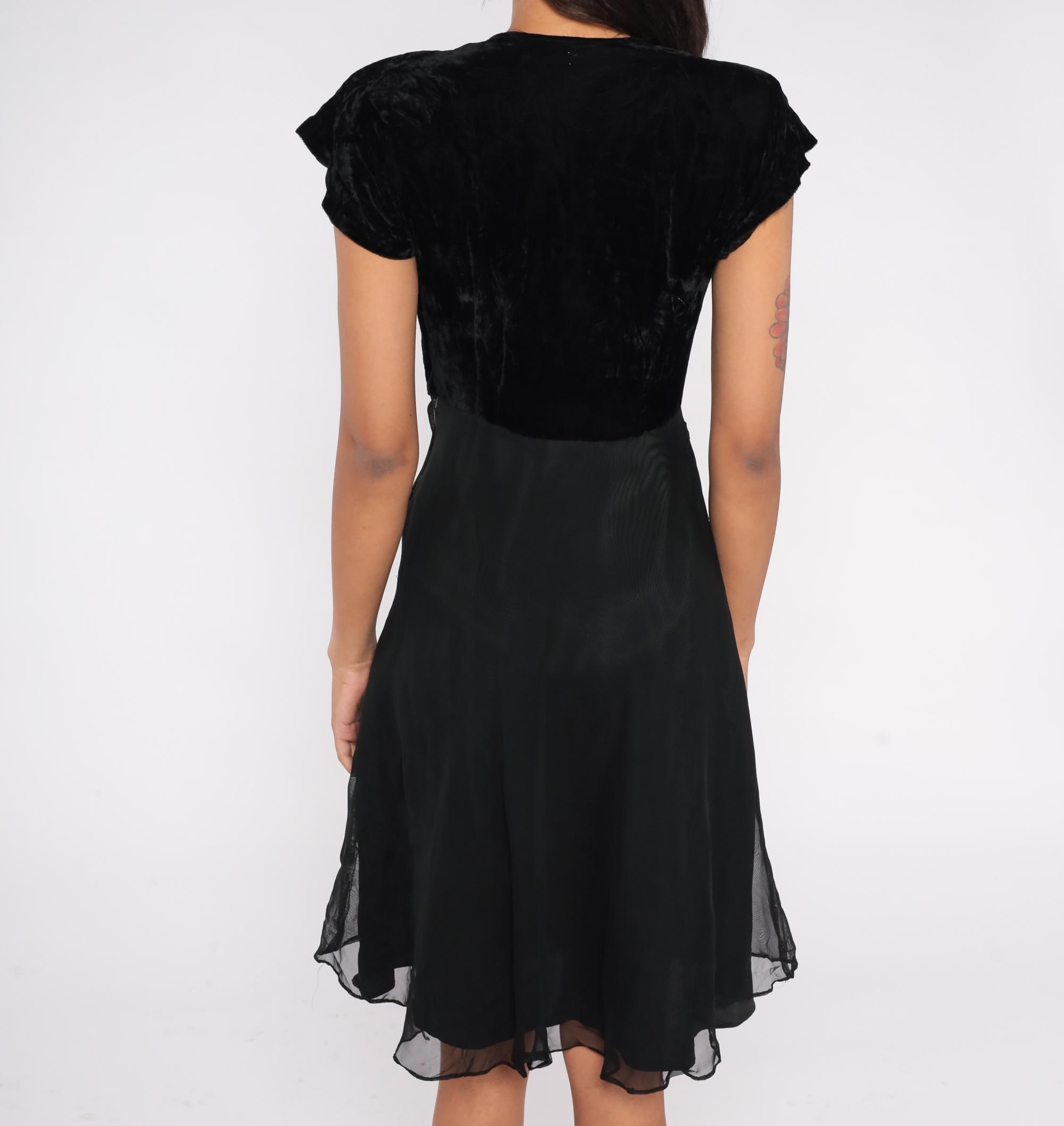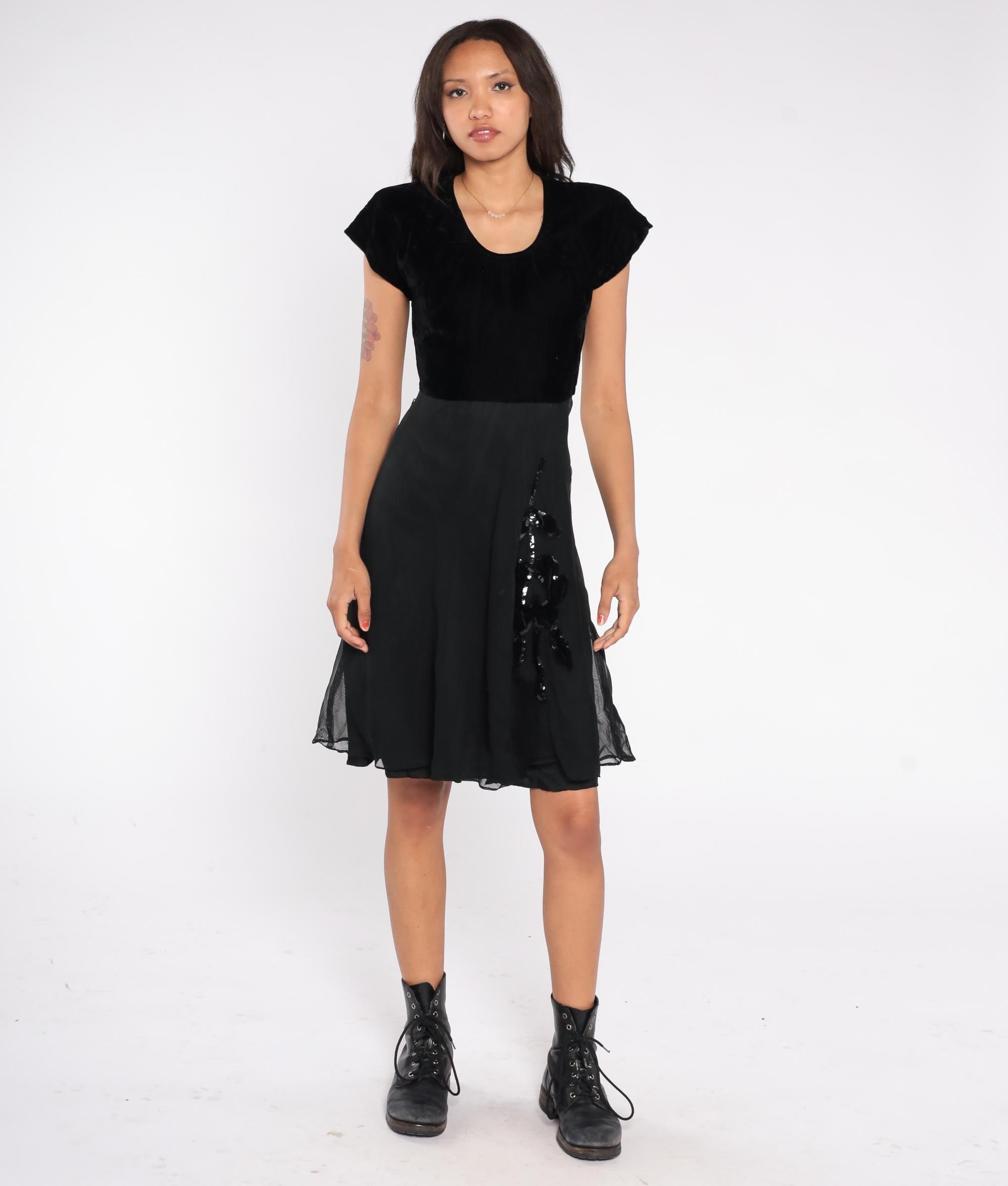 1940s black dress by Kayo Dress featuring a fitted velvet bodice with short sleeves and a flowing chiffon-style skirt. The skirt includes a black sequin floral applique for a touch of understated glamour. Made from an acetate blend with a soft drape and lightweight movement. Classic fit-and-flare silhouette ideal for evening or cocktail wear.