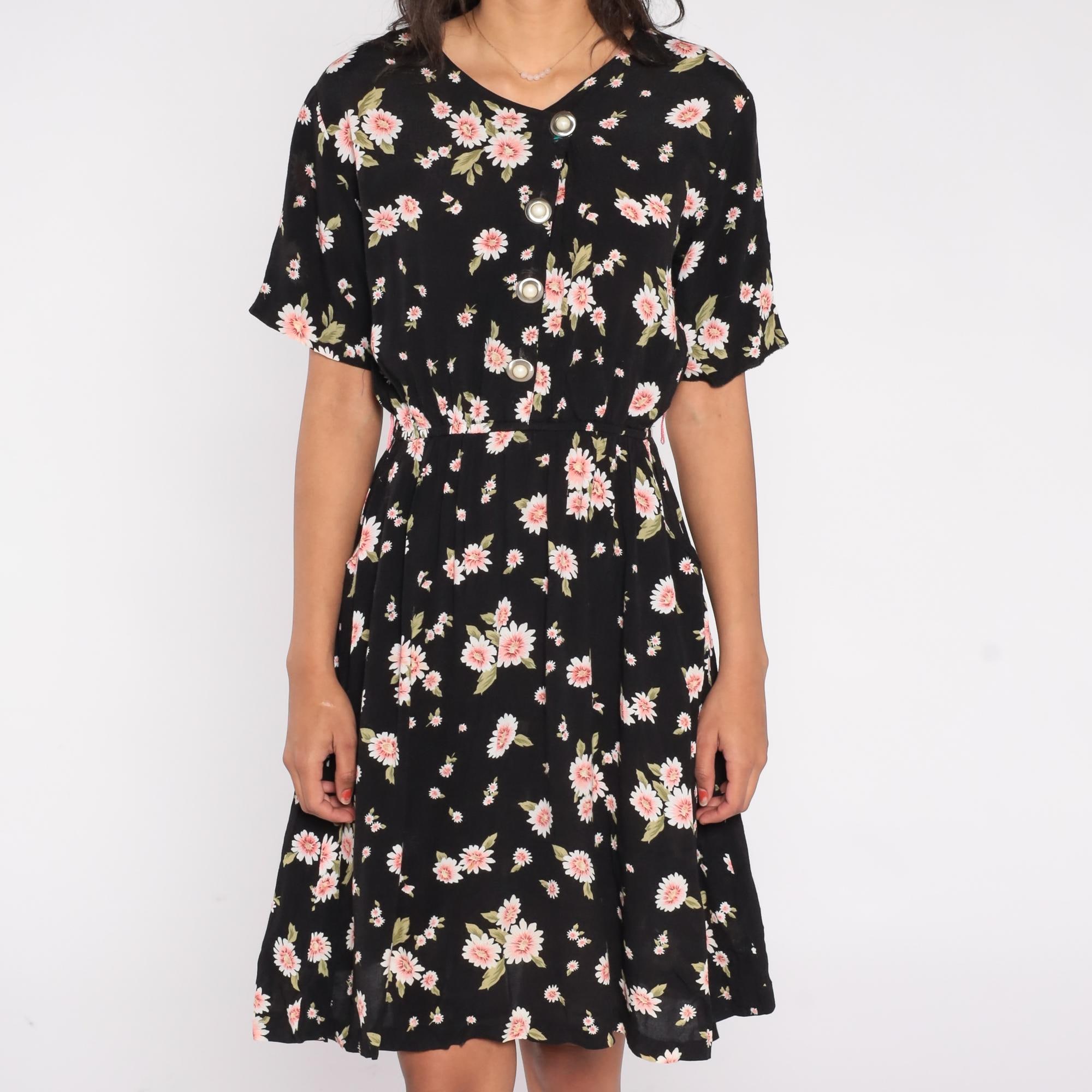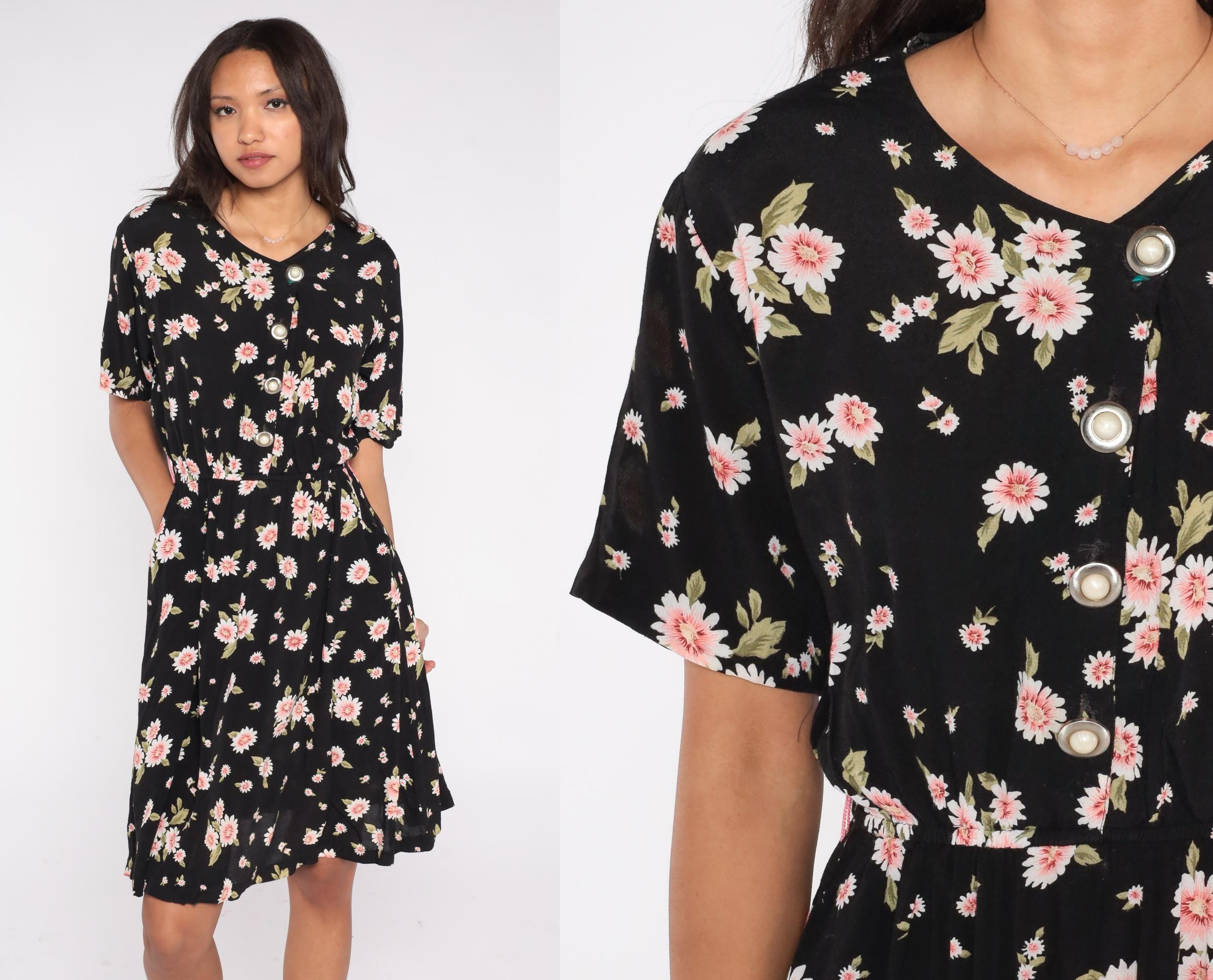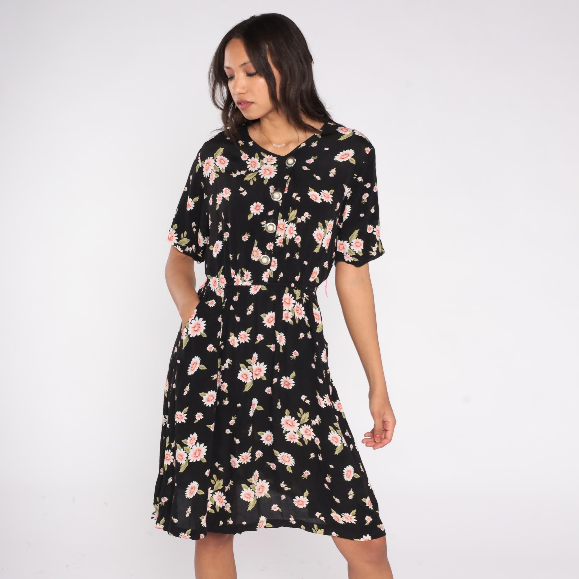 90s black floral dress by Esther Collection USA featuring a pink daisy print with pearl-style buttons down the bodice. Designed with short sleeves, an elastic waist, and a gently flared skirt that falls to midi length.