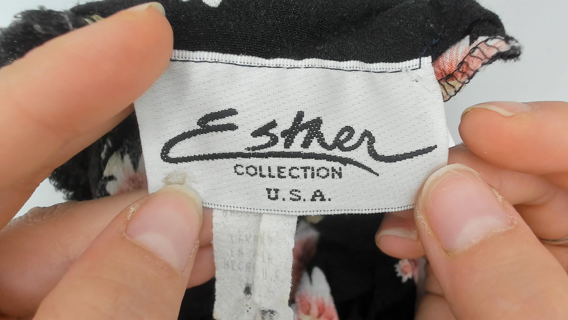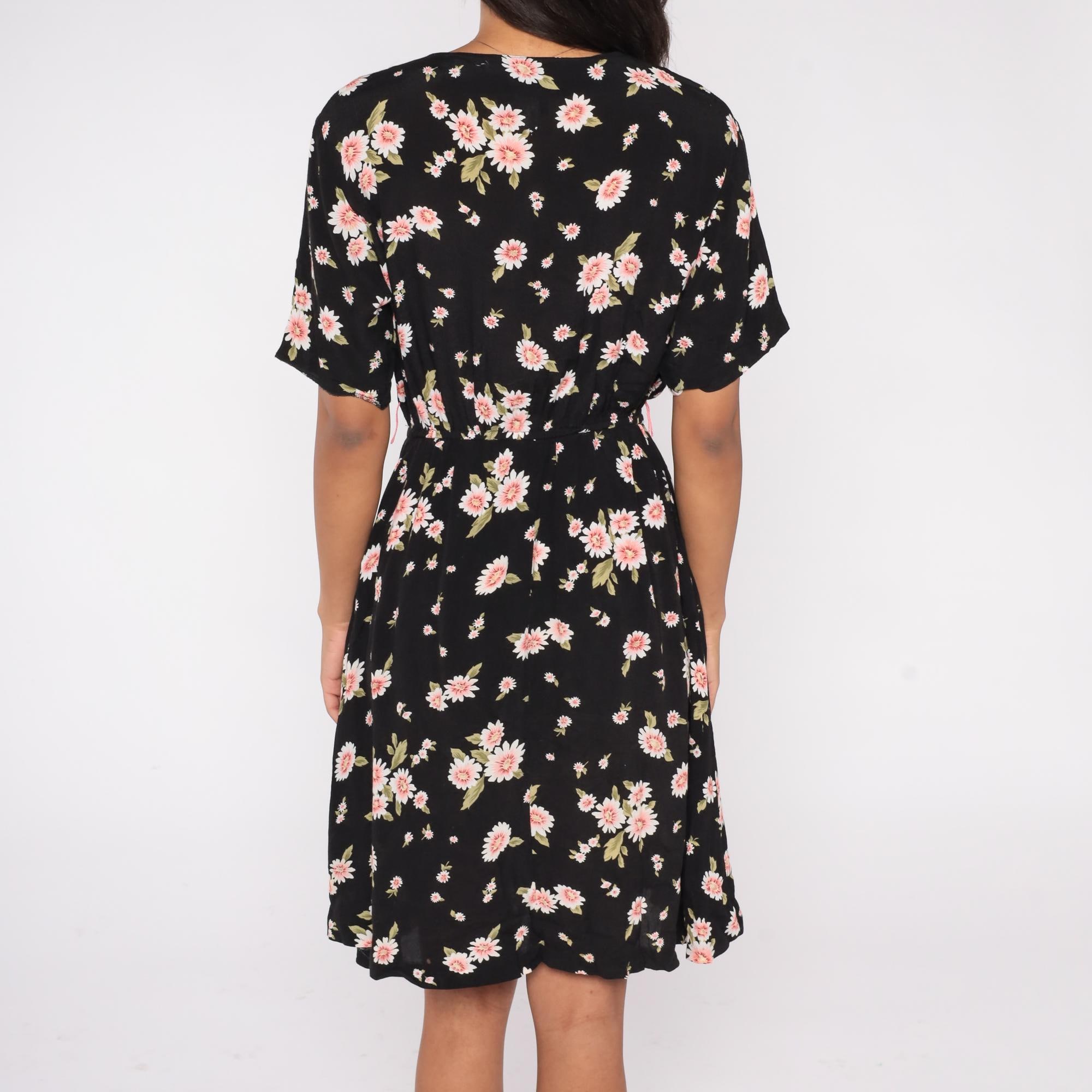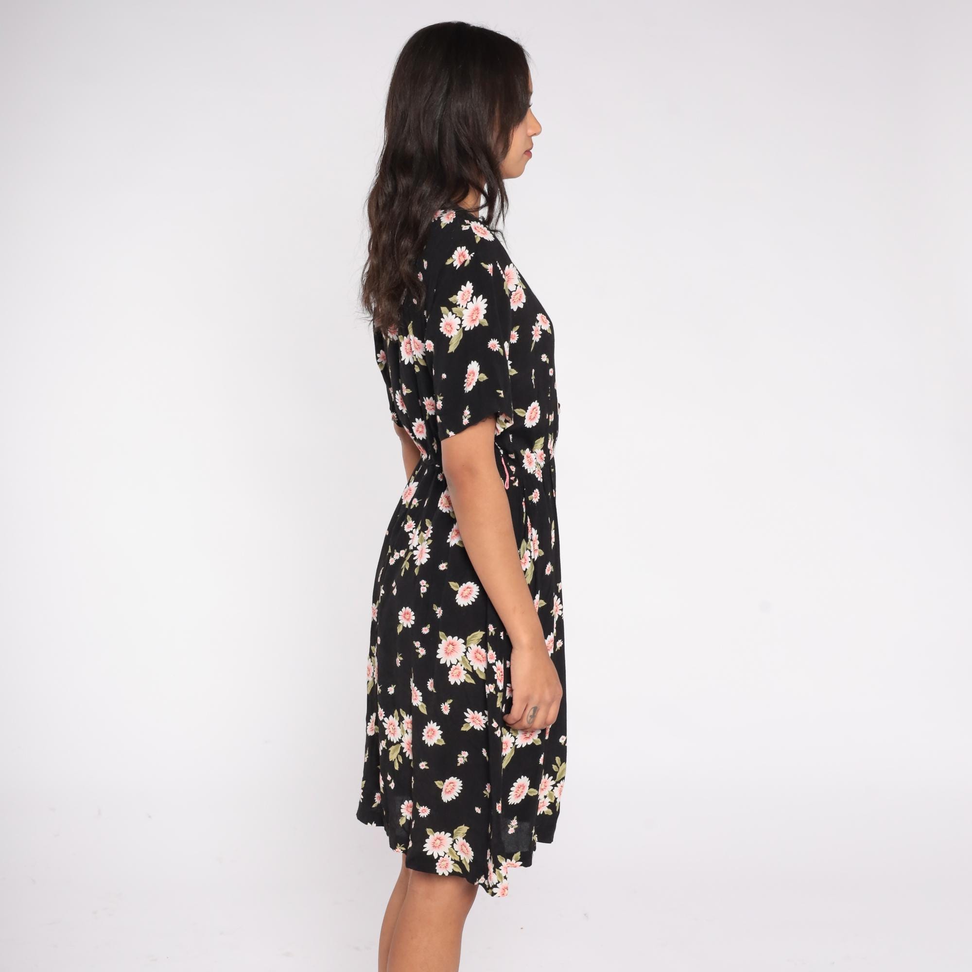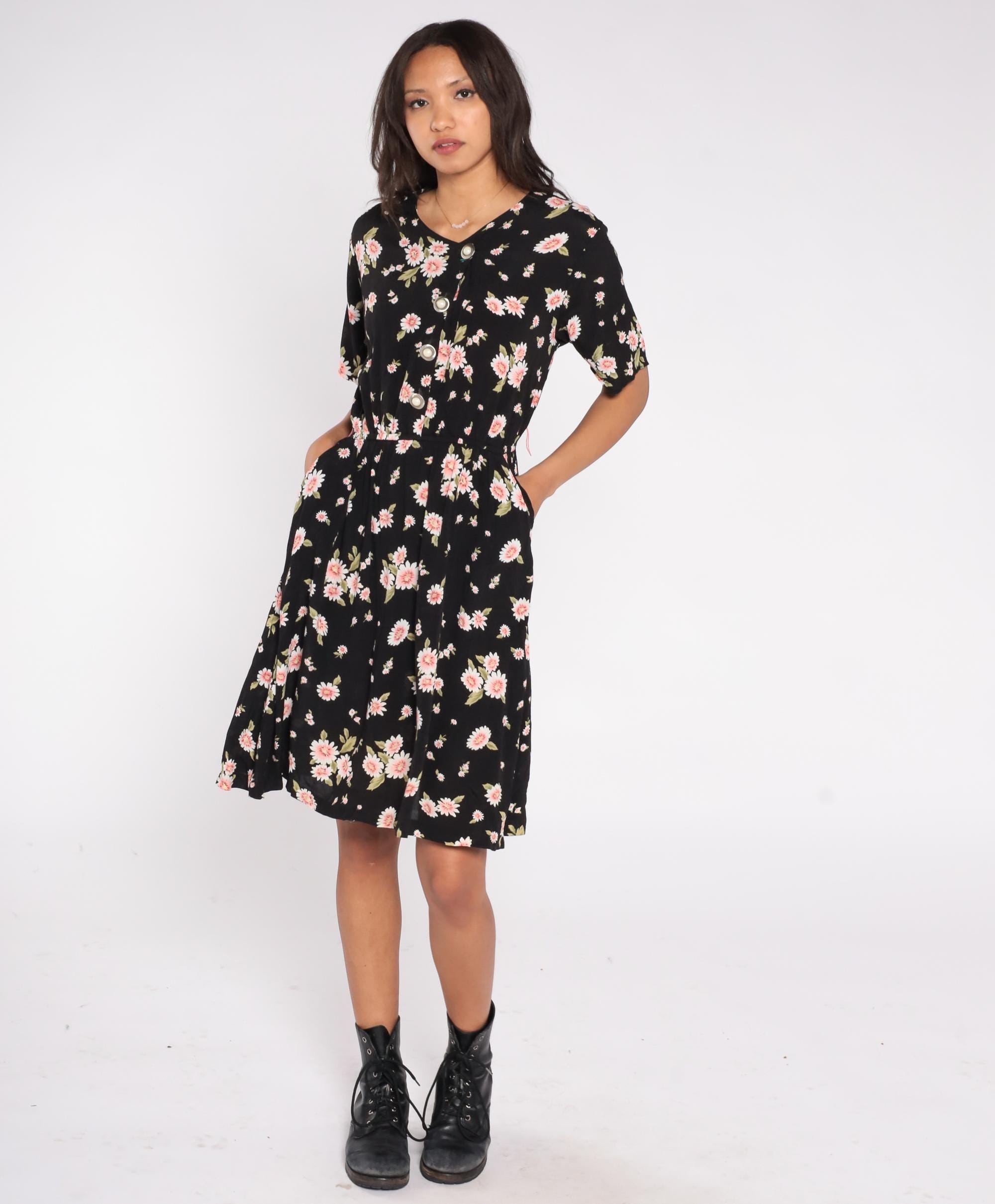 90s black floral dress by Esther Collection USA featuring a pink daisy print with pearl-style buttons down the bodice. Designed with short sleeves, an elastic waist, and a gently flared skirt that falls to midi length.