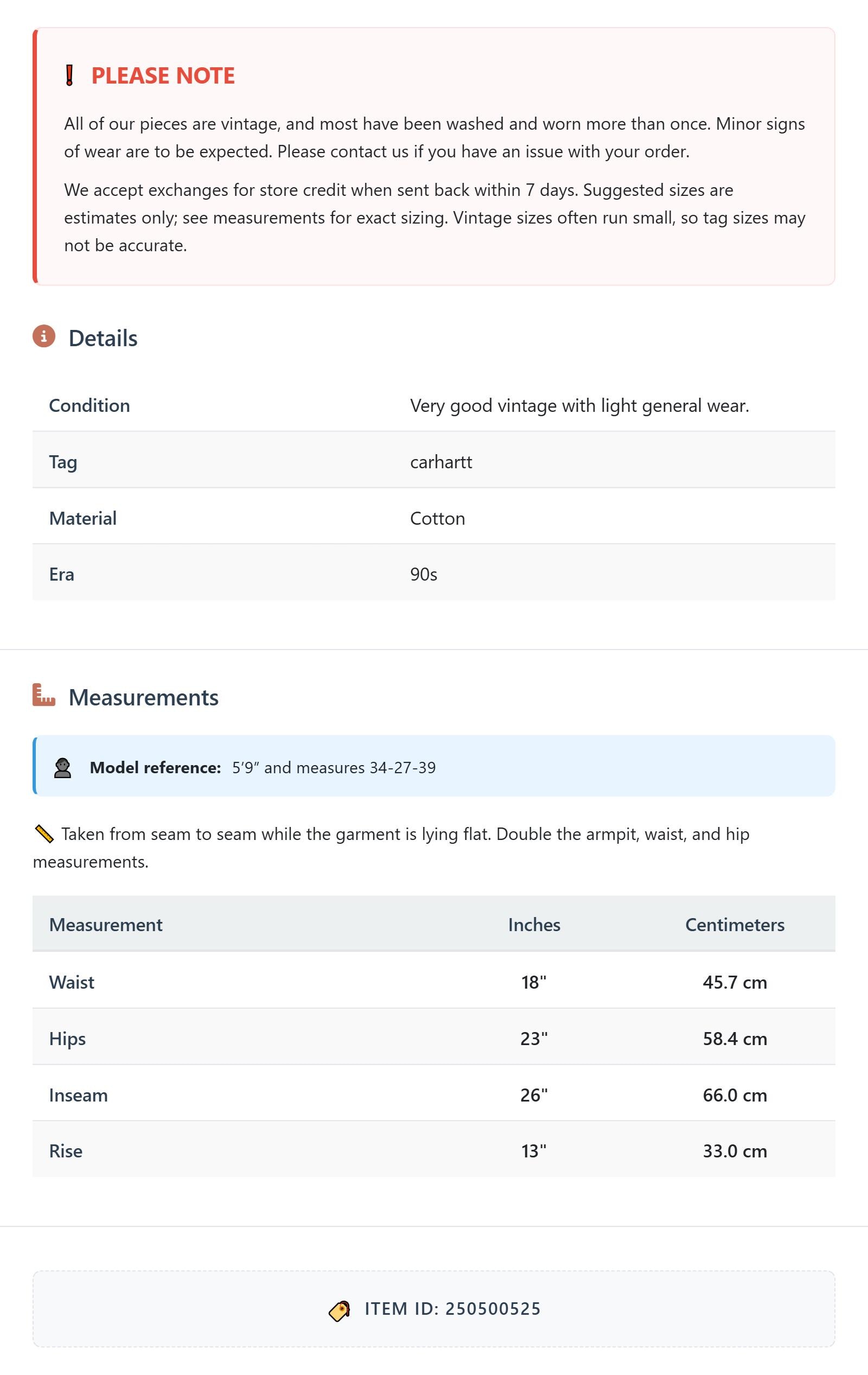 Vintage denim was usually made without any stretch, unlike modern jeans. Check the measurements to ensure proper fit, and remember to give yourself a little wiggle room in the waist and hips, depending on your preferred fit.