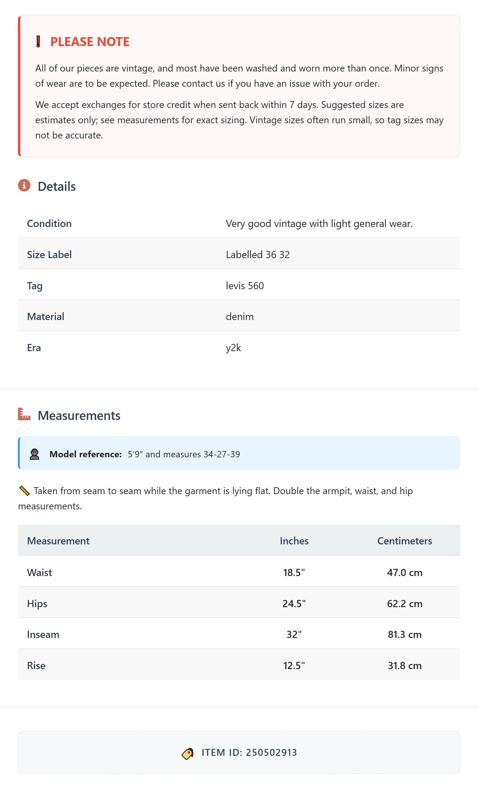 Vintage denim was usually made without any stretch, unlike modern jeans. Check the measurements to ensure proper fit, and remember to give yourself a little wiggle room in the waist and hips, depending on your preferred fit.