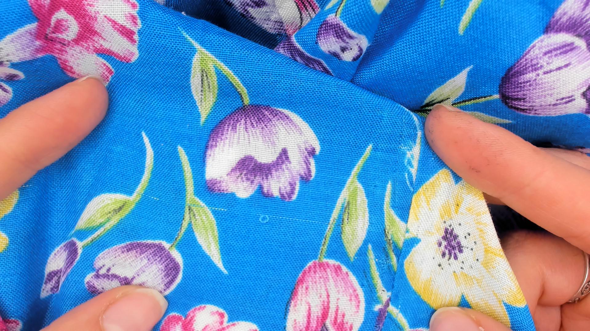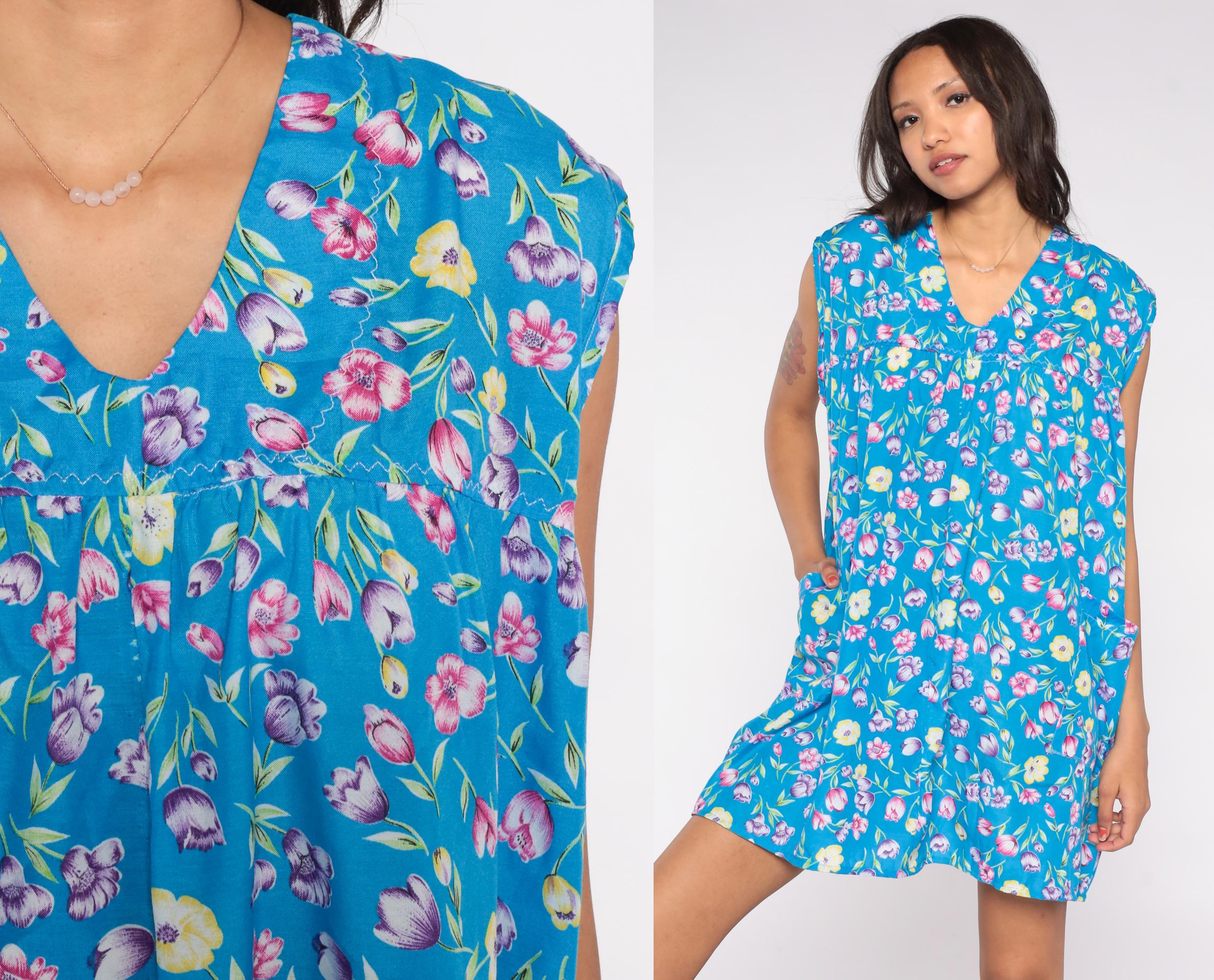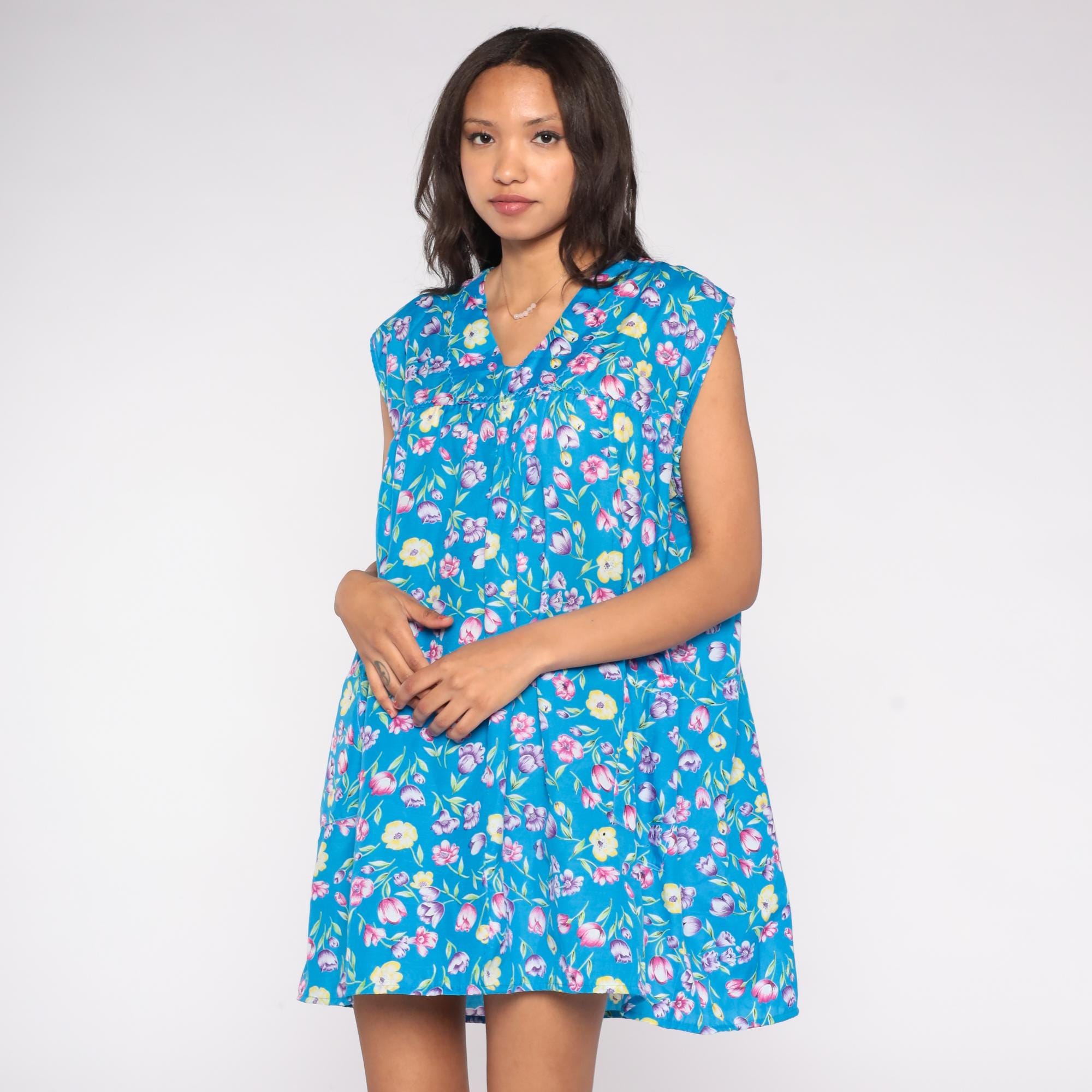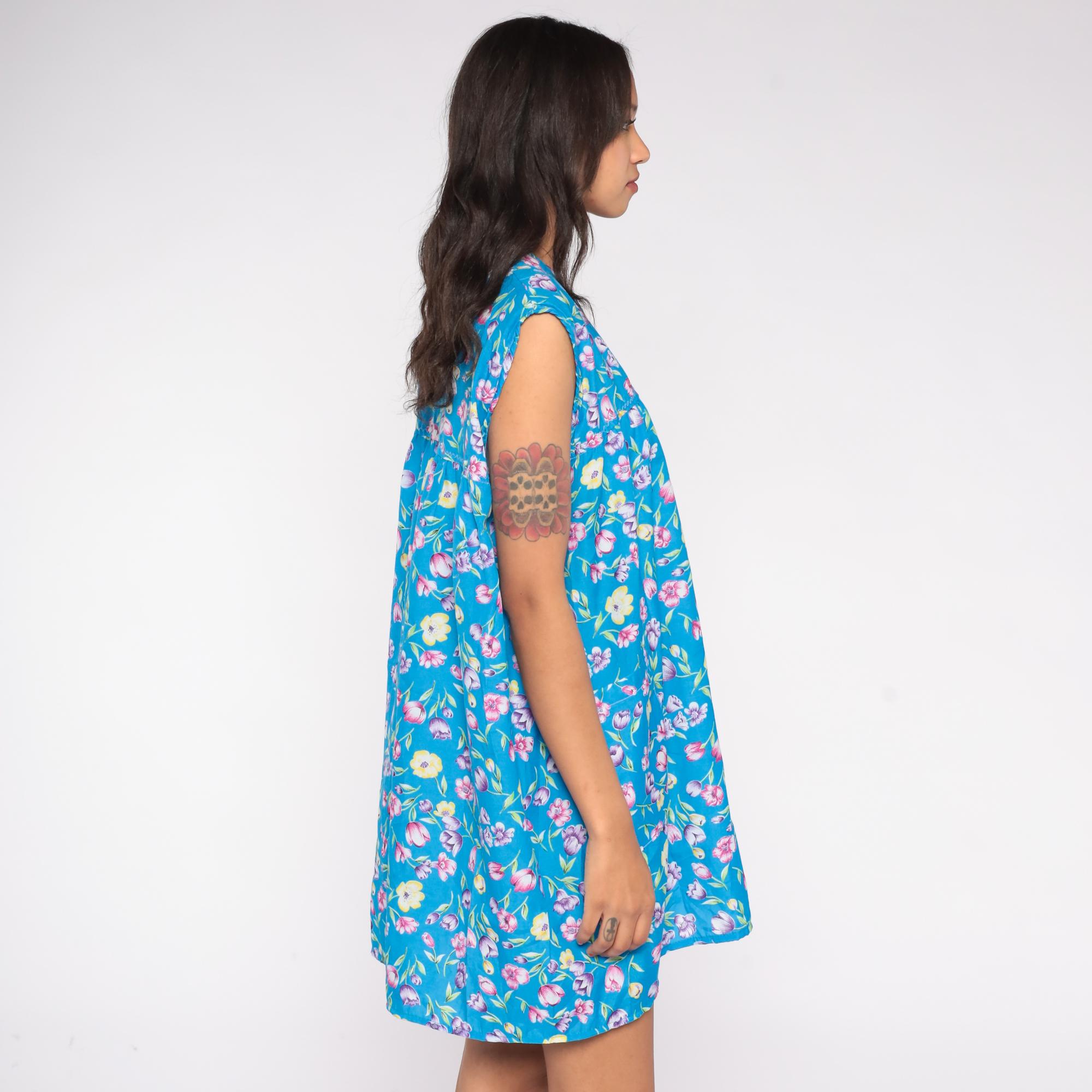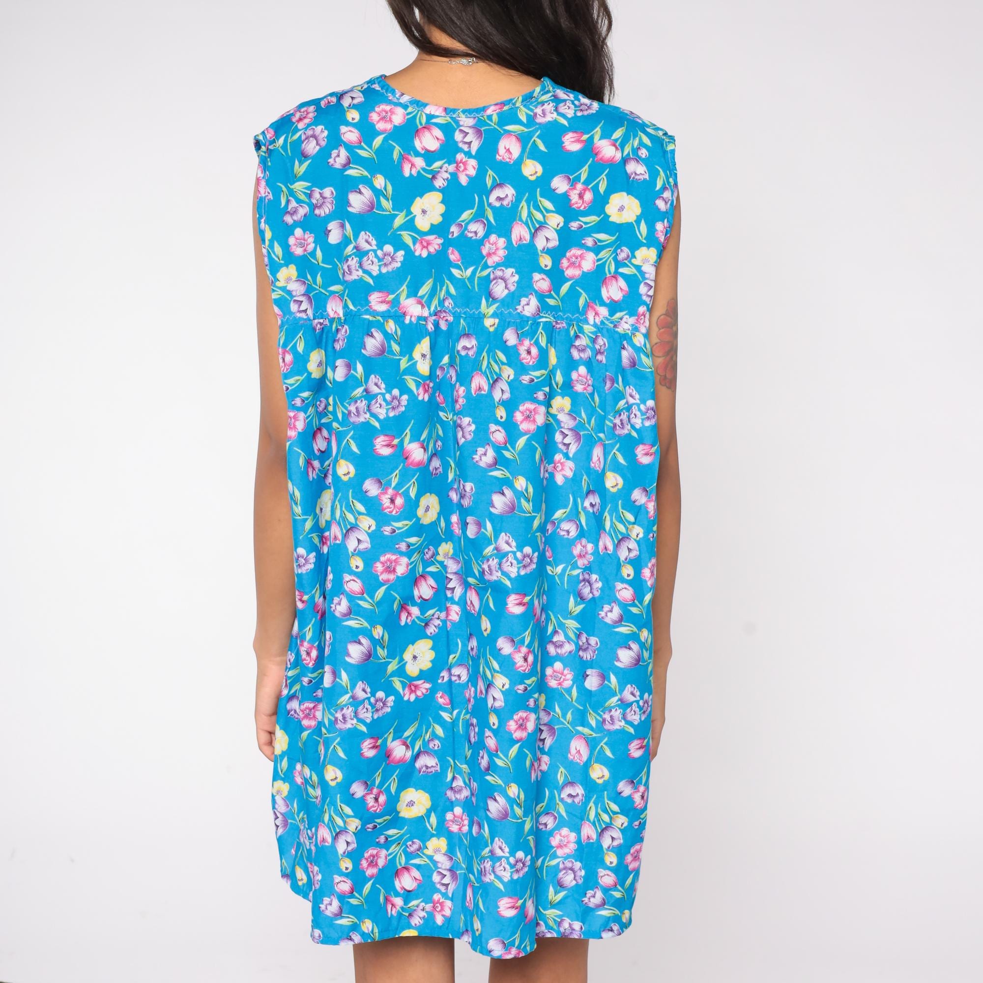 80s blue floral dress featuring an allover tulip and wildflower print in pink, yellow, and purple tones. Designed with a sleeveless cut, V neckline, and relaxed babydoll fit with soft pleats and roomy side pockets.