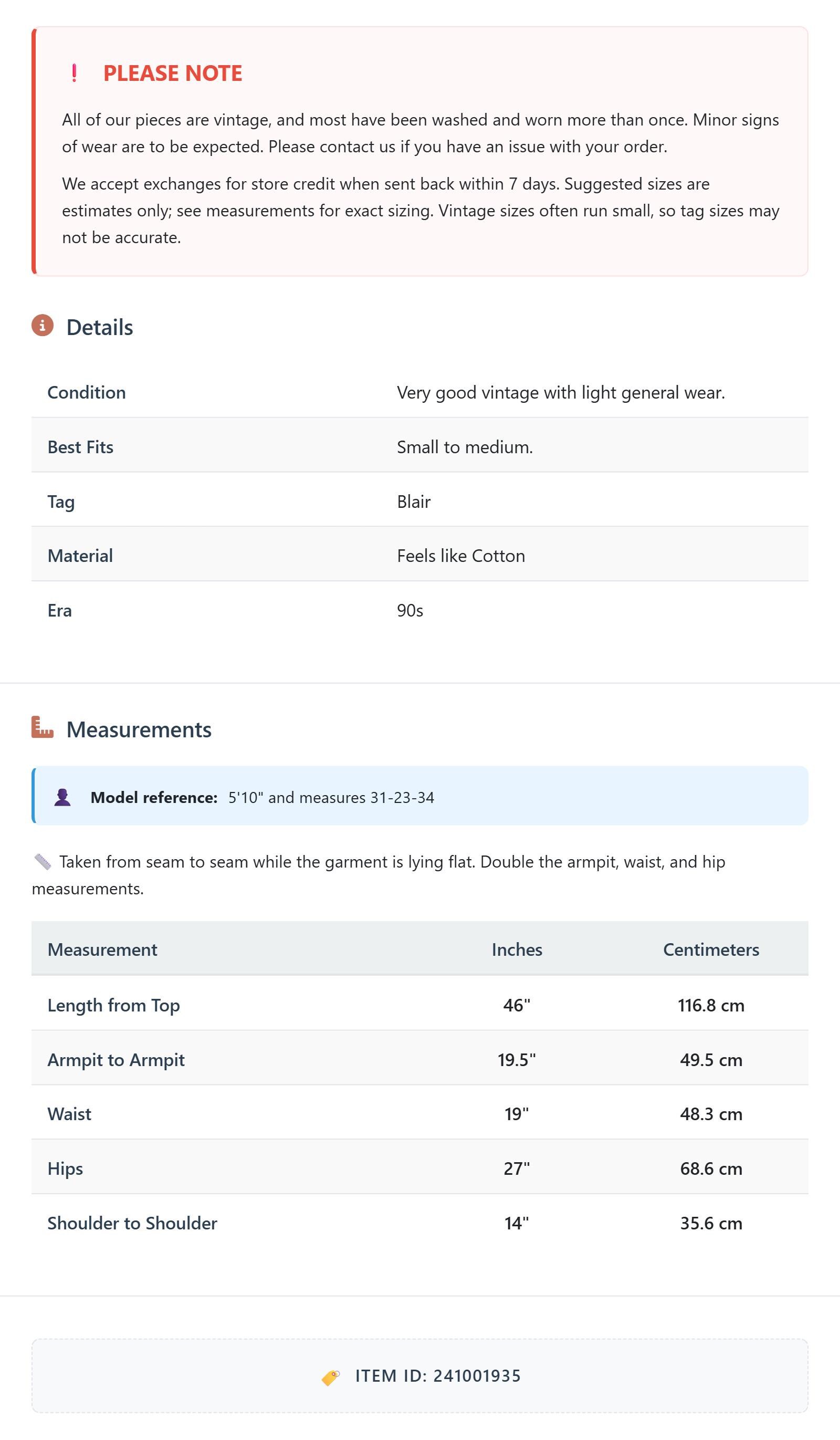 Suggested sizes are estimates only; see measurements for exact sizing. Vintage sizes often run small, so tag sizes may not be accurate.