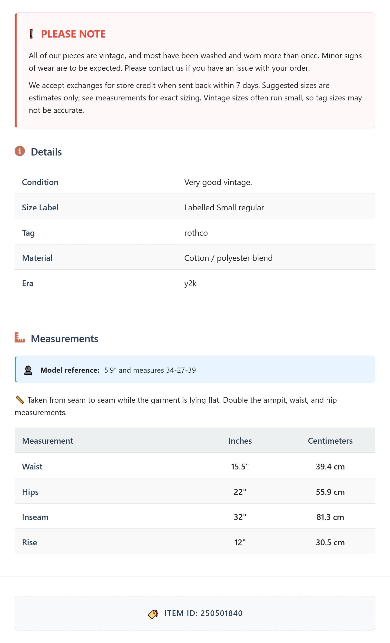 All of our pieces are vintage, and most have been washed and worn more than once. Minor signs of wear are to be expected. Please contact us if you have an issue with your order. We accept exchanges for store credit when sent back within 7 days.