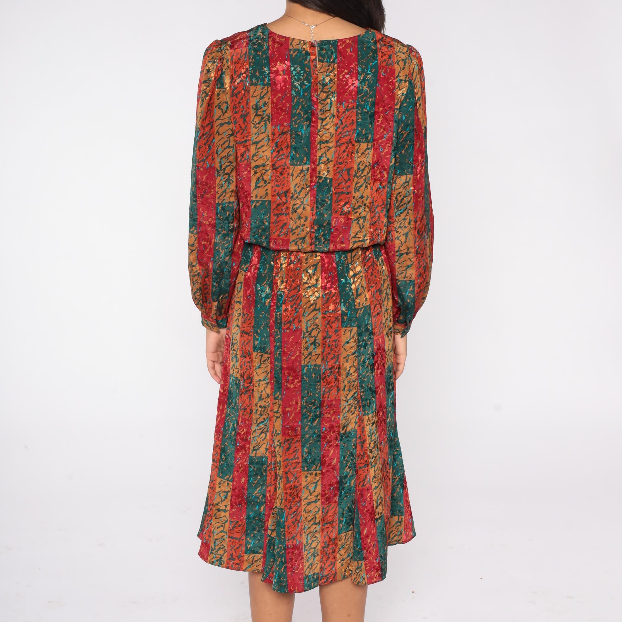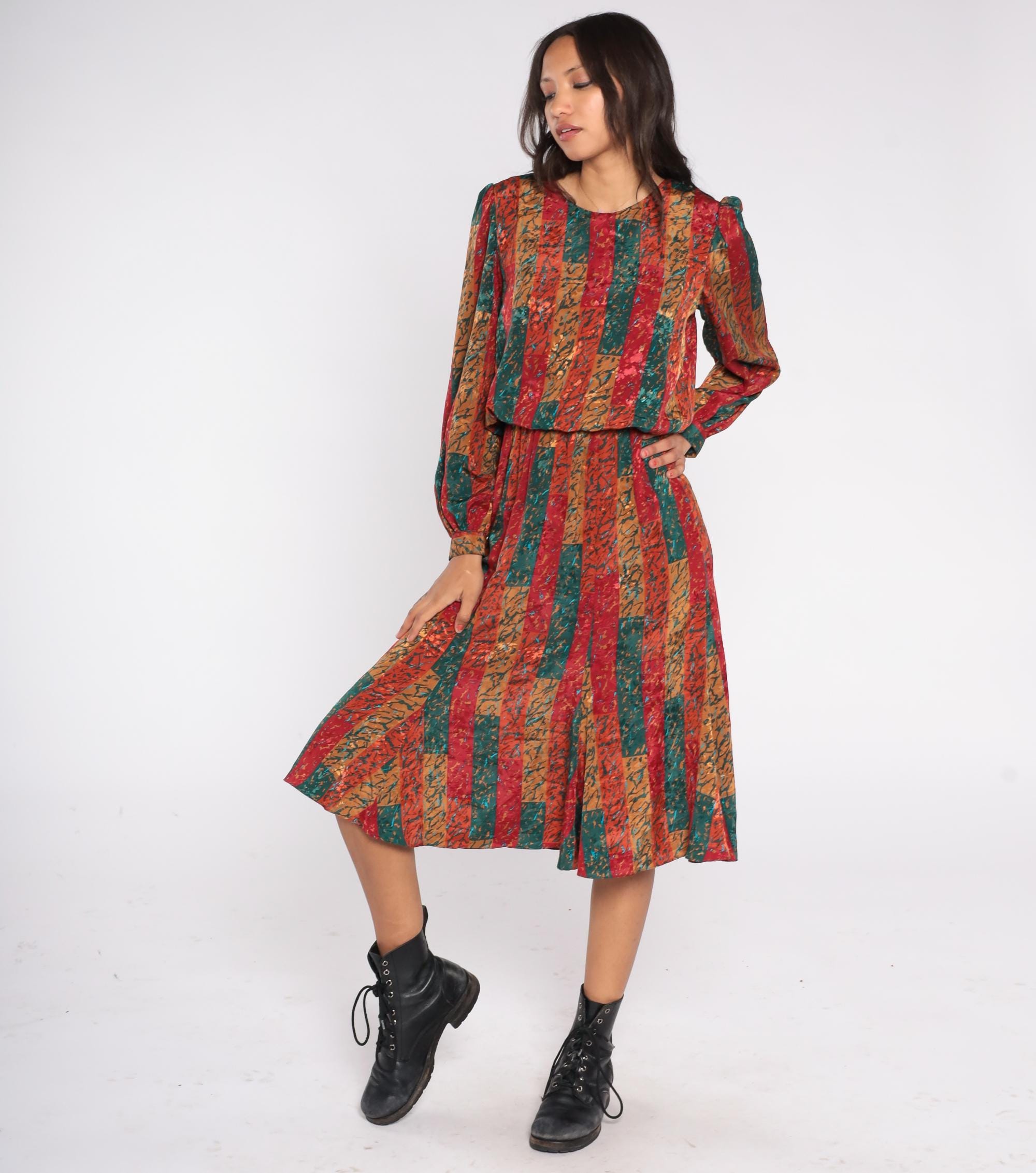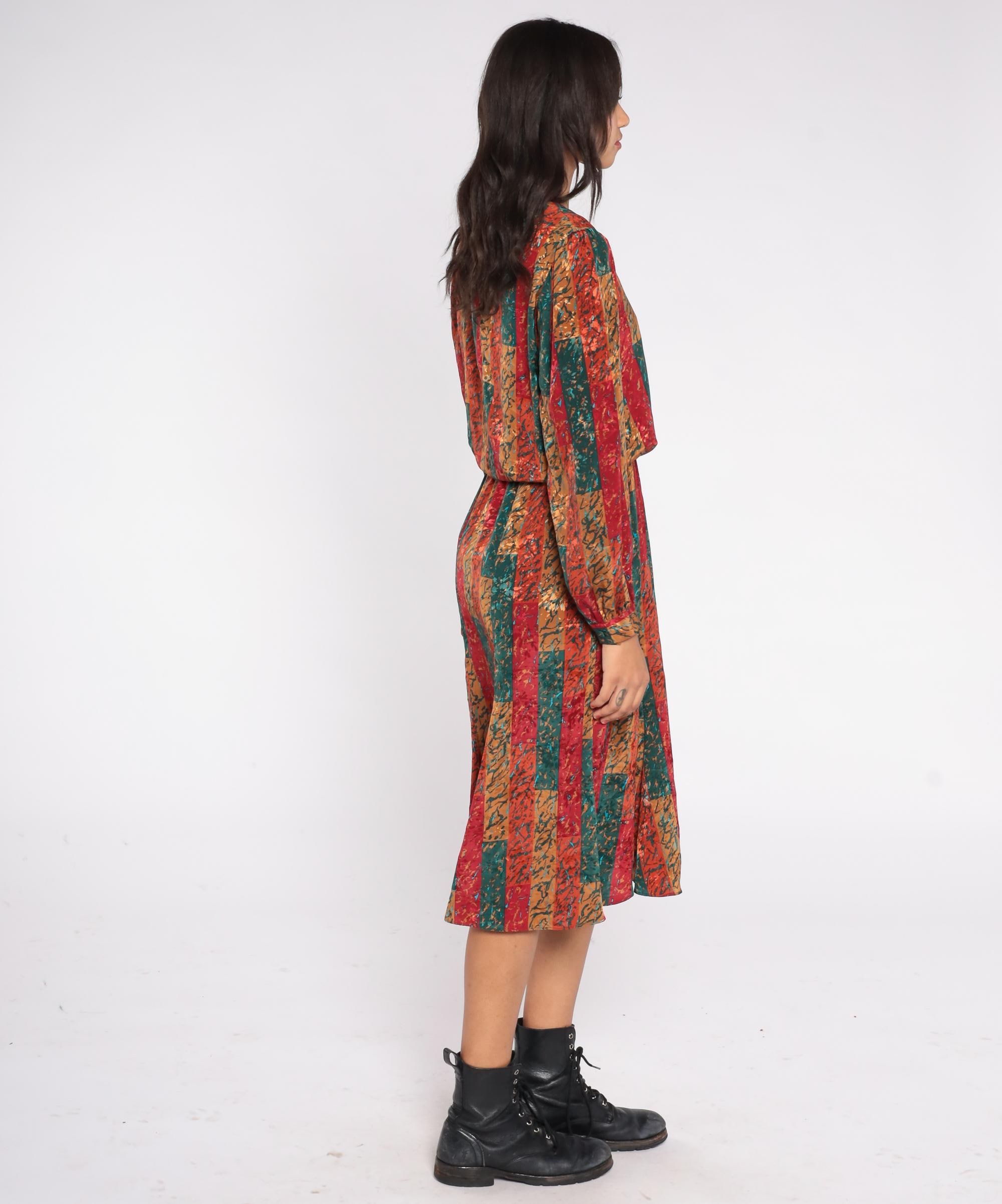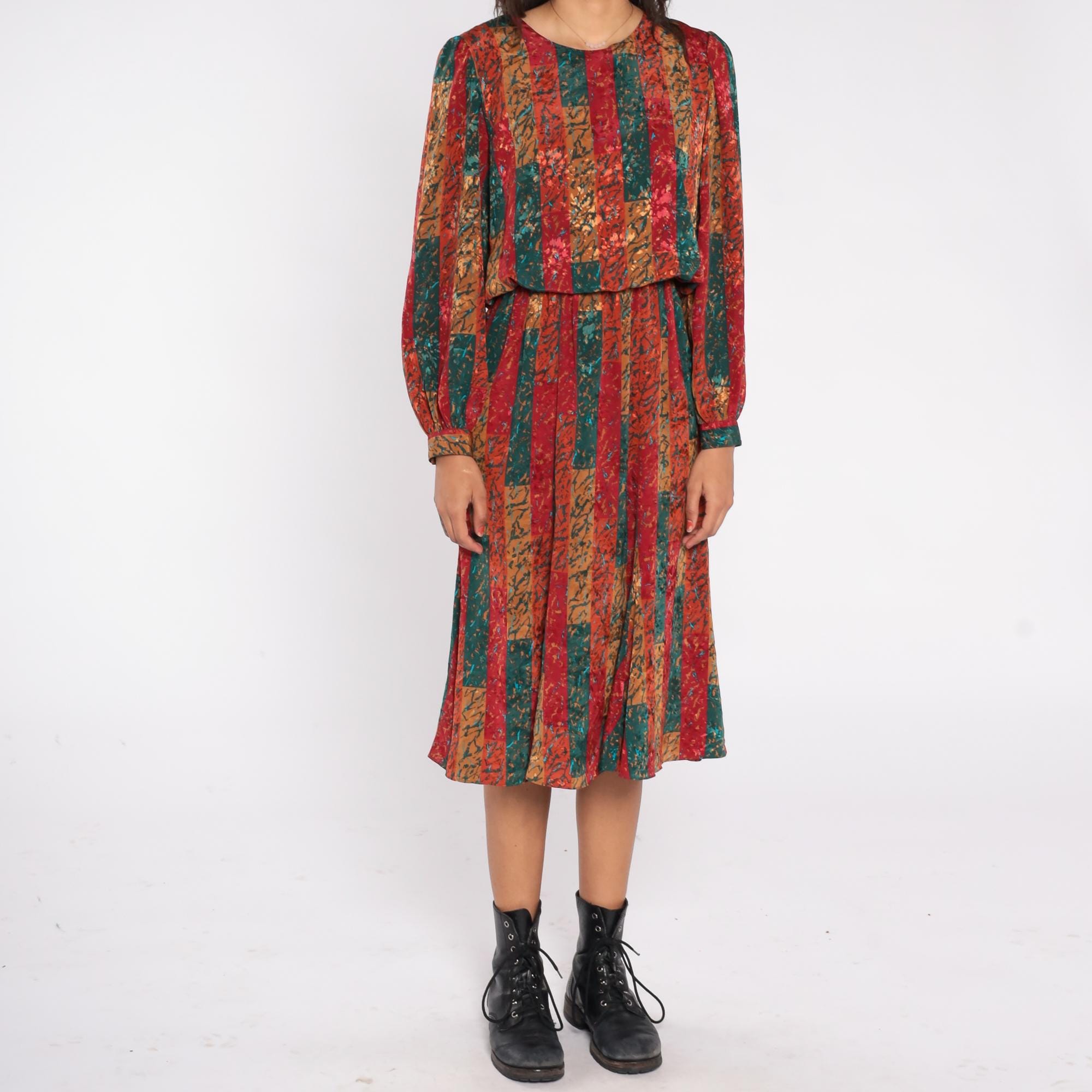 90s abstract print midi dress from Andrea Gayle. Features vertical colorblock striped pattern in jewel tones of rust orange, teal green, and burgundy red with abstract brush-stroke design. Blouson style with elastic waist and round neckline. Long sleeves with elastic cuffs.