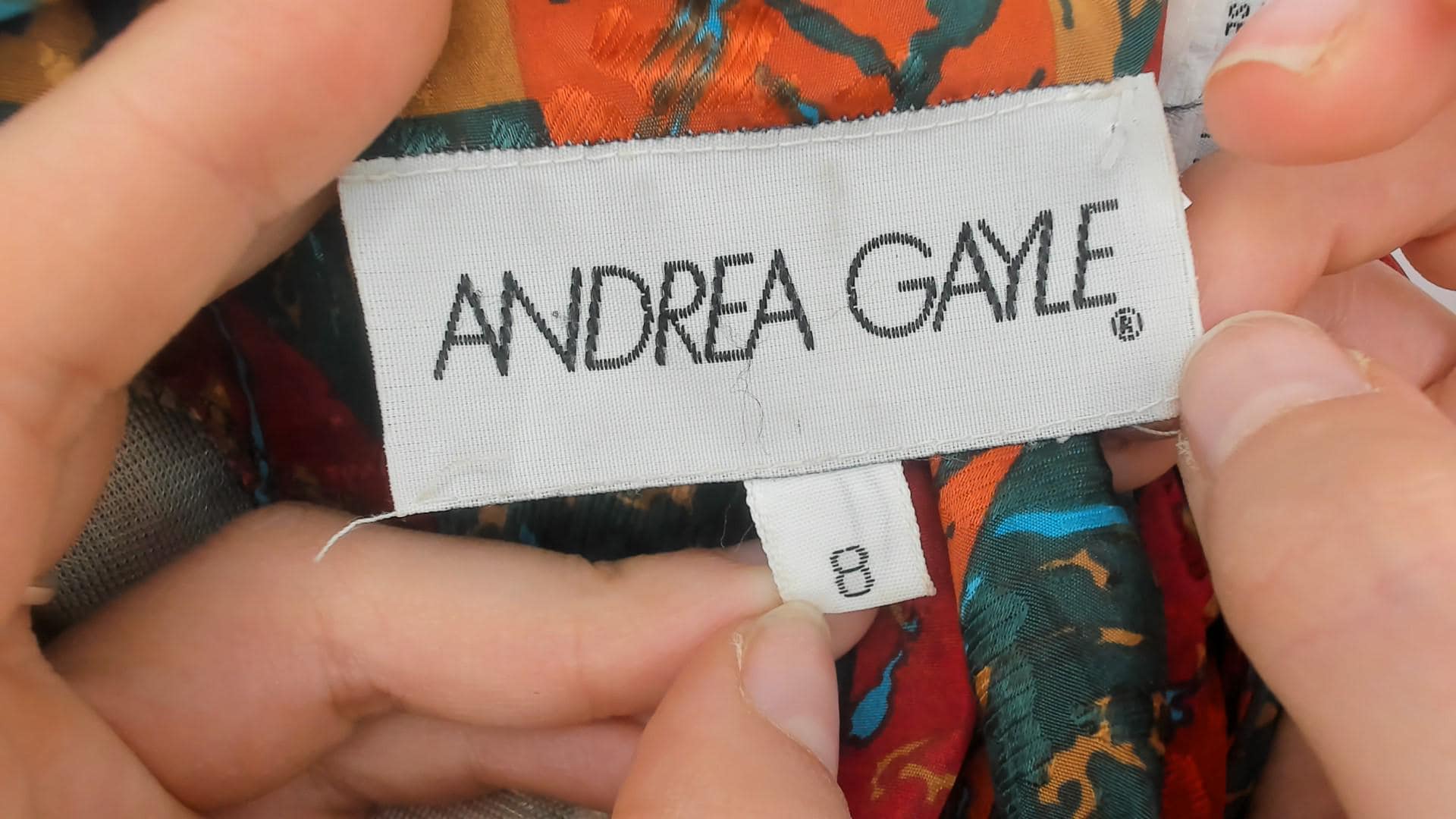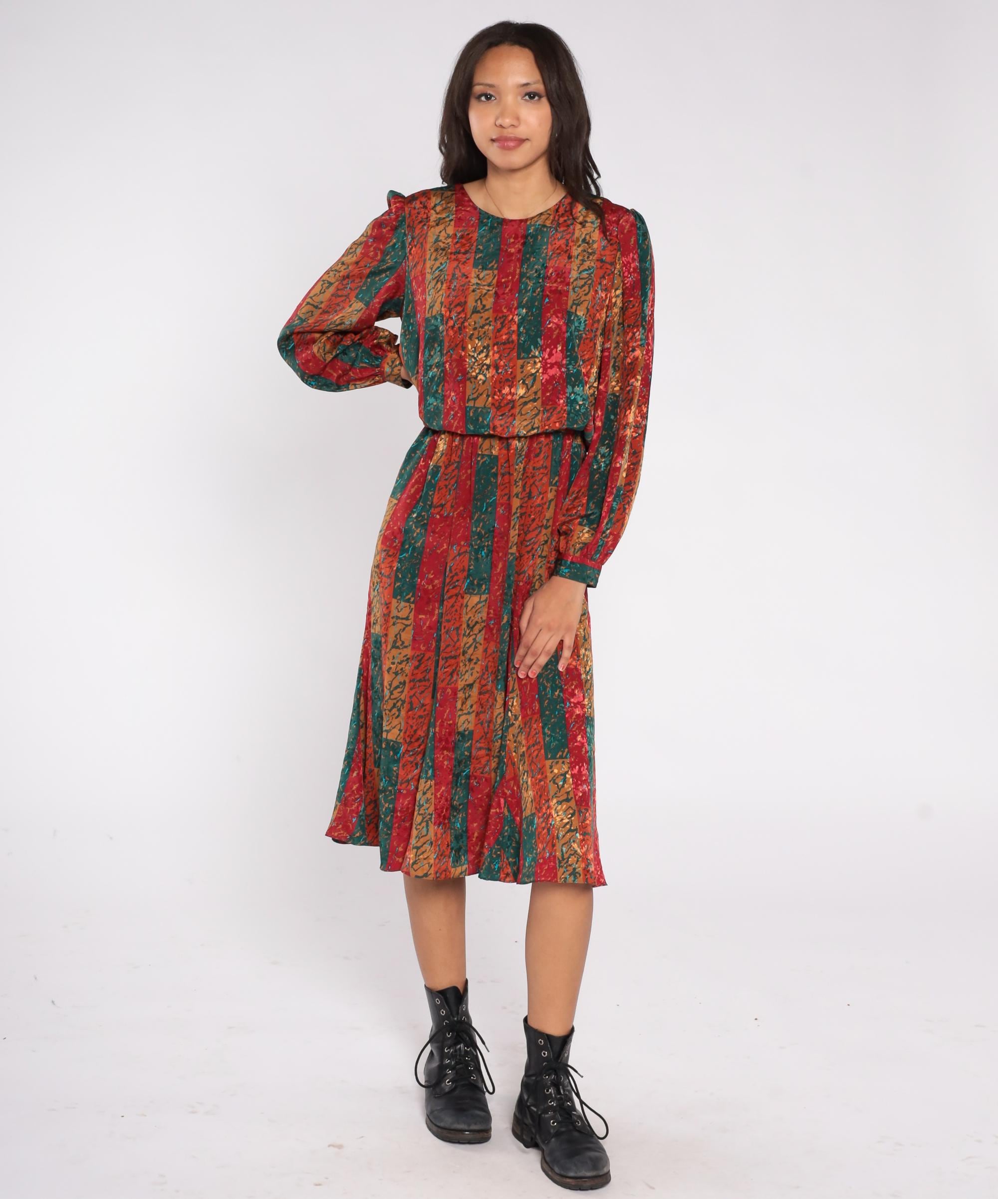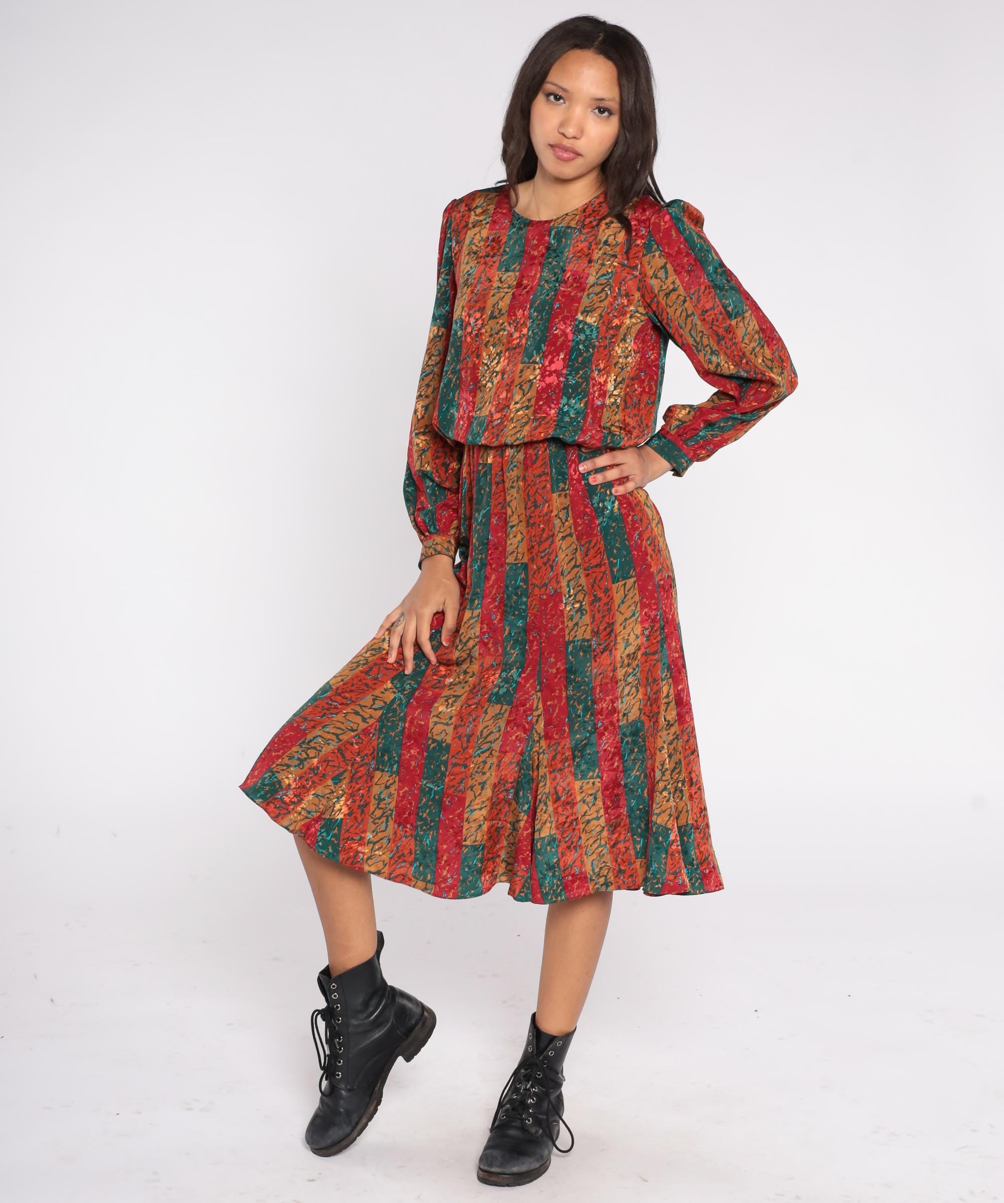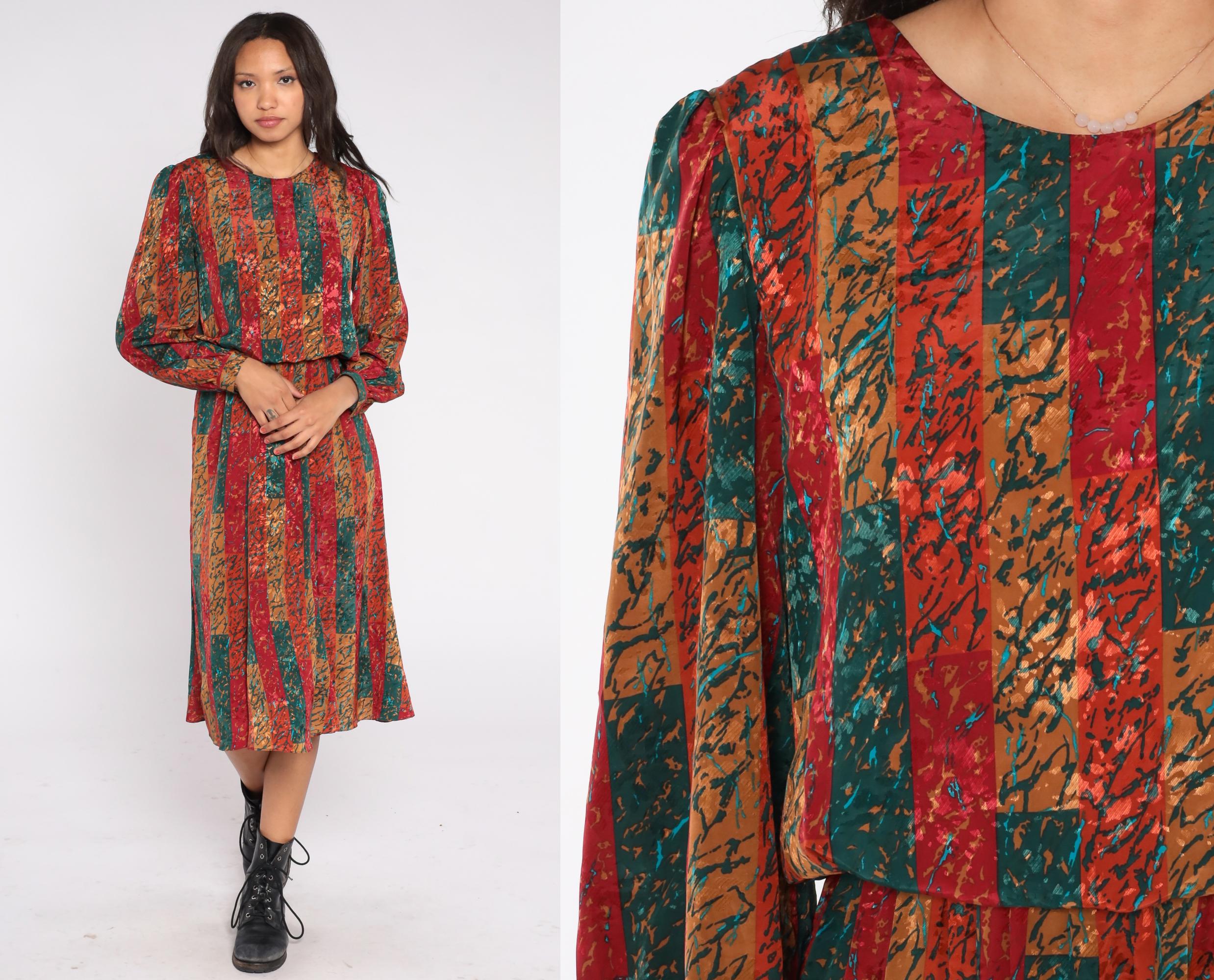 90s abstract print midi dress from Andrea Gayle. Features vertical colorblock striped pattern in jewel tones of rust orange, teal green, and burgundy red with abstract brush-stroke design. Blouson style with elastic waist and round neckline. Long sleeves with elastic cuffs.
