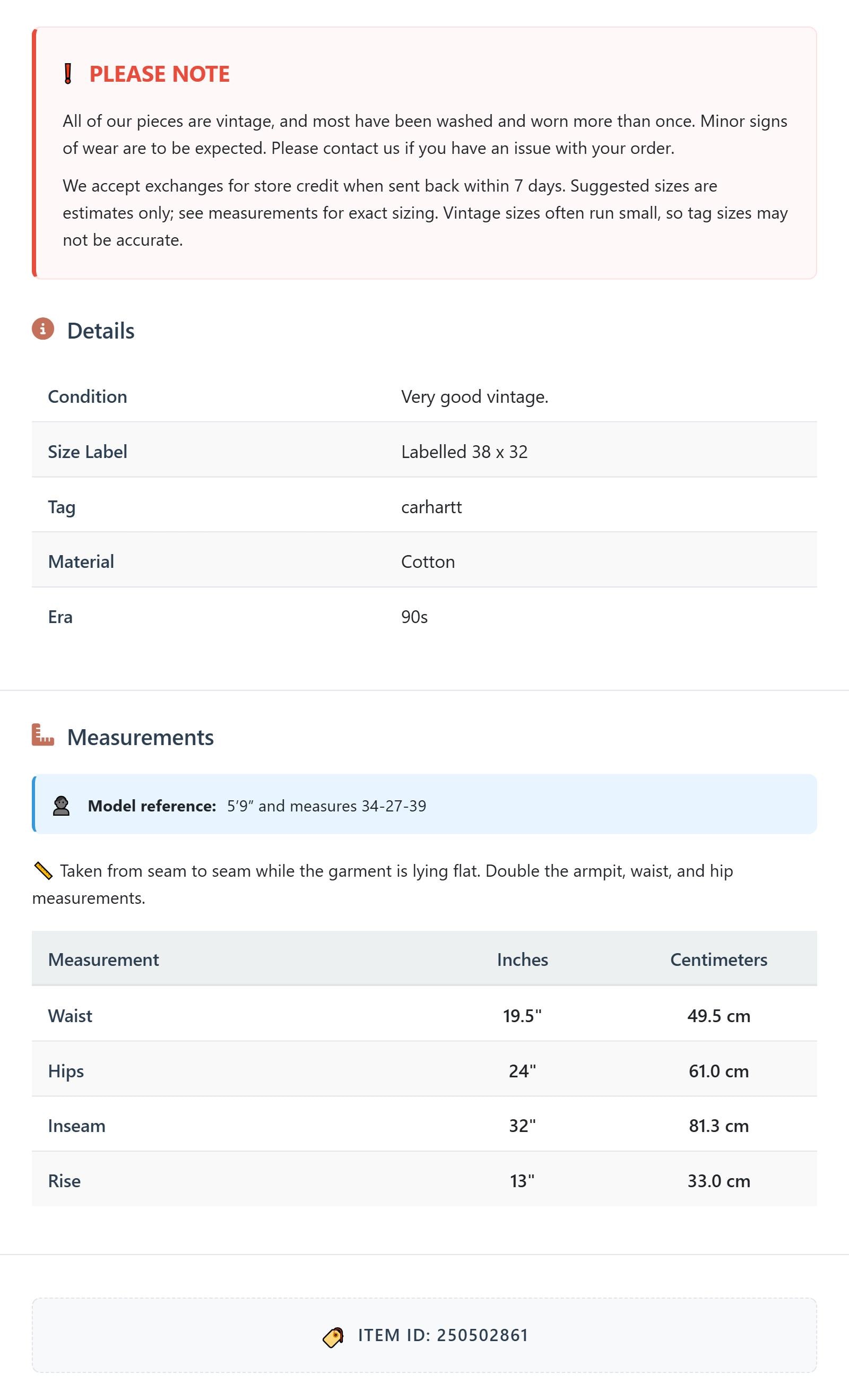 Vintage denim was usually made without any stretch, unlike modern jeans. Check the measurements to ensure proper fit, and remember to give yourself a little wiggle room in the waist and hips, depending on your preferred fit.