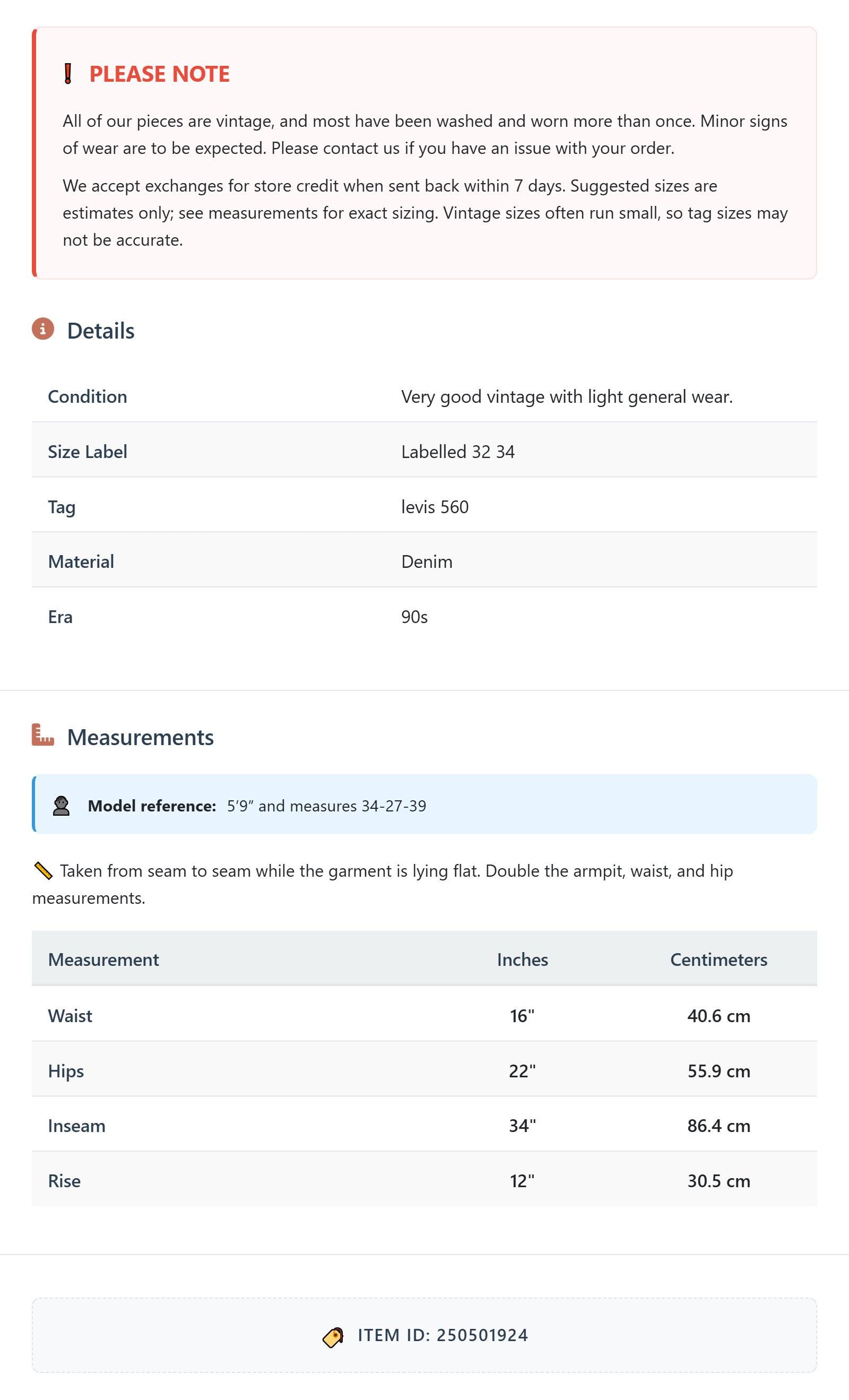 Vintage denim was usually made without any stretch, unlike modern jeans. Check the measurements to ensure proper fit, and remember to give yourself a little wiggle room in the waist and hips, depending on your preferred fit.