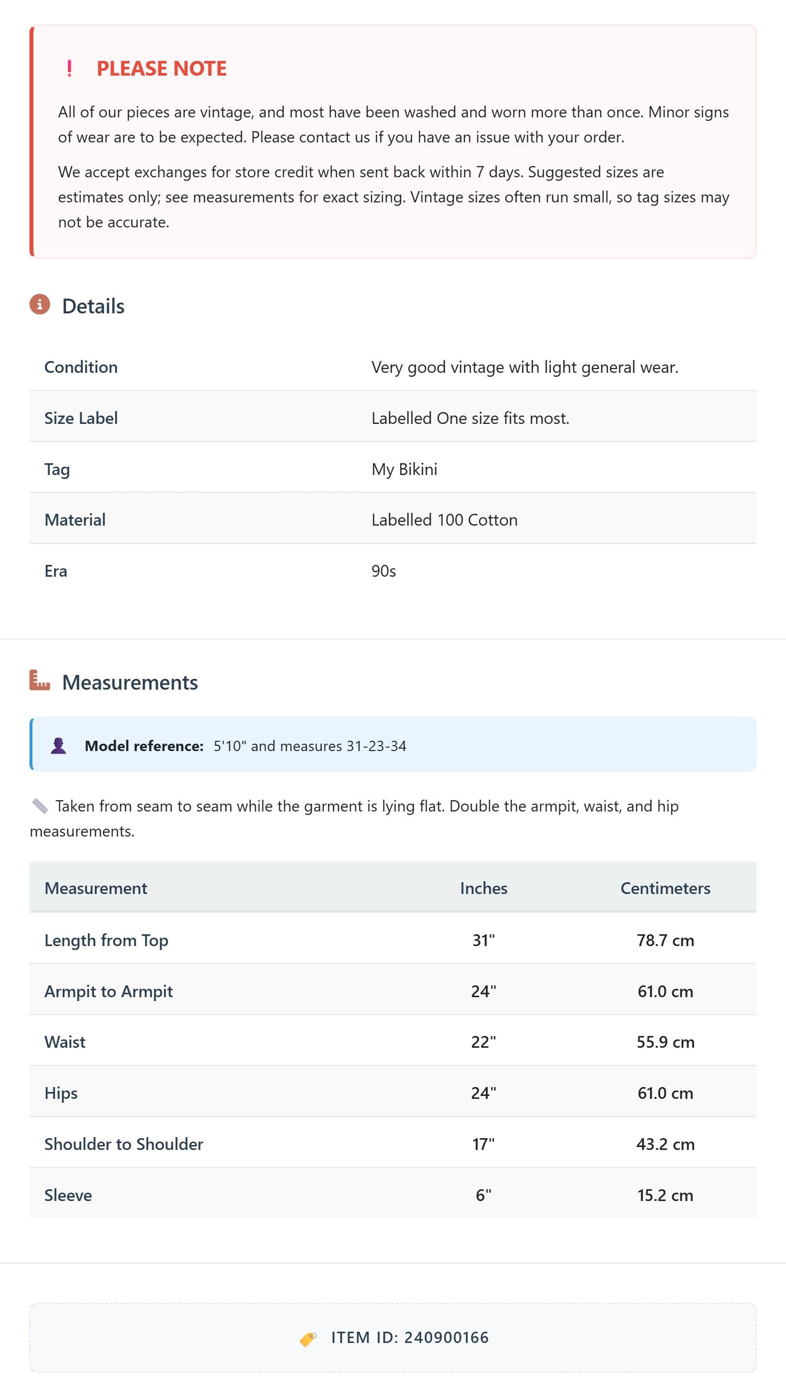 All of our pieces are vintage, and most have been washed and worn more than once. Minor signs of wear are to be expected. Please contact us if you have an issue with your order. We accept exchanges for store credit when sent back within 7 days.