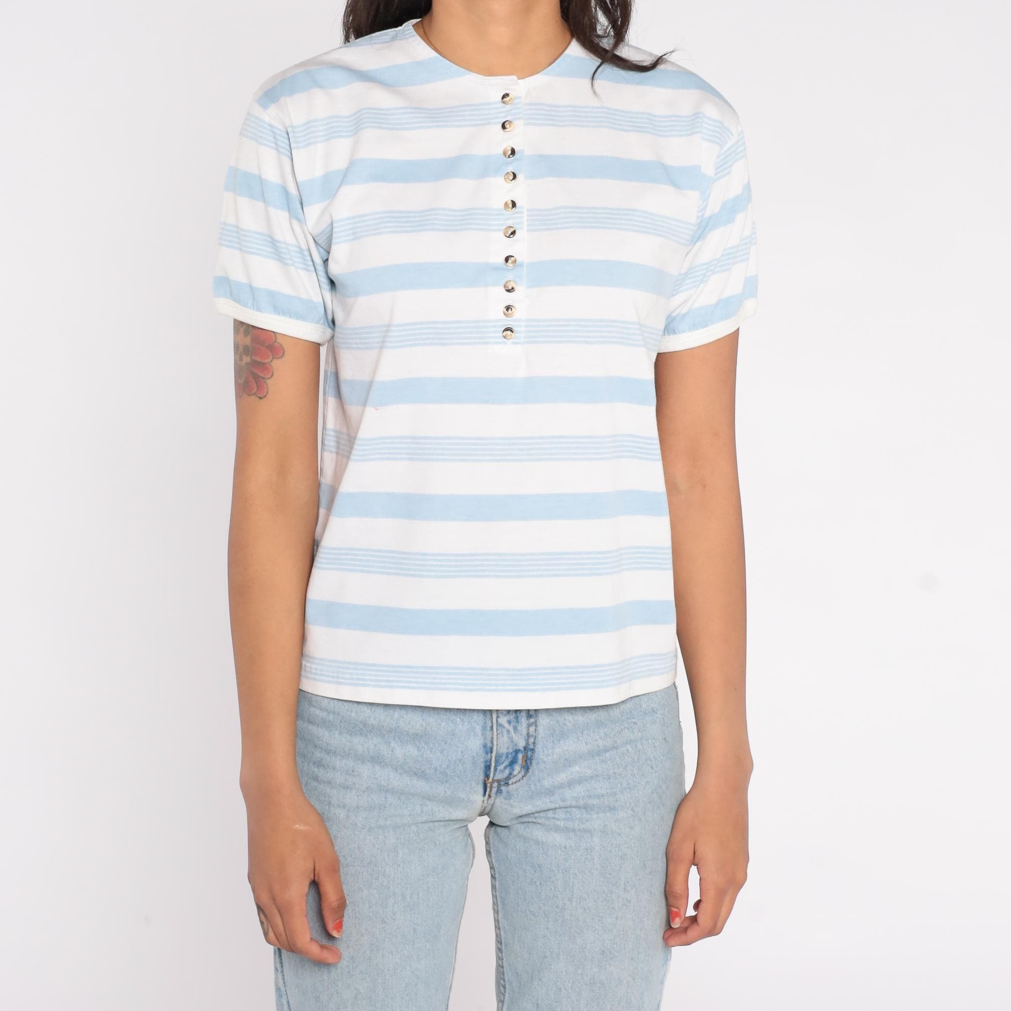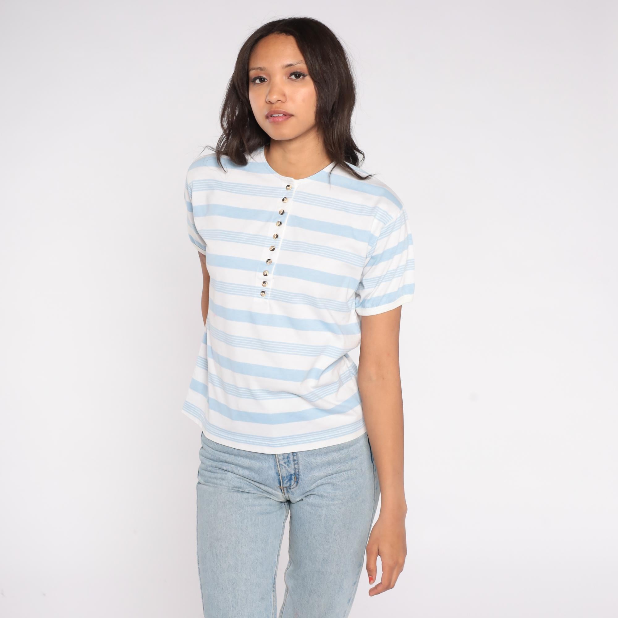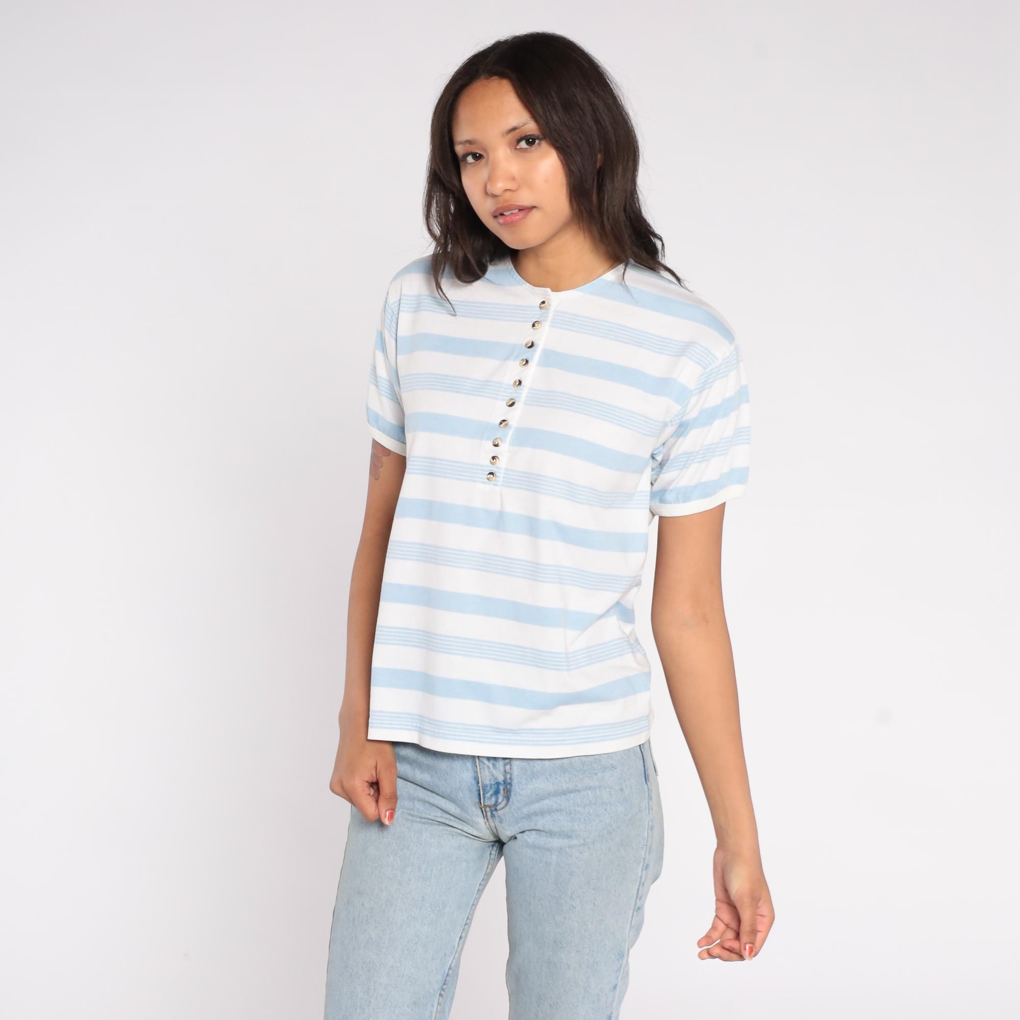 90s blue and white striped henley top from Contemporary Casuals. Features horizontal stripe pattern in pastel baby blue and white with vertical multi-stripe detail. Button front placket with 10 buttons. Short sleeves with classic crewneck.